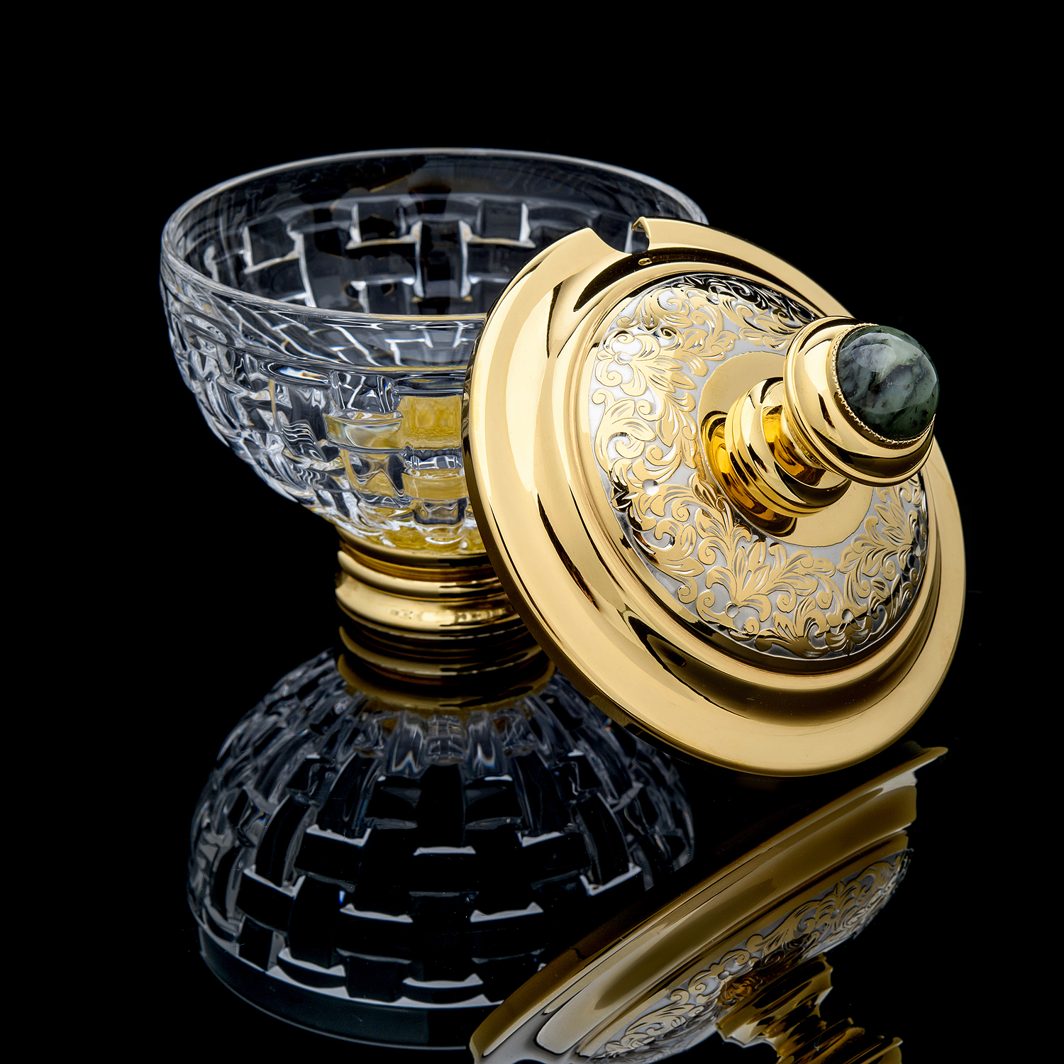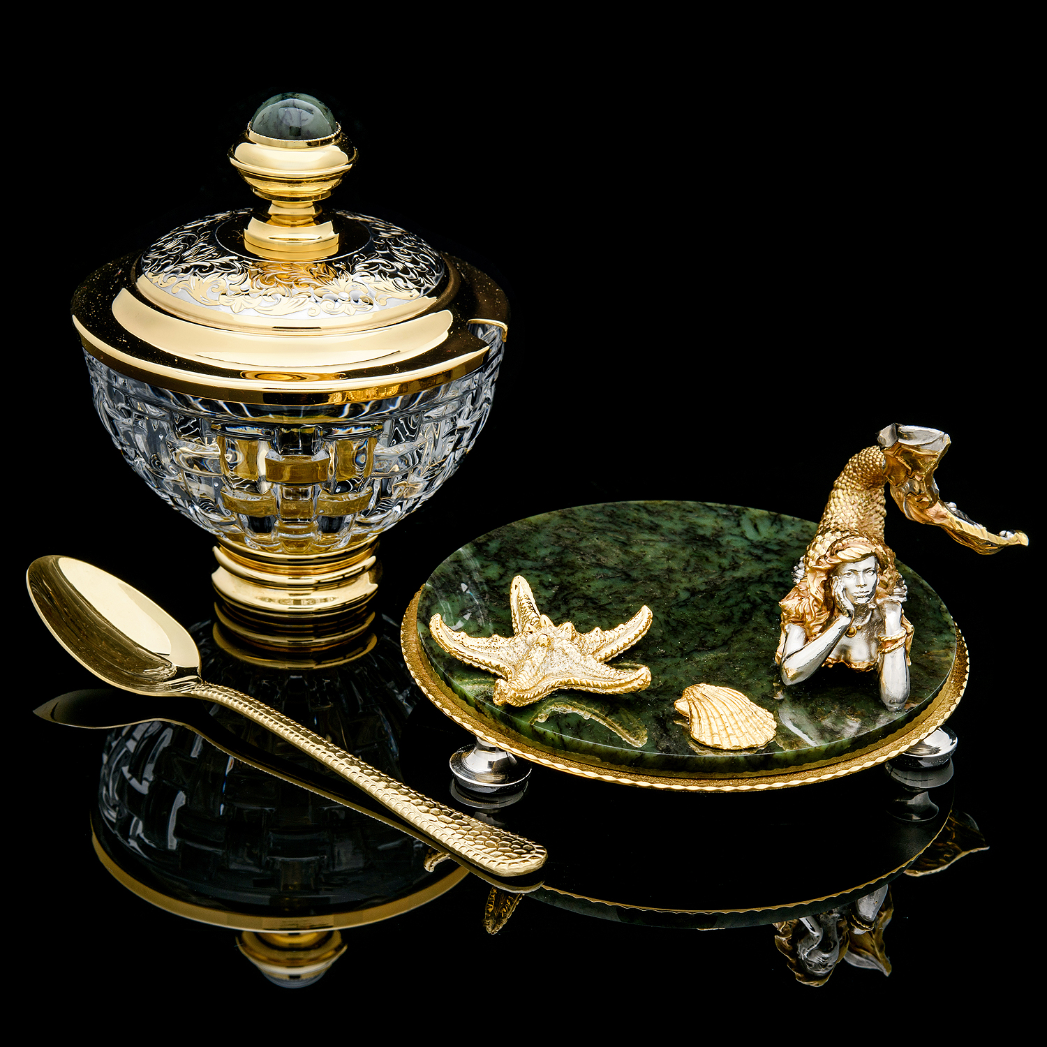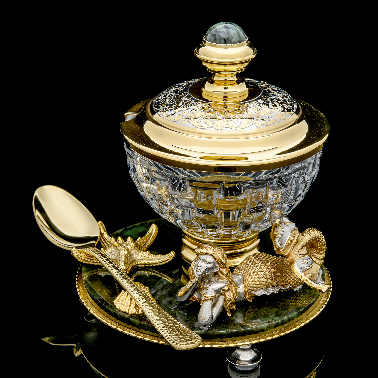 Икорница "Русалка". Златоуст.Материалы: латунь, никель, золото 999,9*, хрусталь, нефрит.
