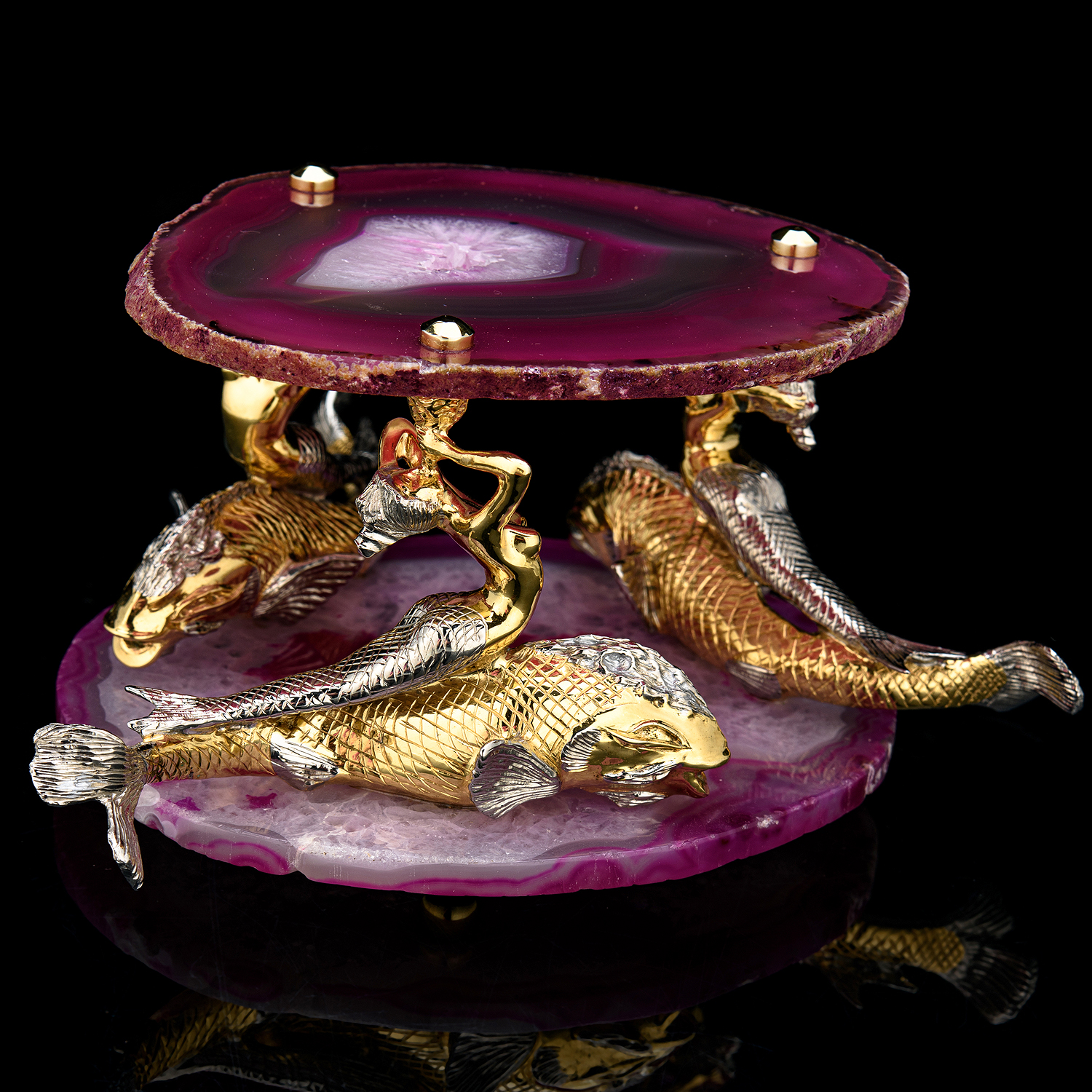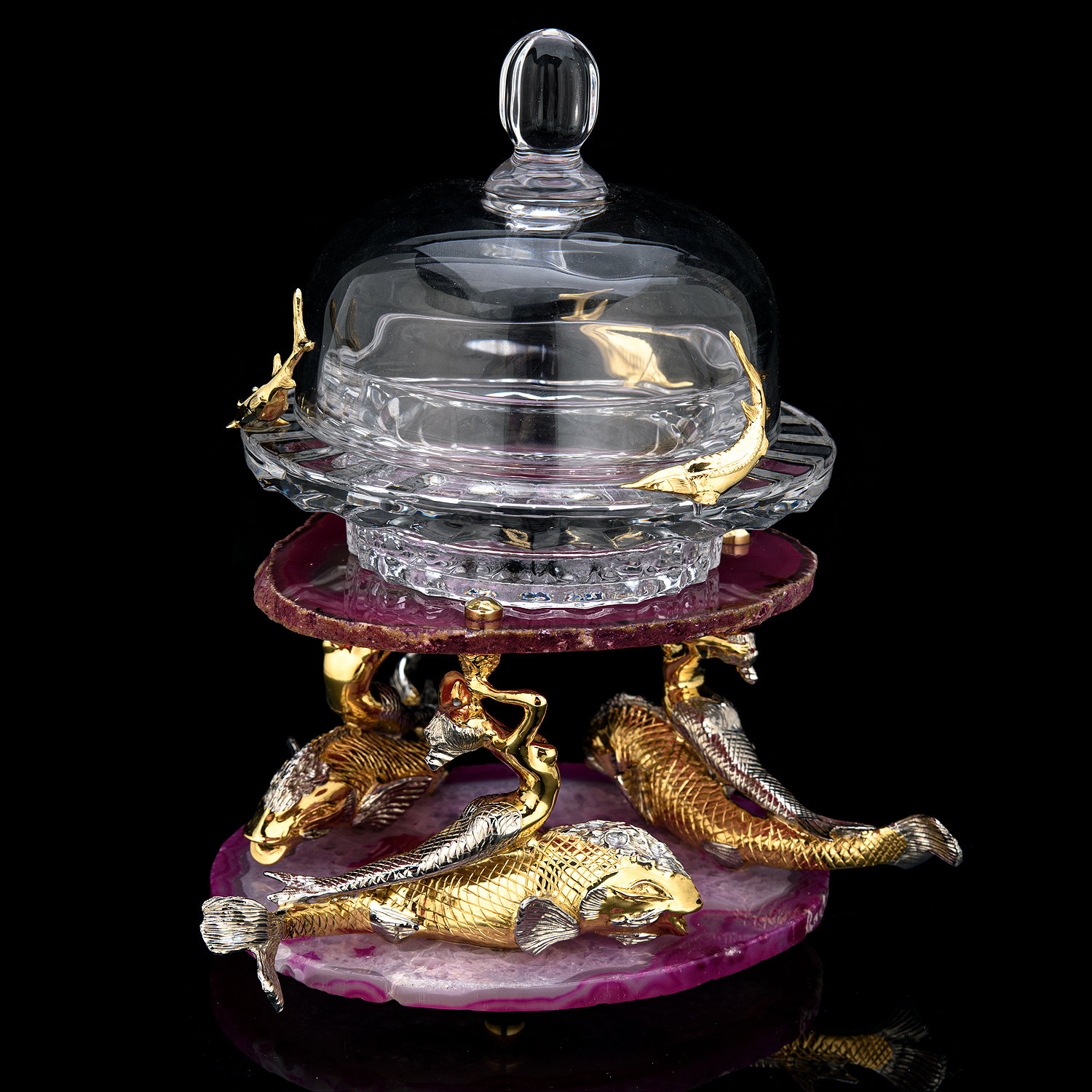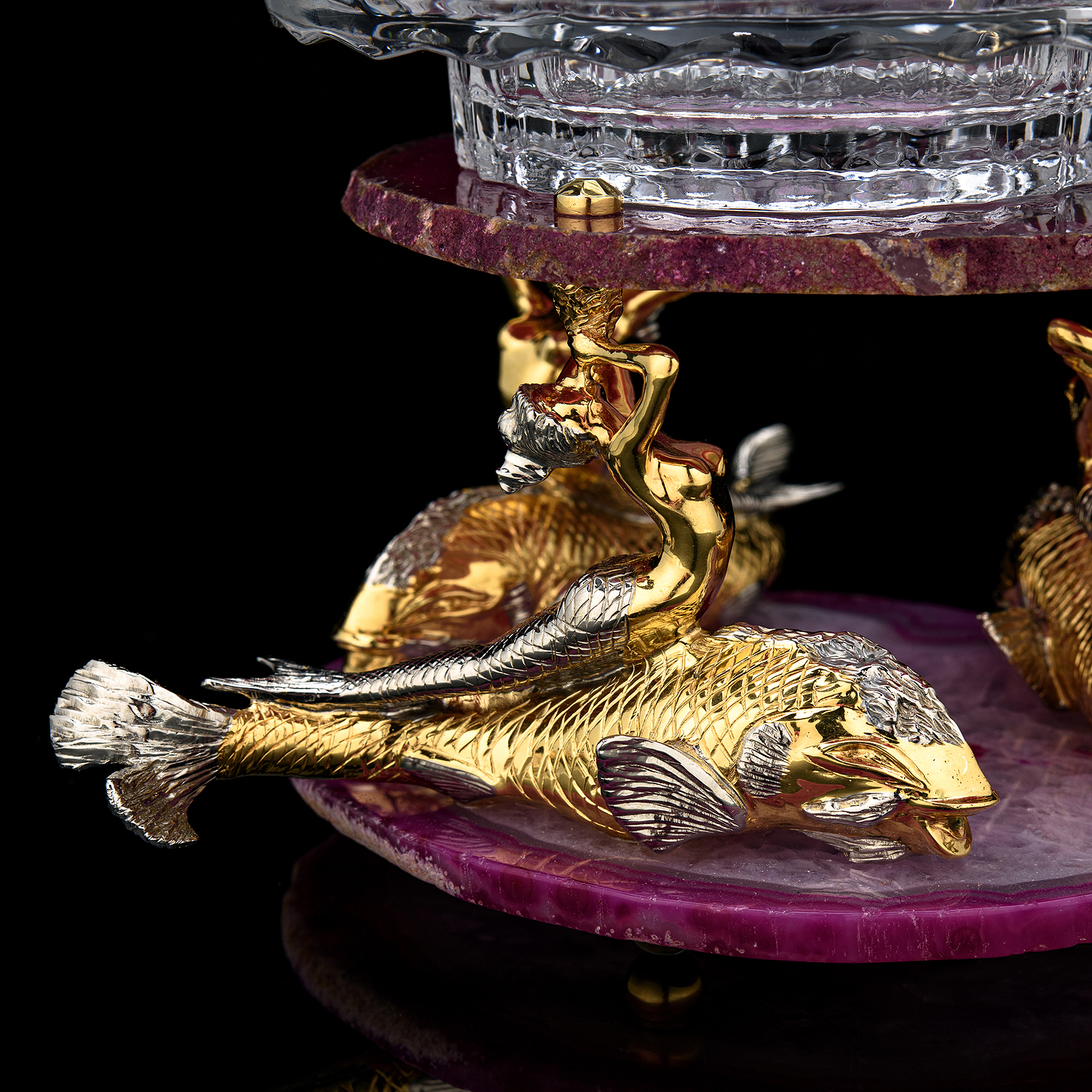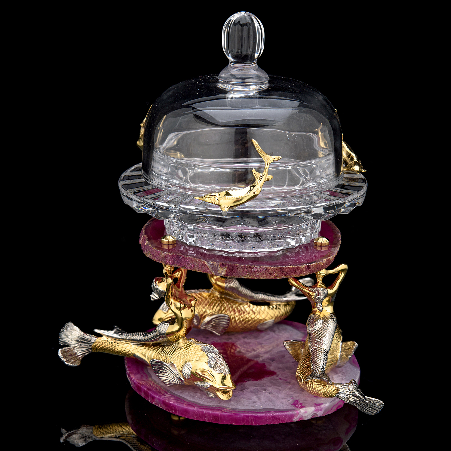 Икорница "Морская". Златоуст.Материалы: бронза, никель, золото 999,9*, стекло, розовый агат.