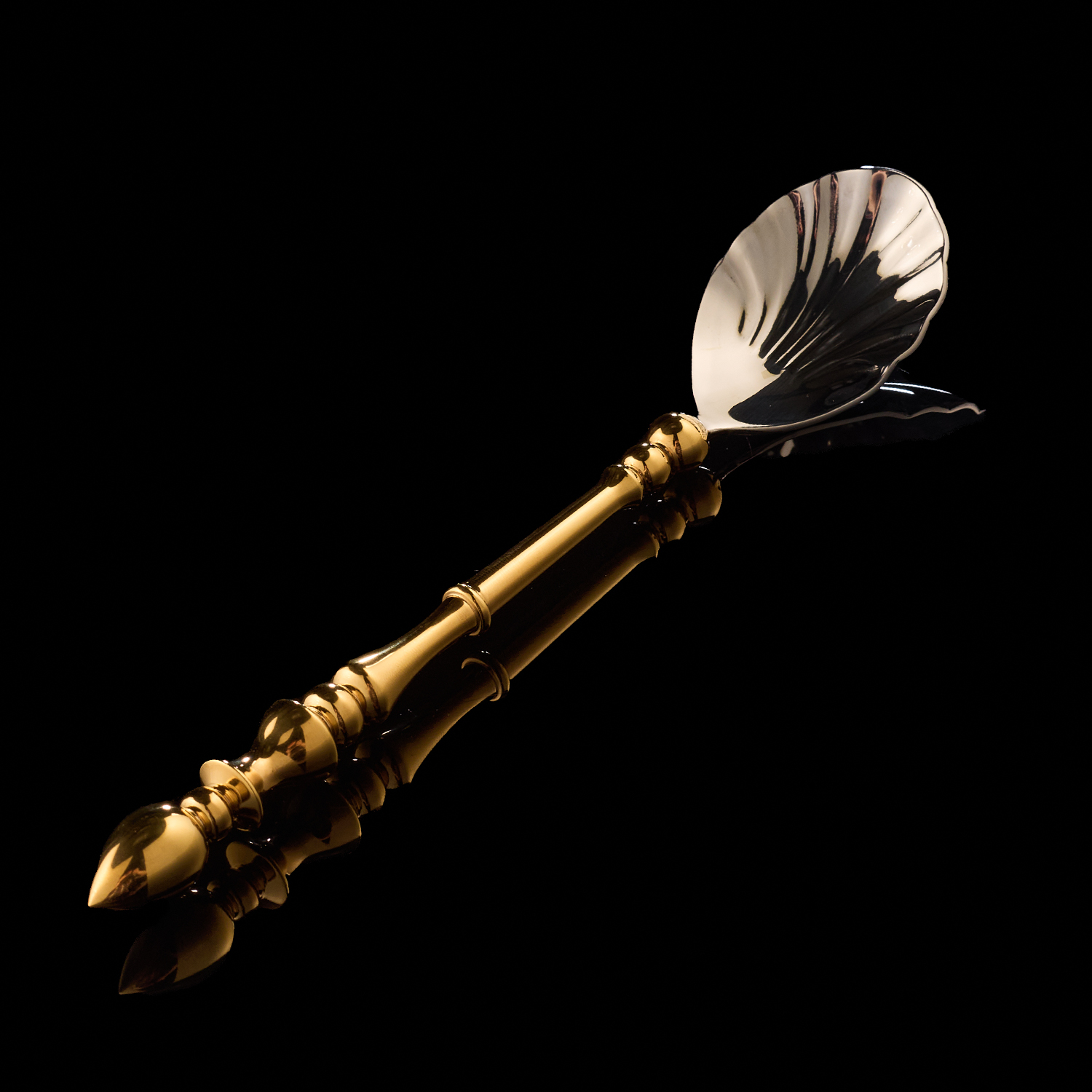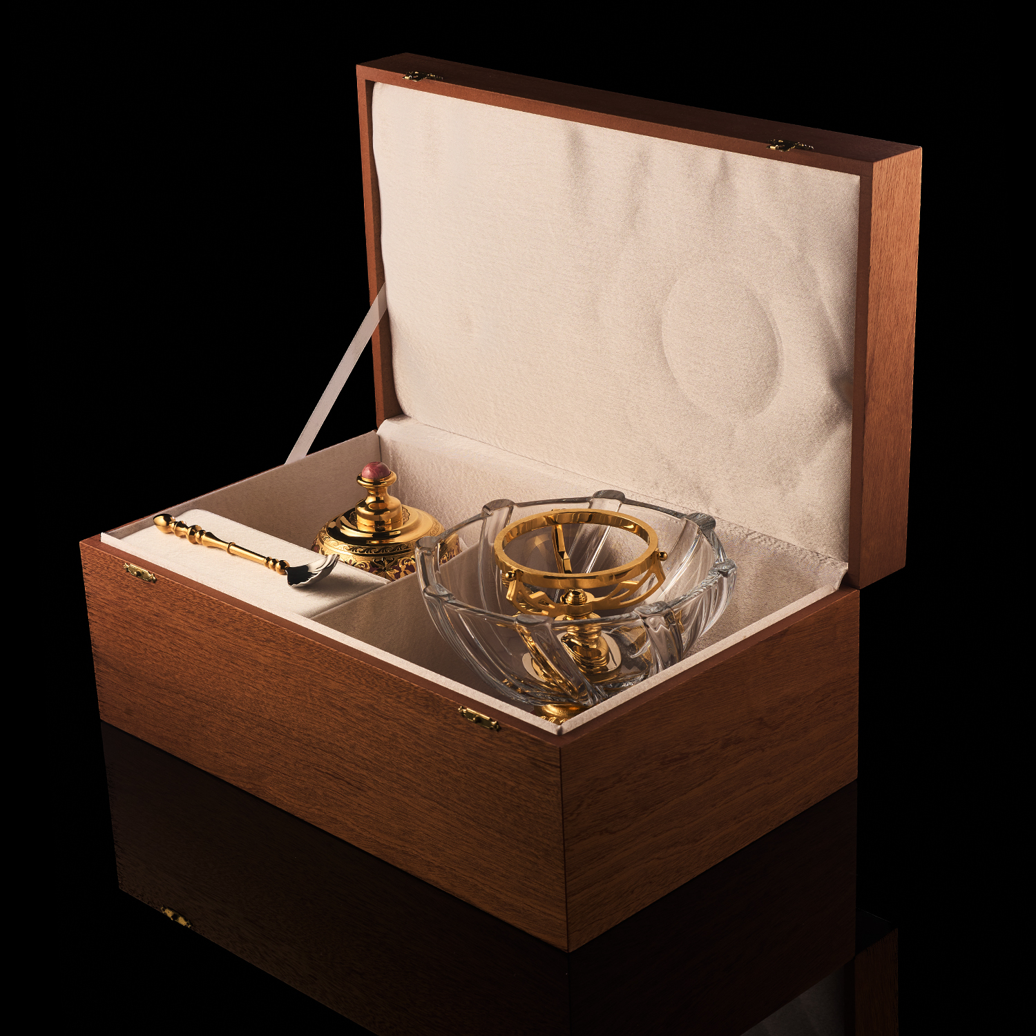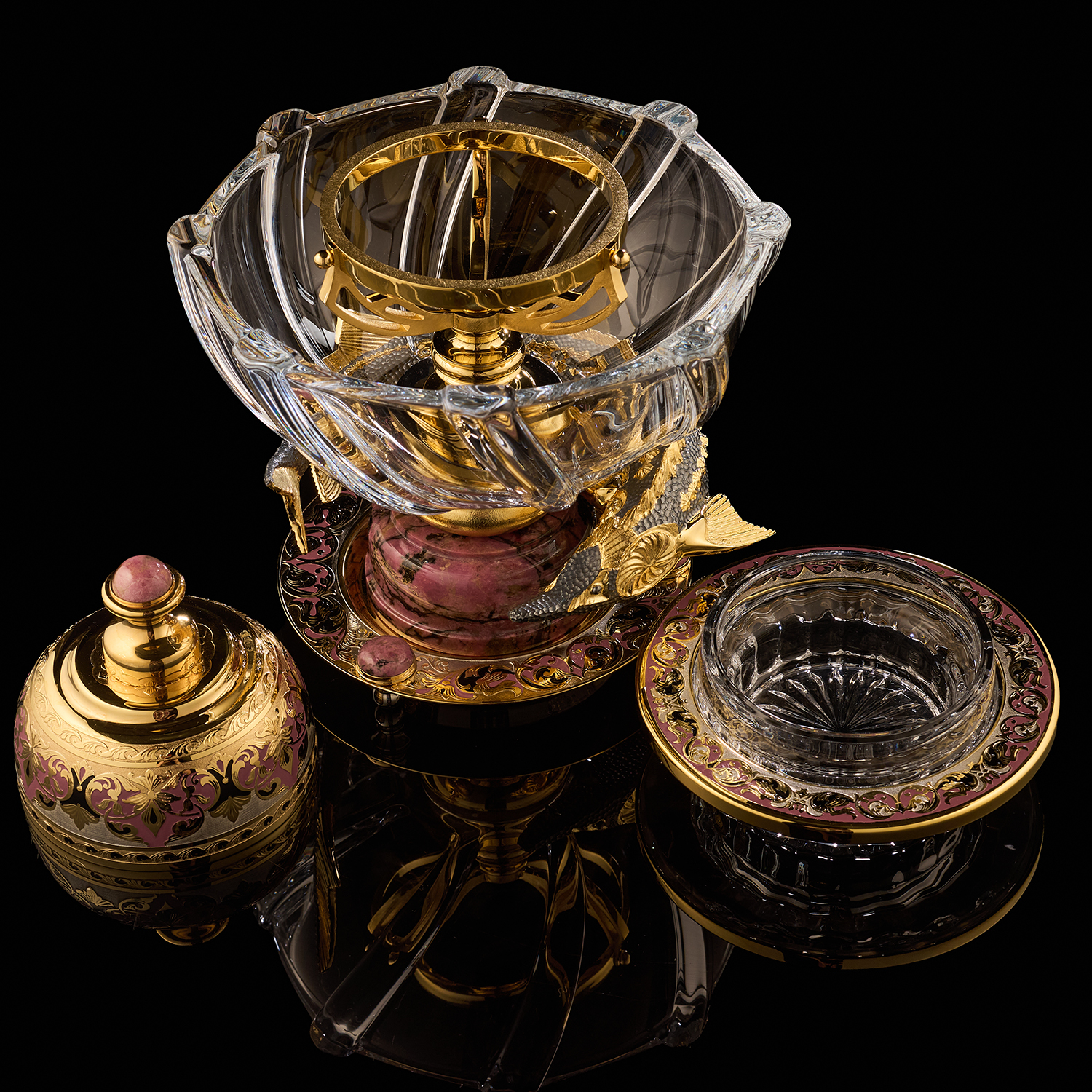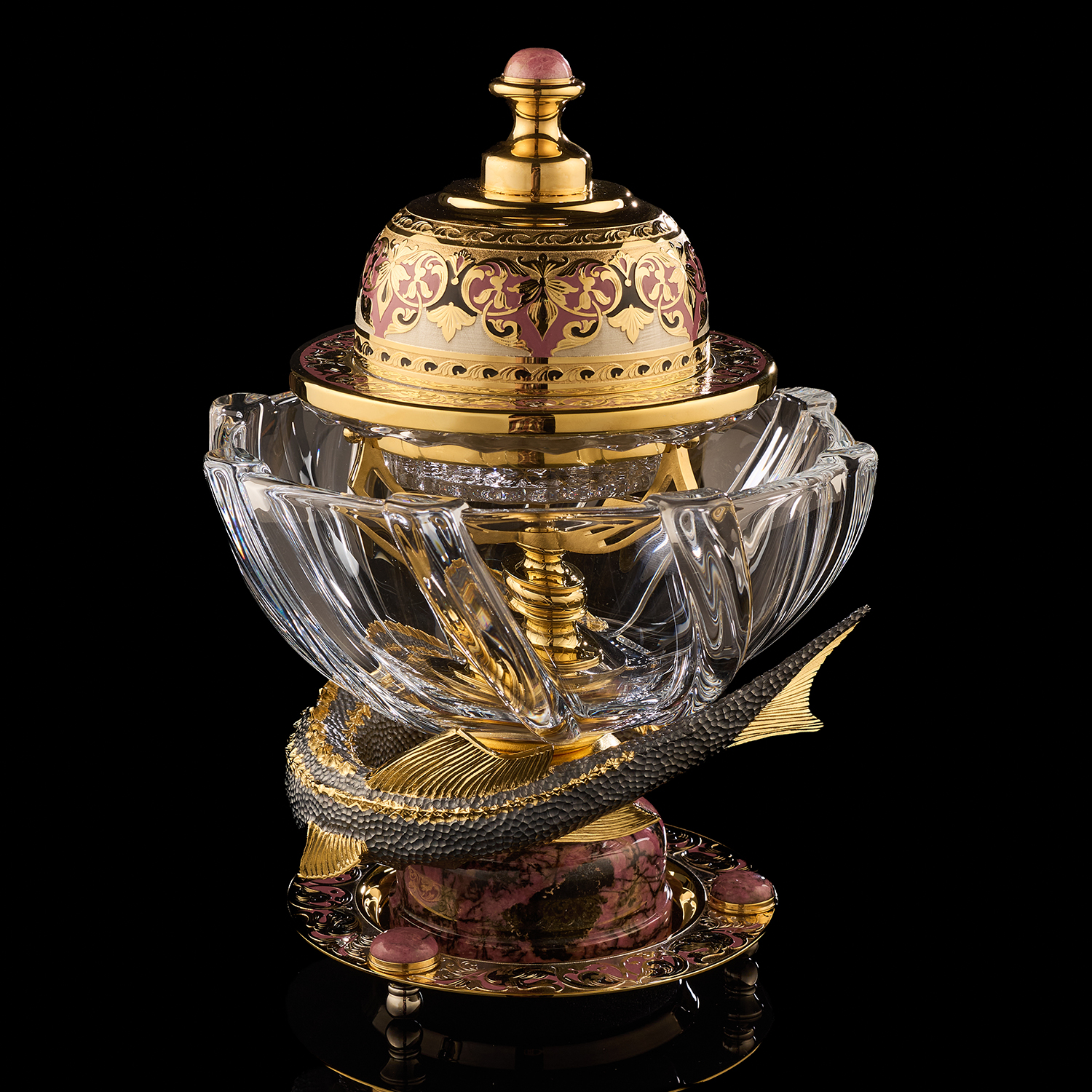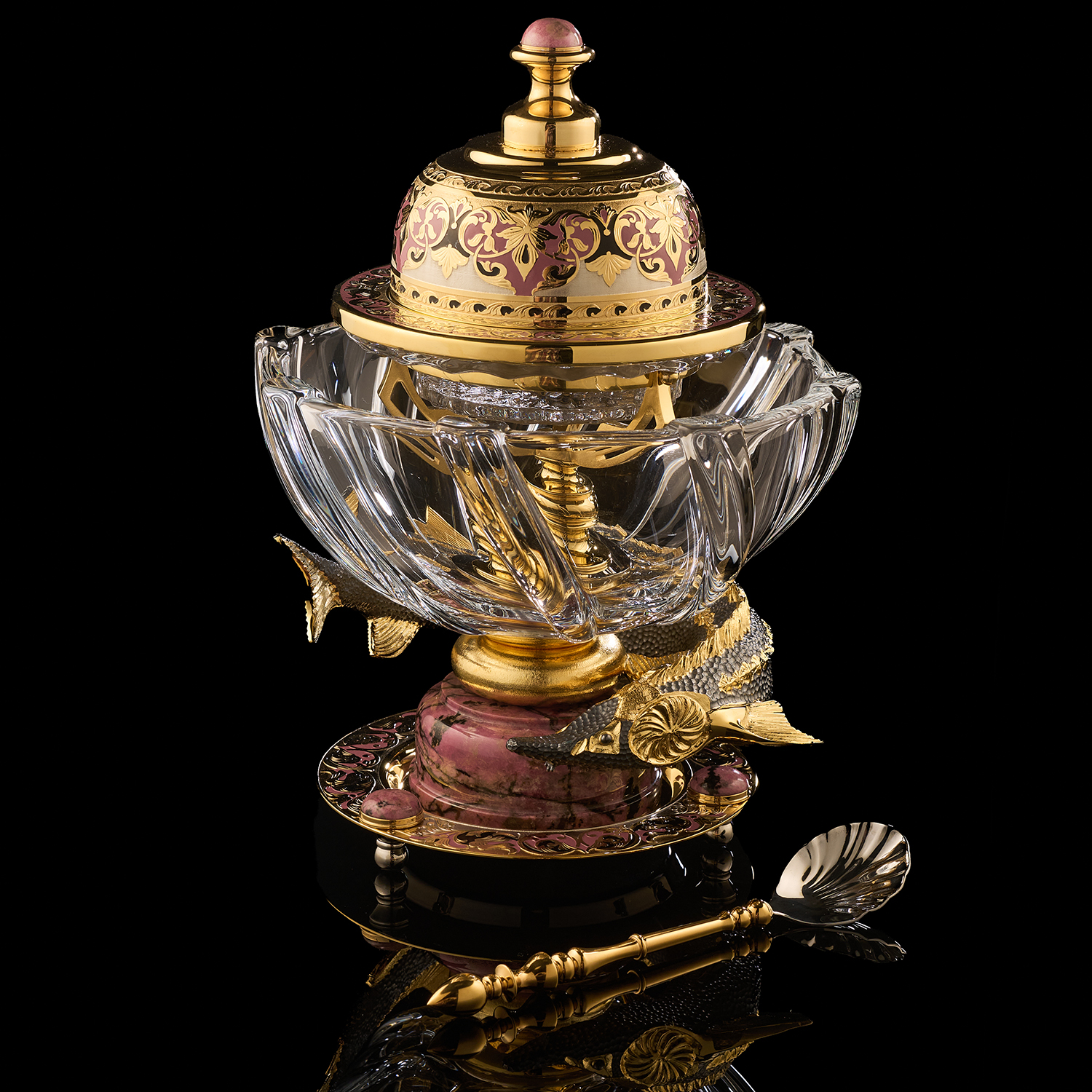 Икорница "Посейдон". Златоуст.Материалы: латунь, никель, золото 999,9*, эмаль, стекло, родонит.