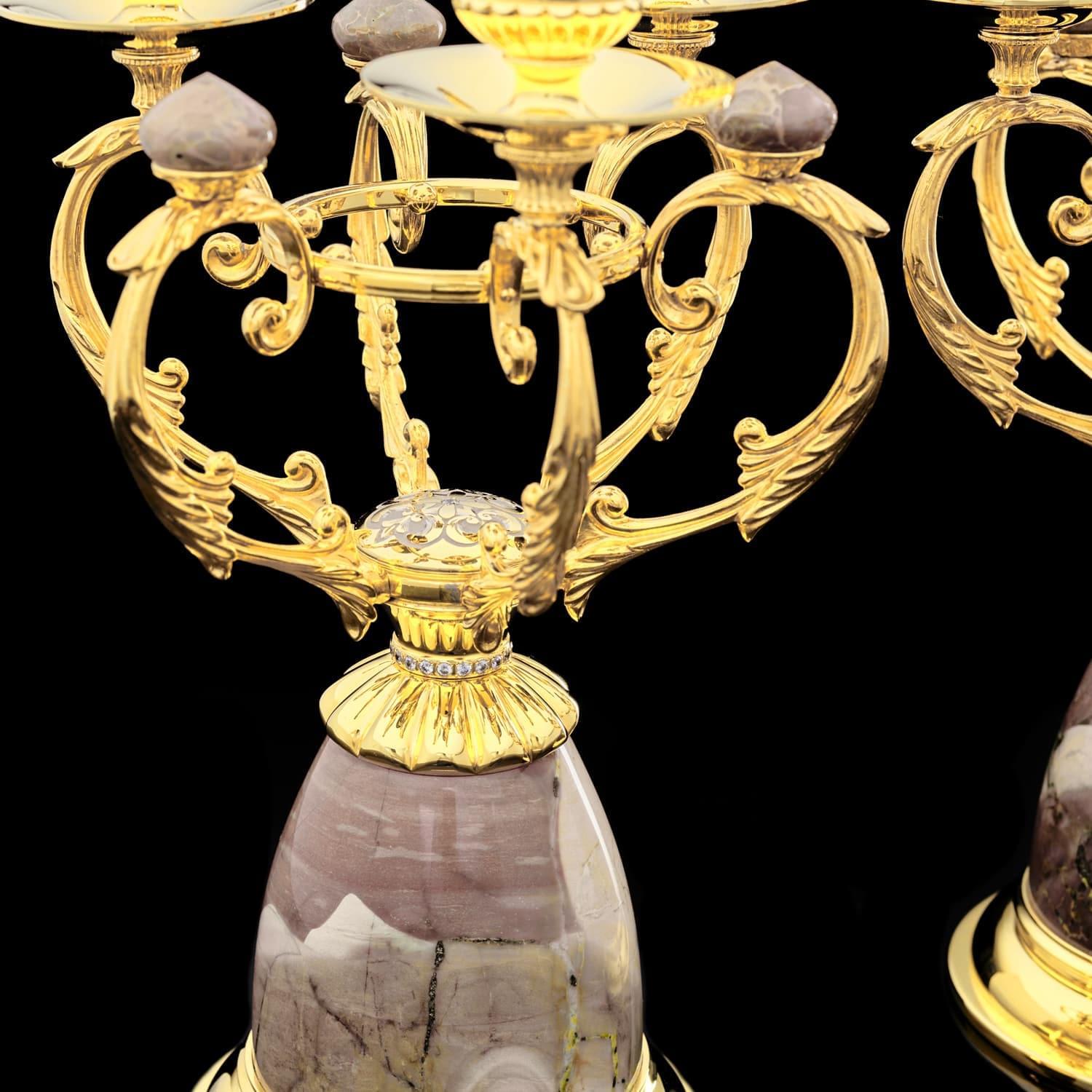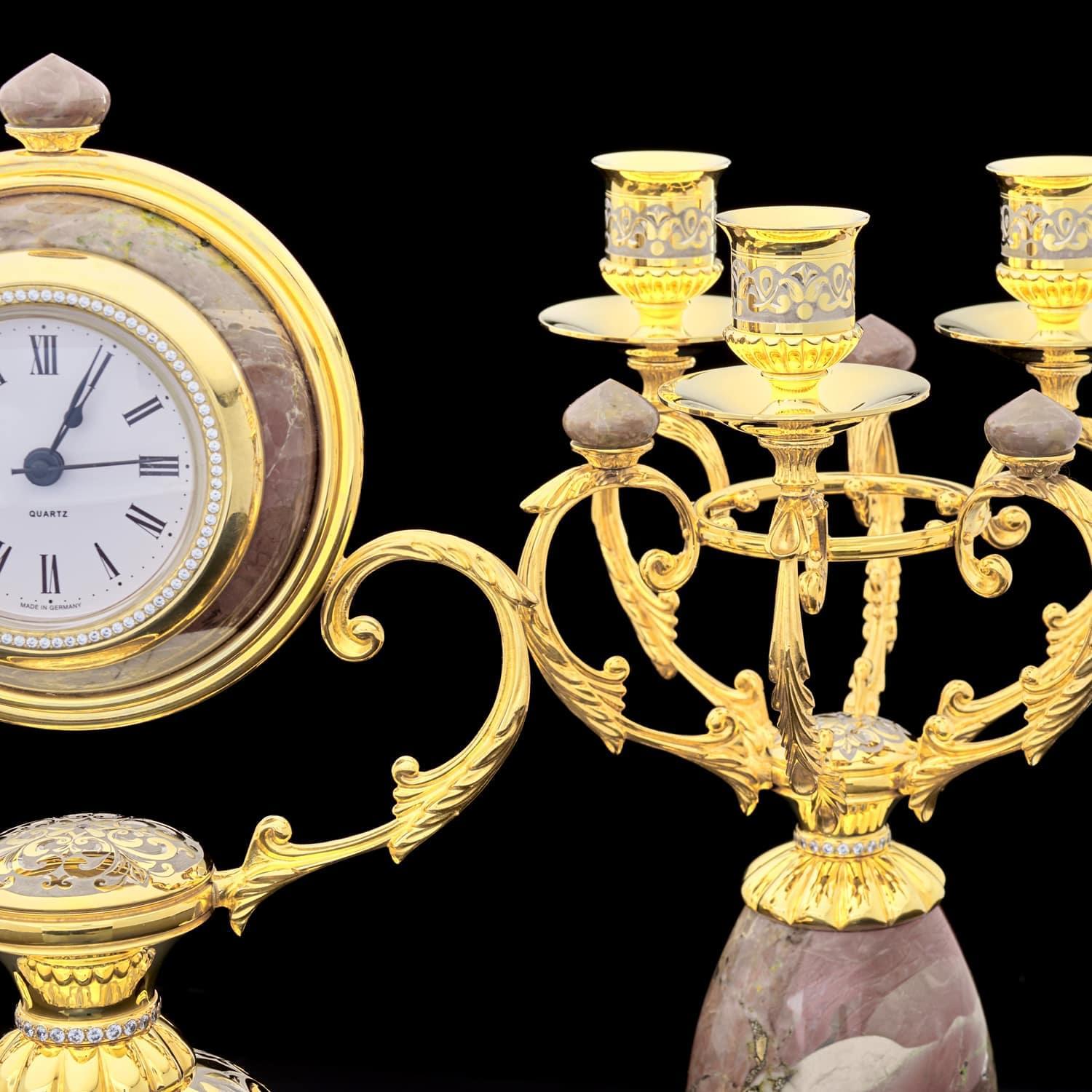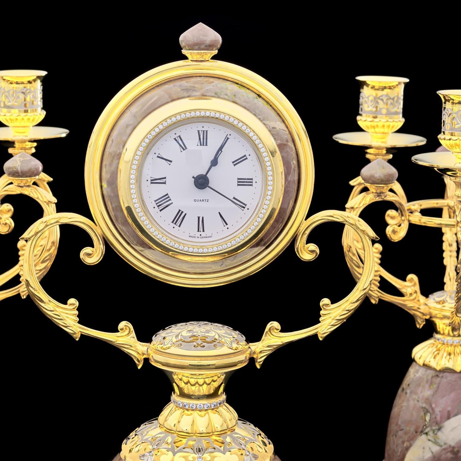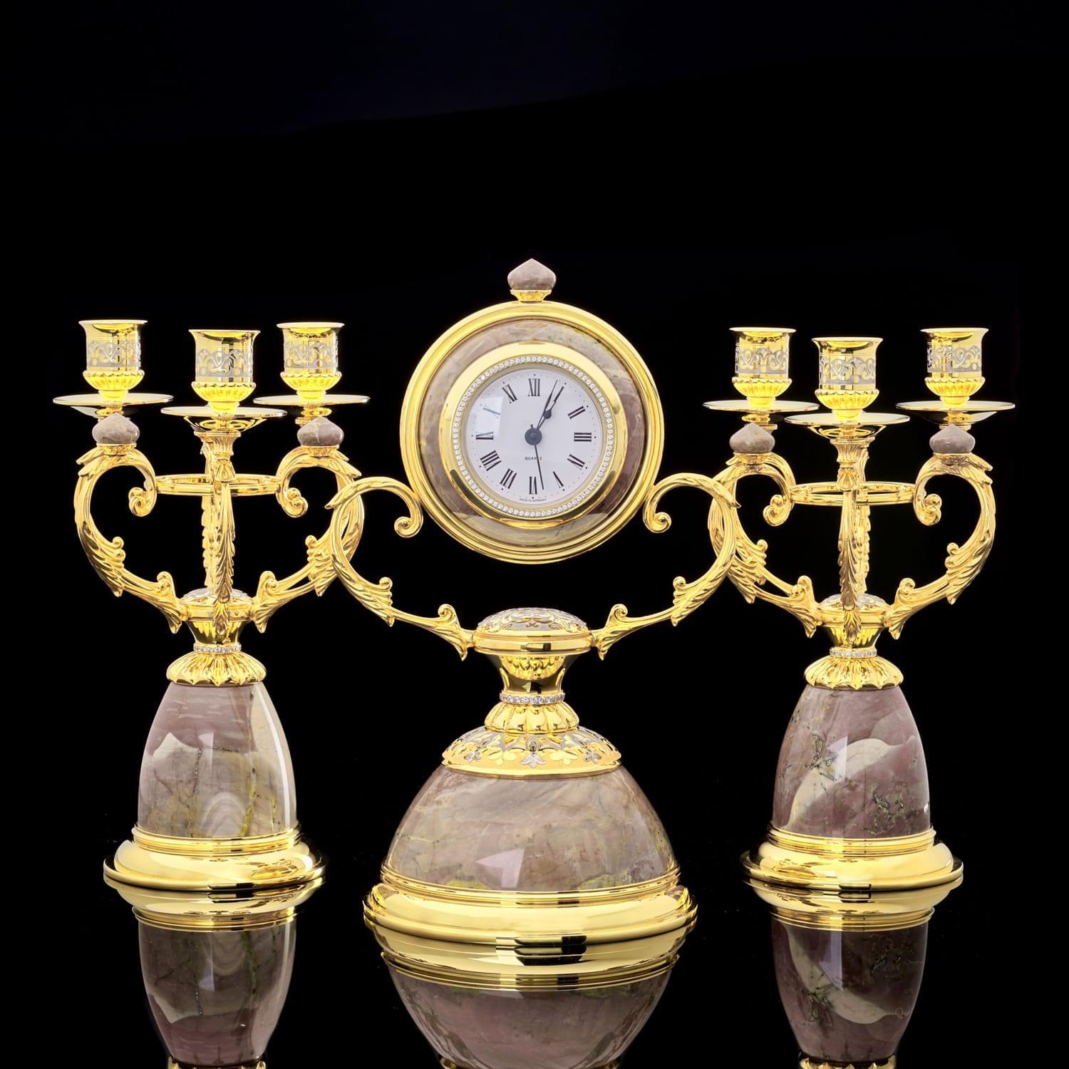 Часы каминные из яшмы и бронзы с двумя 3-х рожковыми канделябрами. Златоуст