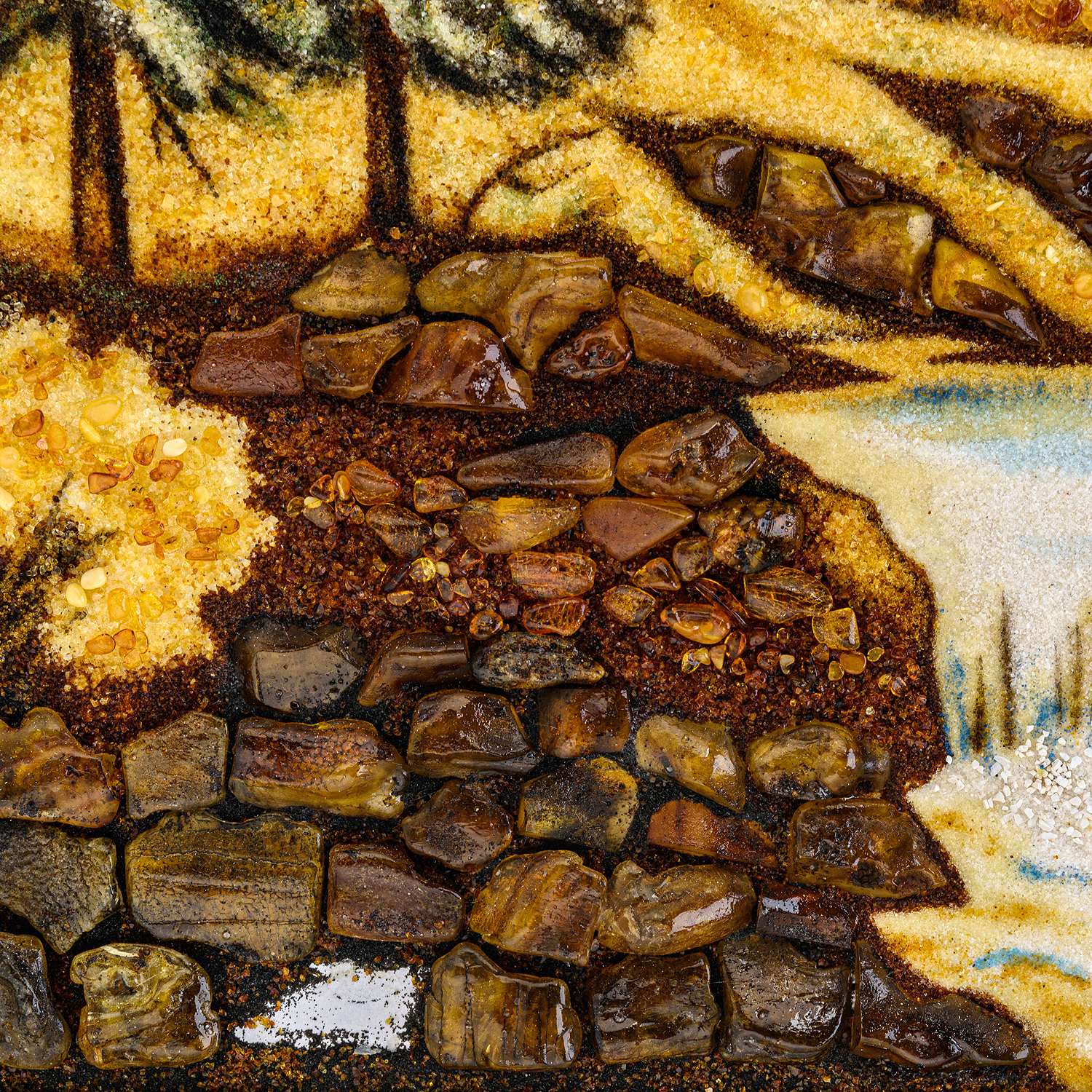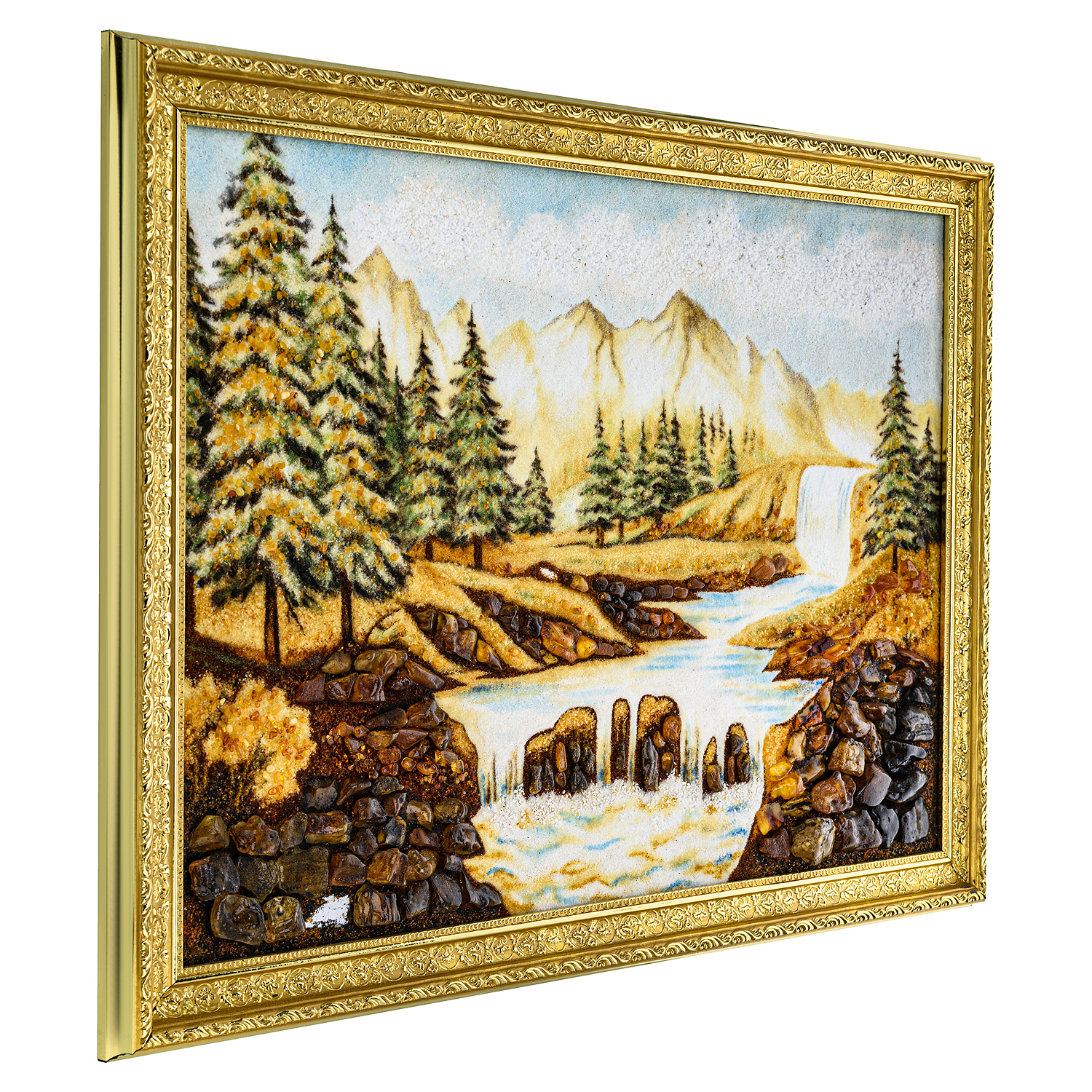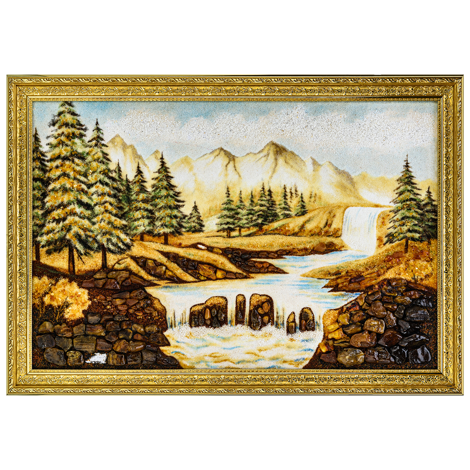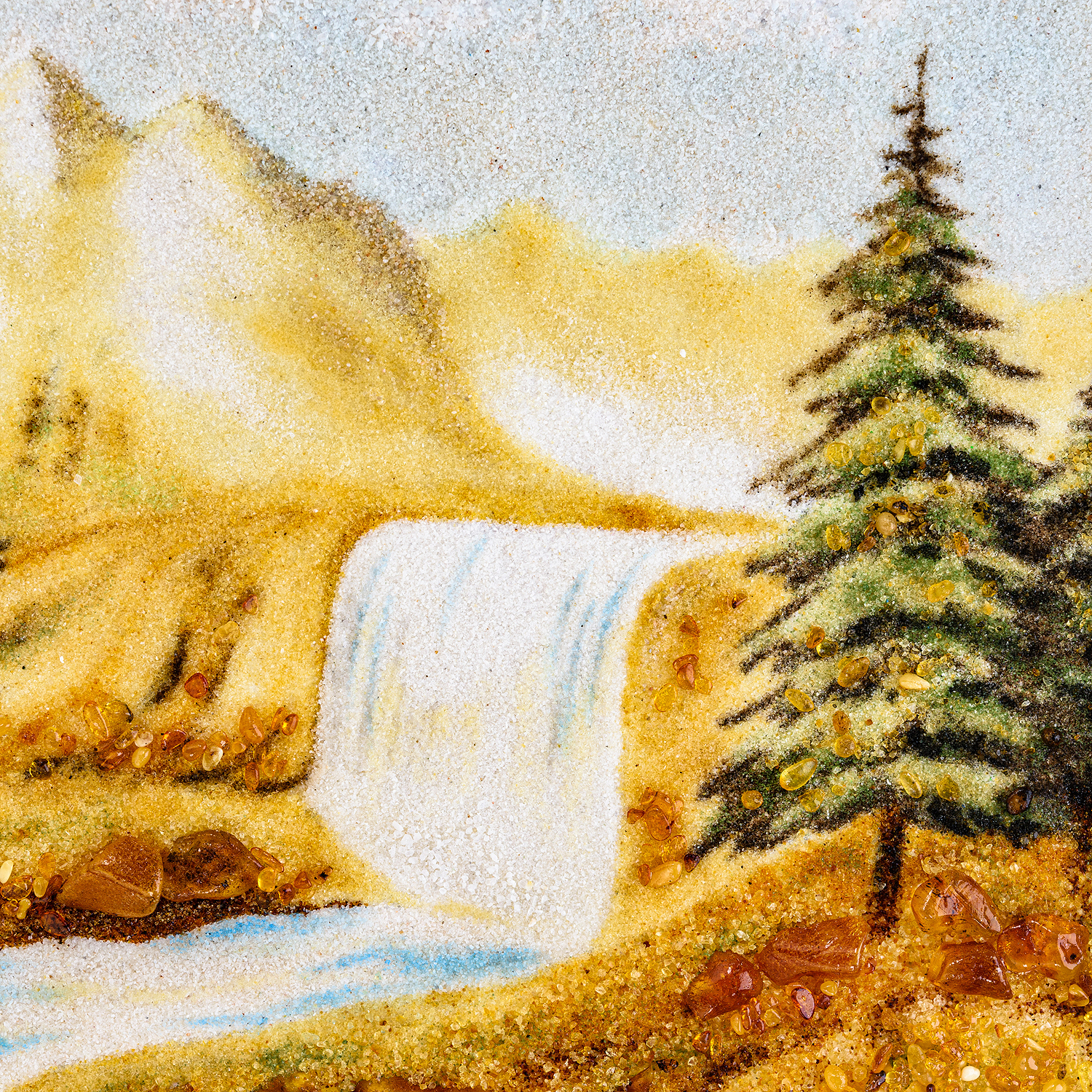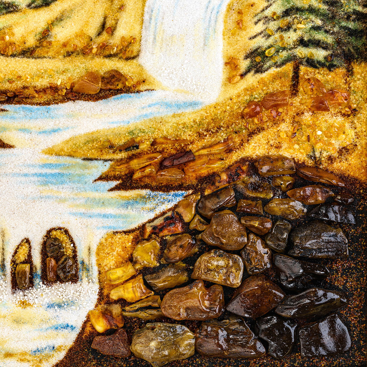 Водопад символизирует вечное движение, катализатор процесса обновления и регенерации, источник первородной жизненной энергетики и перерождения. Русские придумали технологию высыпки каменной крошки на панно. Картины изготавливаются из отборного янтаря-сырца разных оттенков: от мелкой крошки до крупных кабошонов, чьи размеры варьируются в зависимости от размера панно. Рельефная мозаика из самоцветов делает изображение объемным и реалистичным. Для создания его нужно от 12 оттенков янтаря. Для получения эффектного и гармоничного образа все цвета должны плавно перетекать друг в друга. Материалы: янтарь, янтарная крошка, деревянный багет.