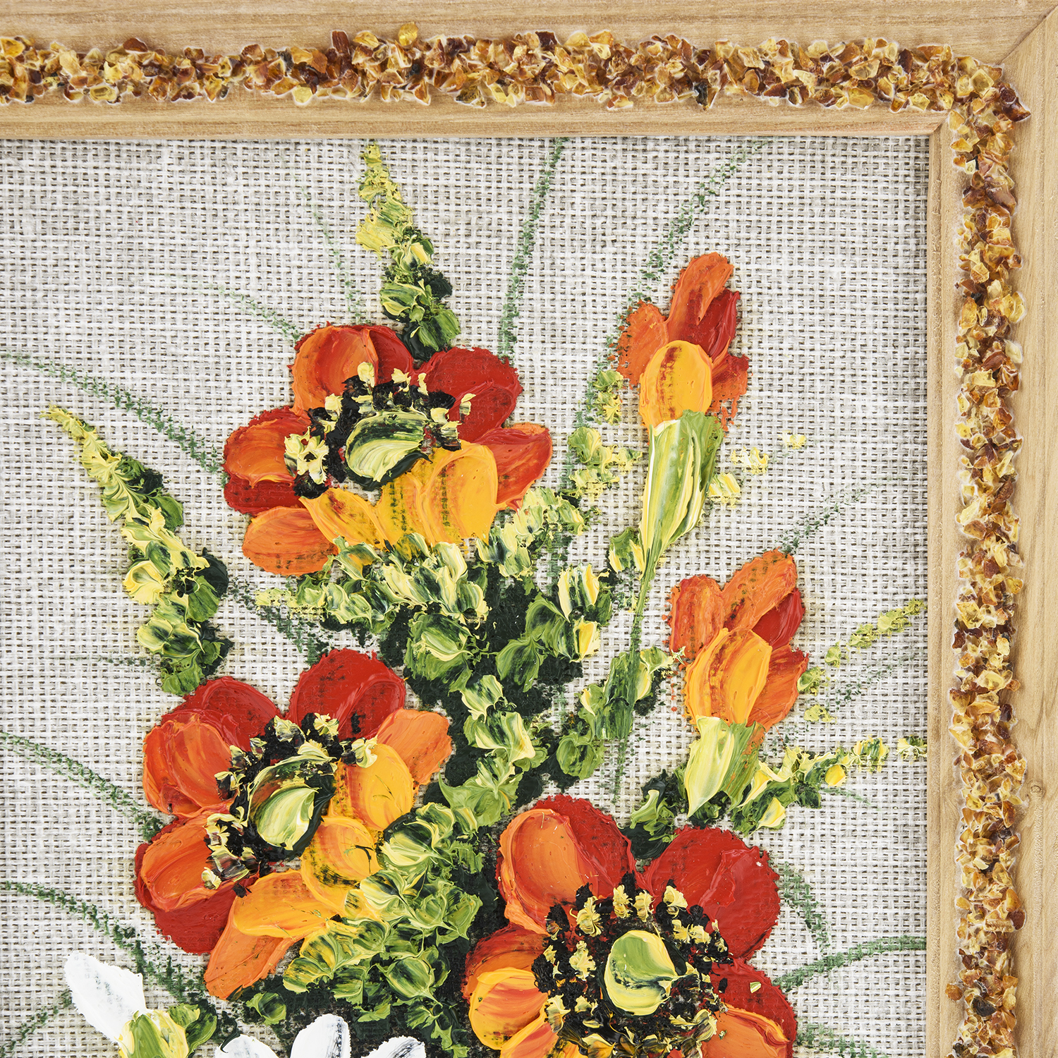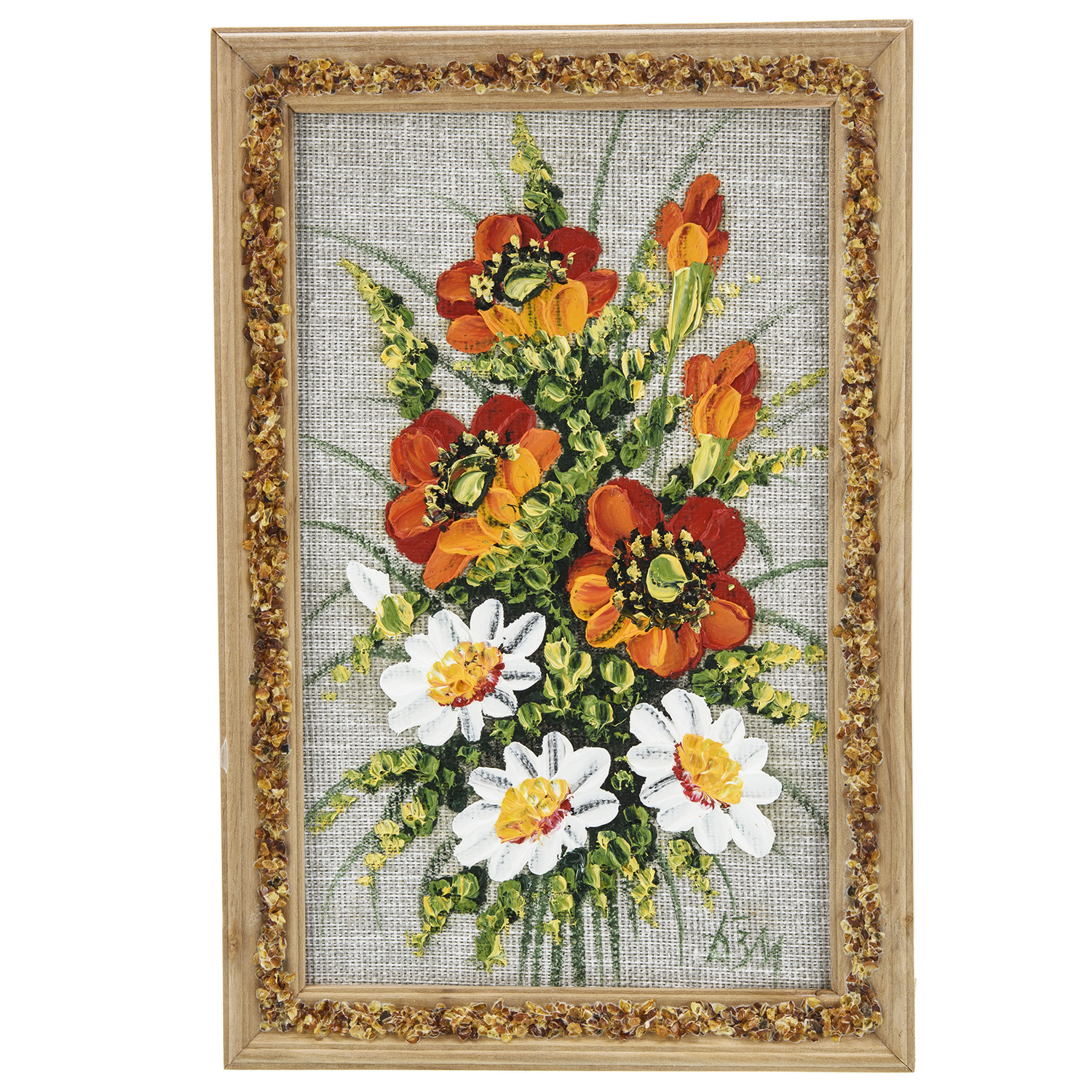 Панно в янтарной раме "Букет цветов".Материалы: холст, краски, дерево, янтарь.