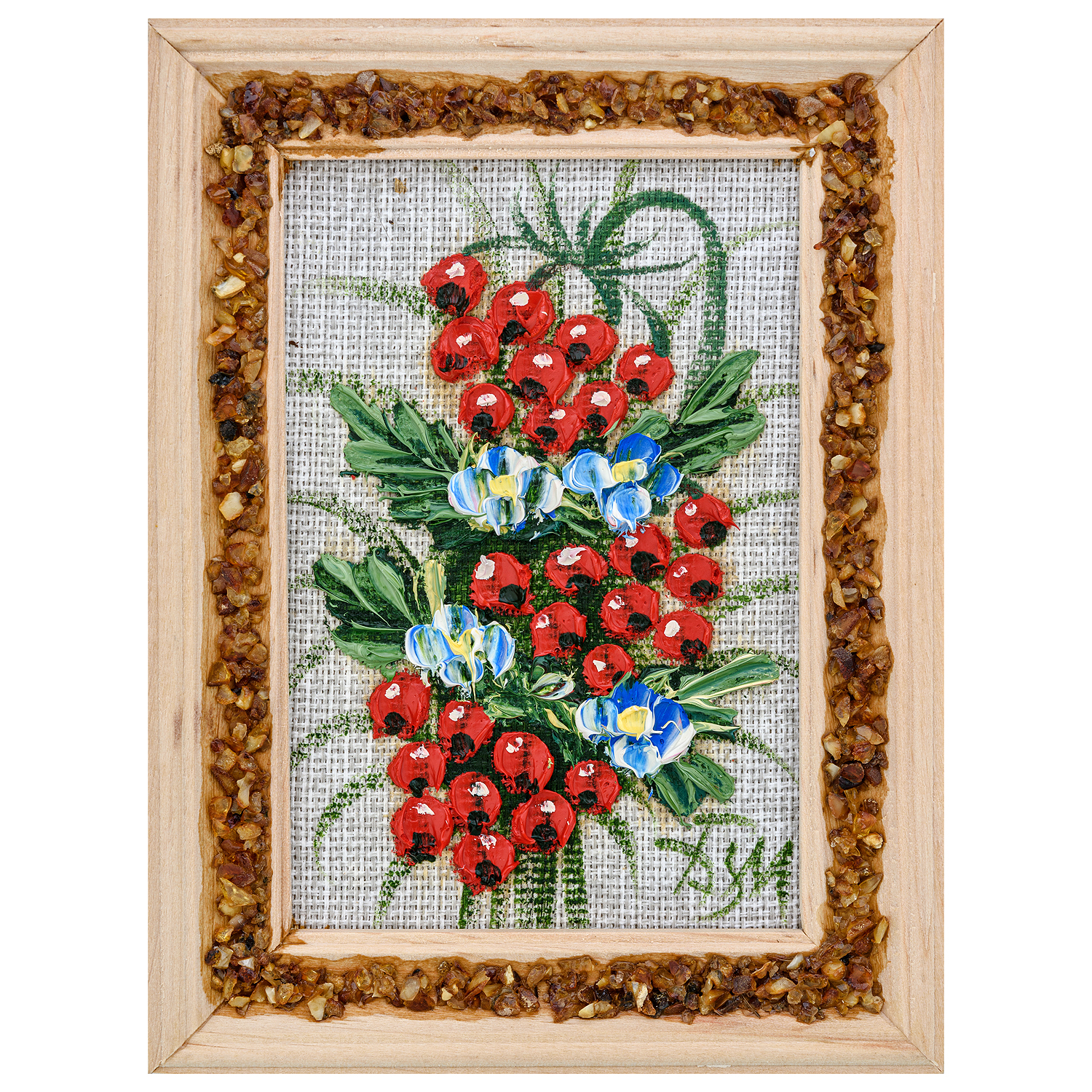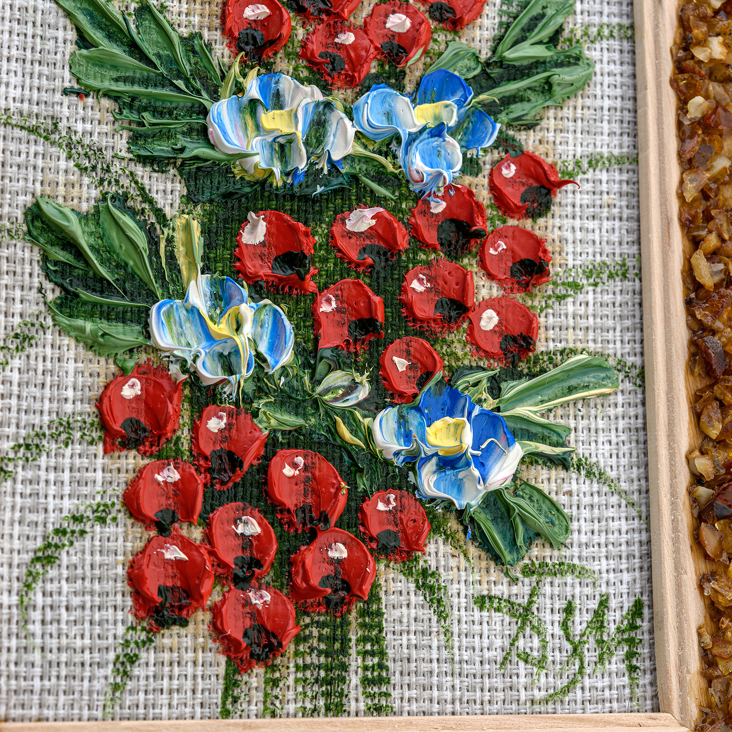 Панно в янтарной раме "Букет цветов".Материалы: холст, краски, дерево, янтарь.