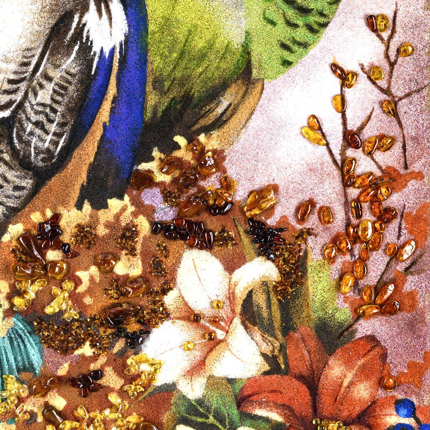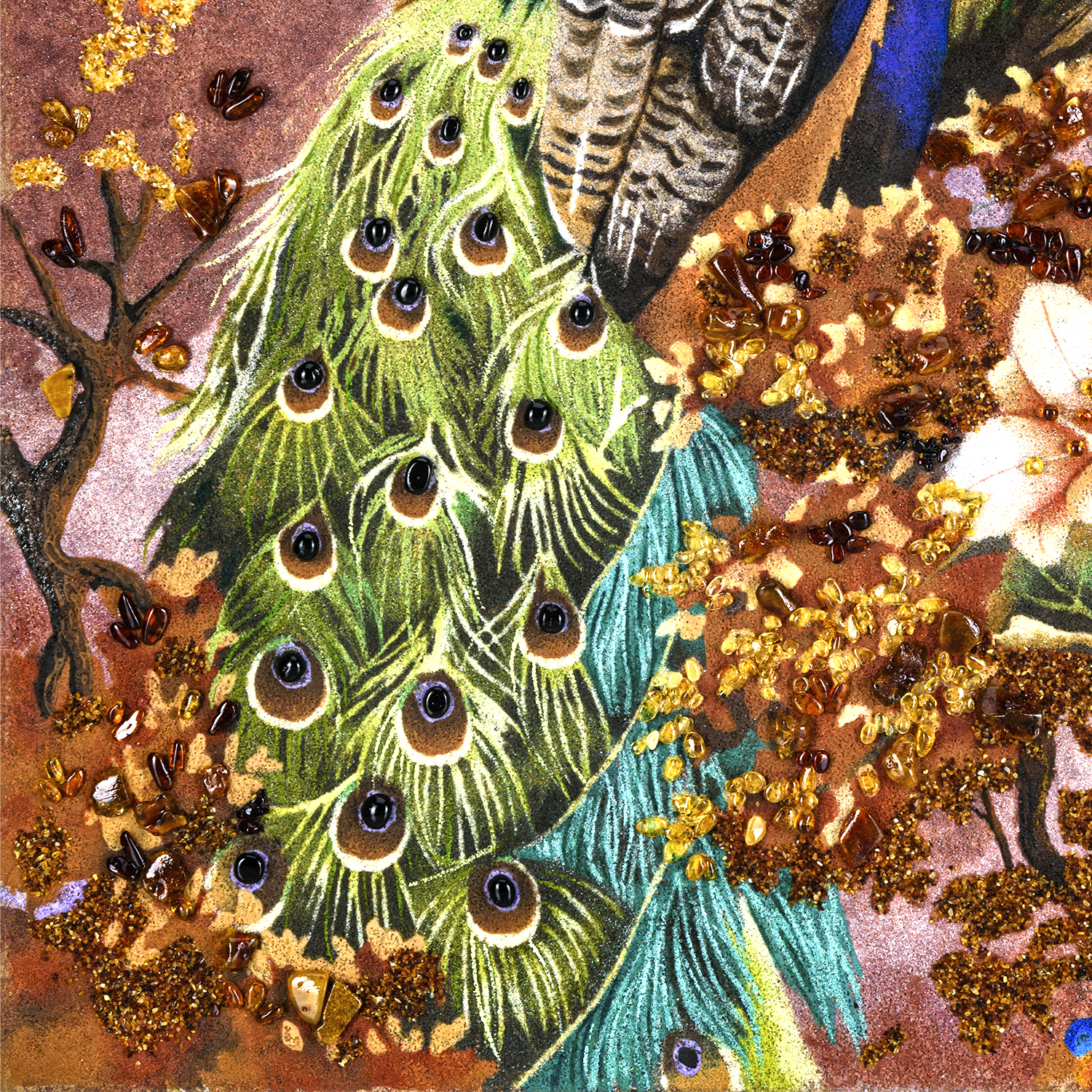 Картина янтарная "Павлин".Материалы: фанера, краски, янтарь.