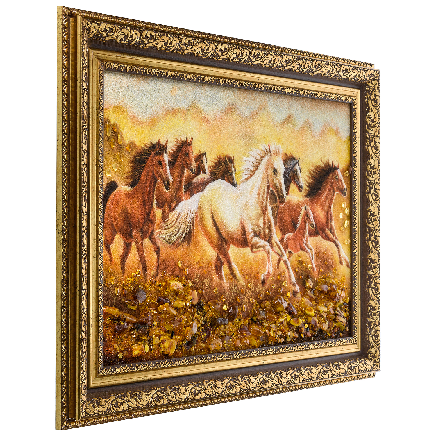 Русские подарки и сувениры → Интерьерные изделия → Картины → Картина янтарная "Кони с жеребенком" 40х60 см
