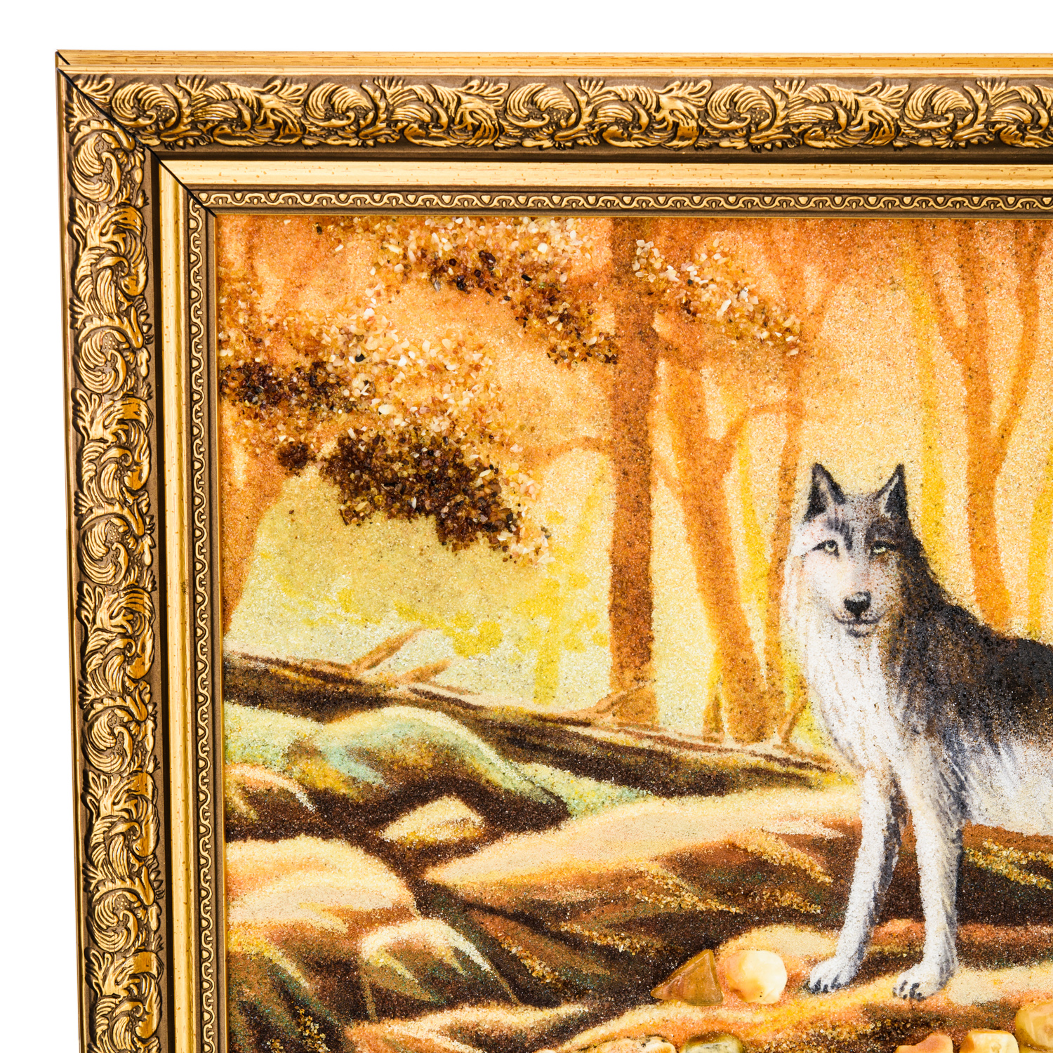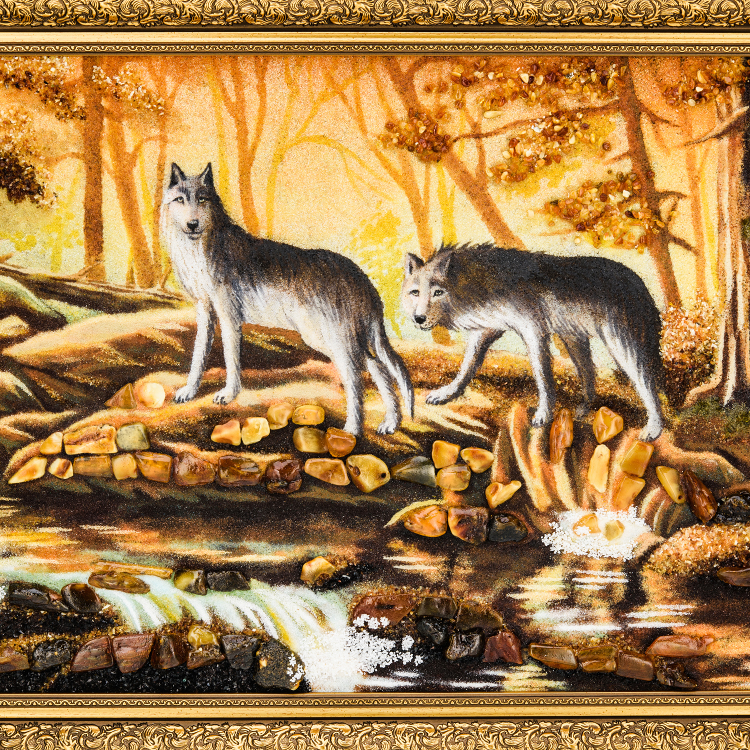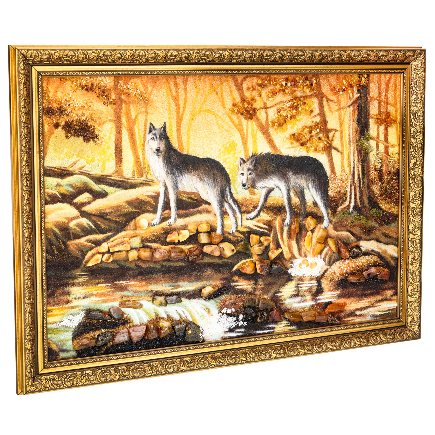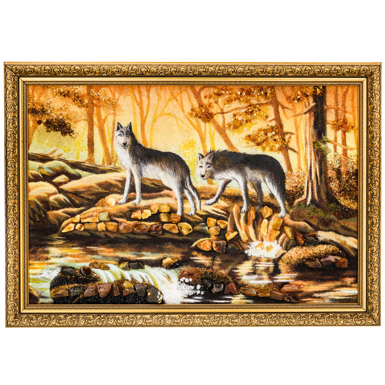 Русские подарки и сувениры → Интерьерные изделия → Картины → Картина янтарная "Волки у реки" 60х40 см