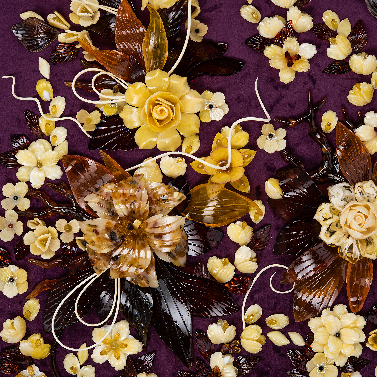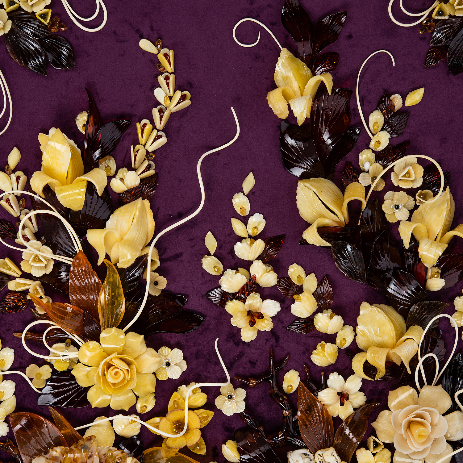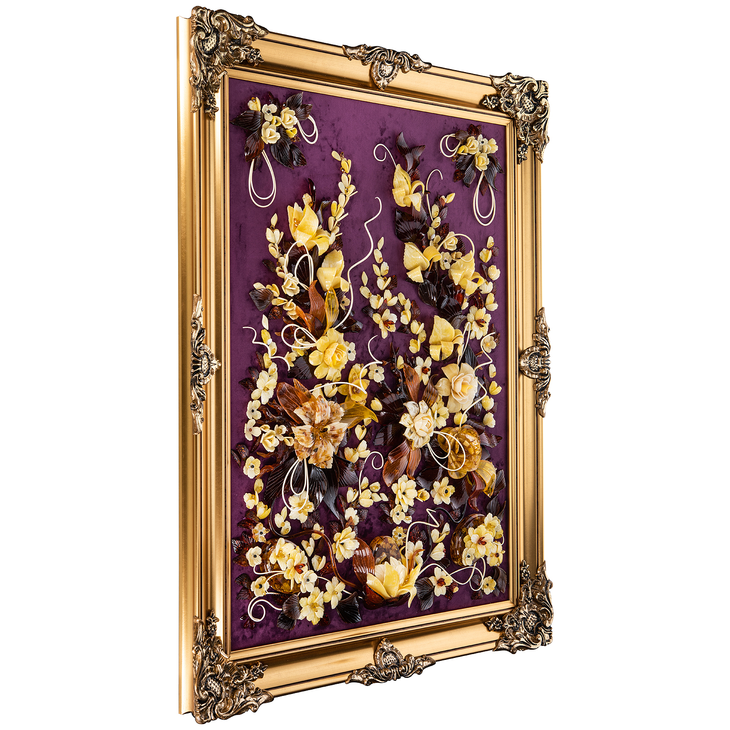 Картина янтарная "Версальский букет".Материалы: янтарь, бархат, багетная рама.