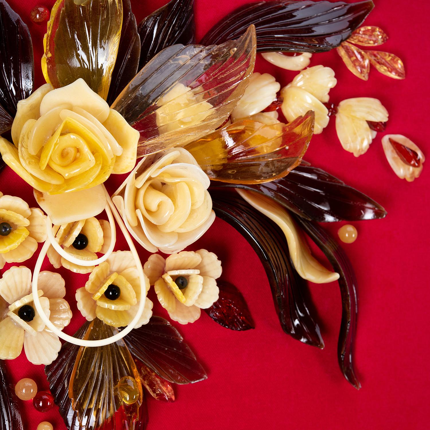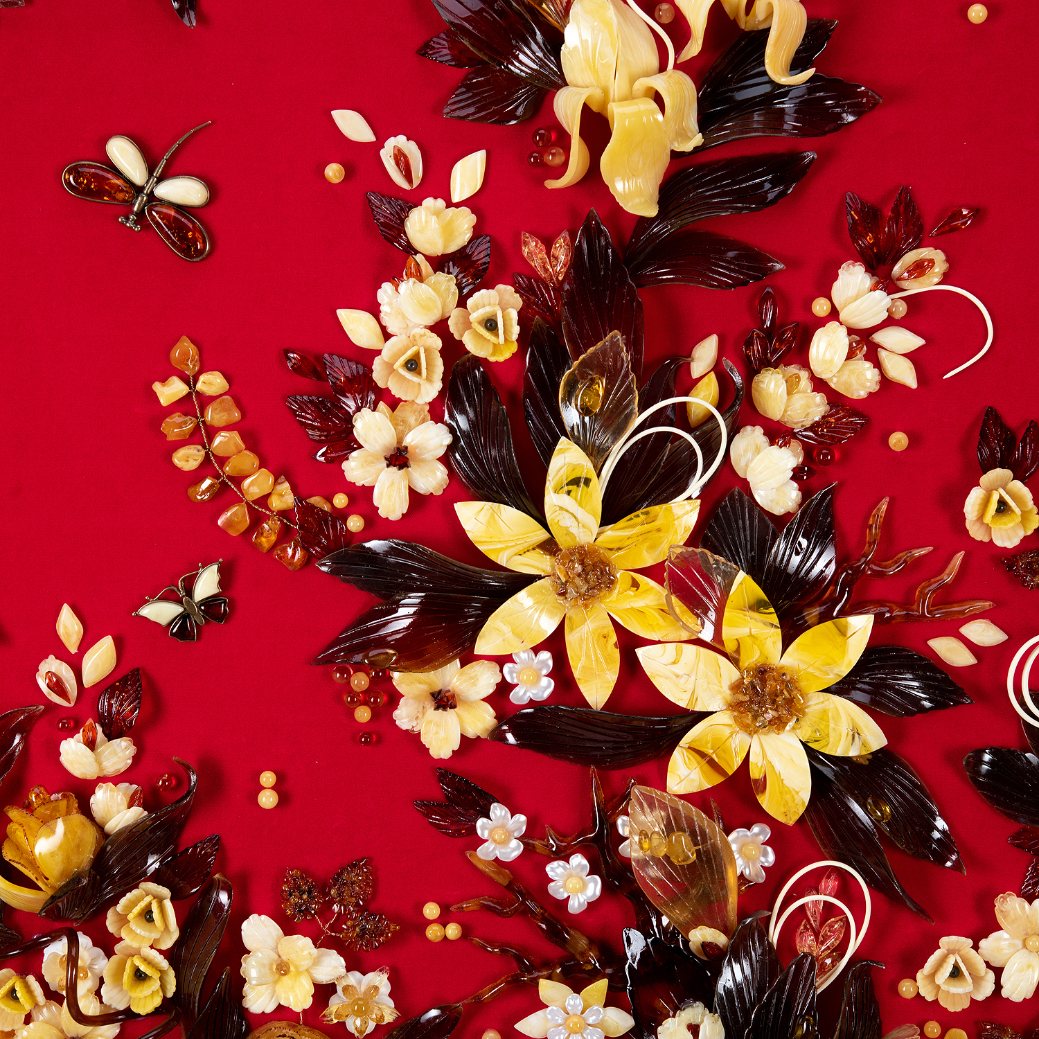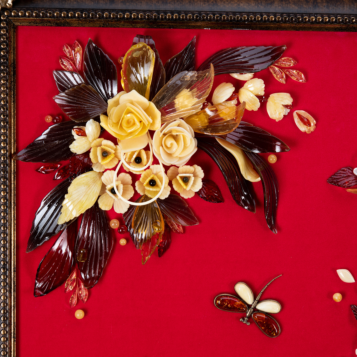 Картина янтарная "Роскошь цветения".Материалы: янтарь, бархат, багетная рама.