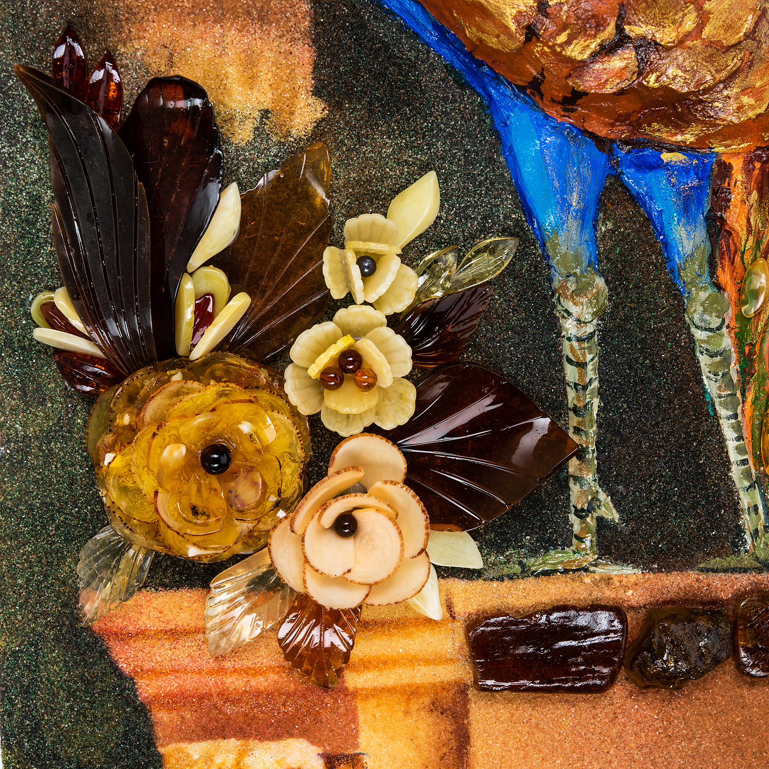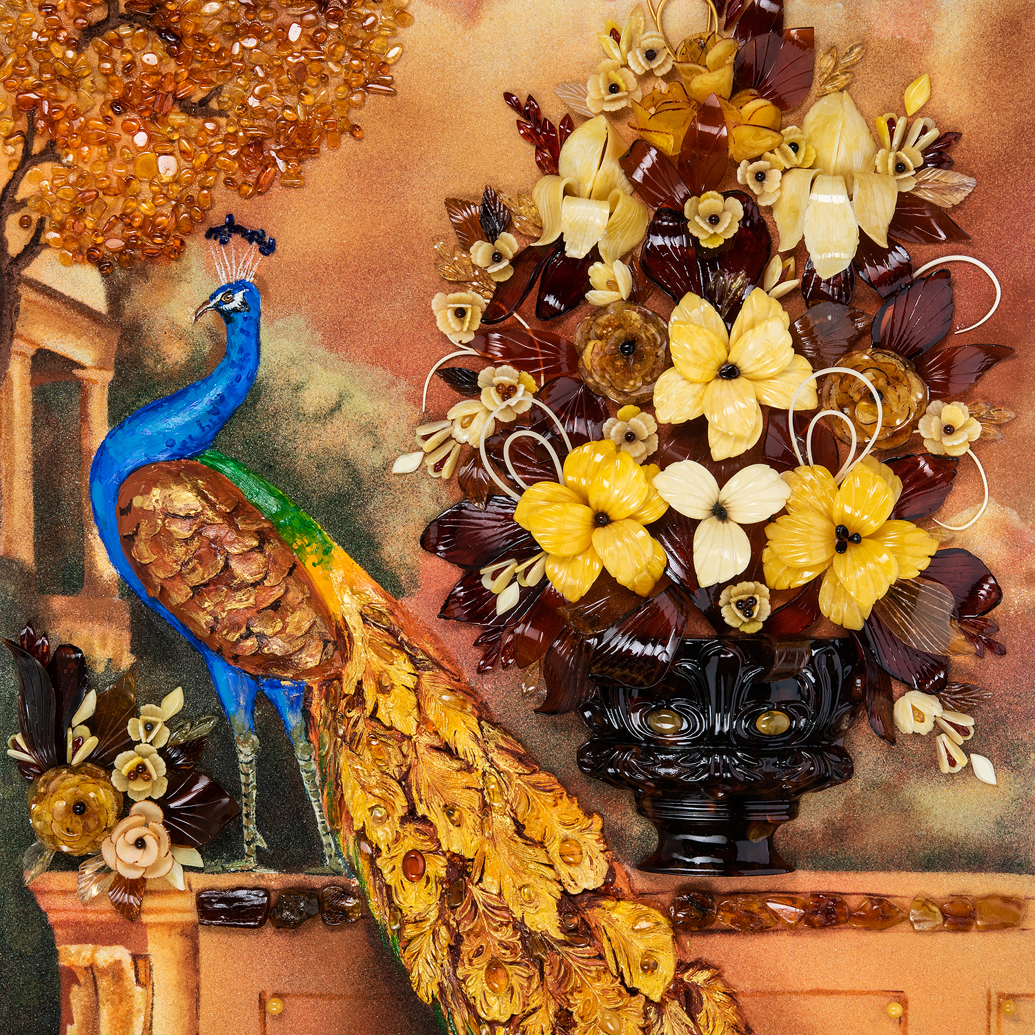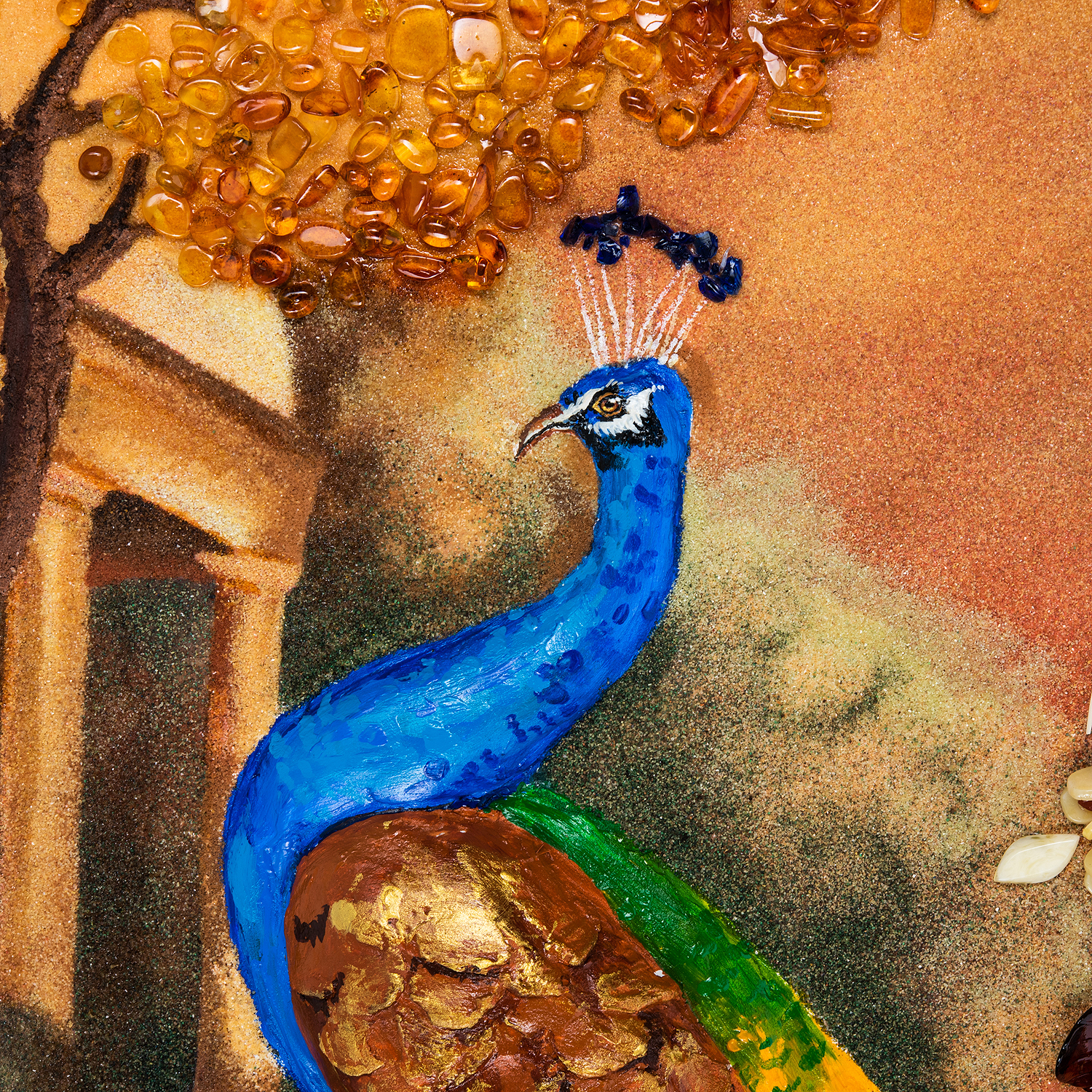 Картина янтарная "Павлин".Материалы: фанера, гипс, краски, янтарь, жемчуг, багетная рама.