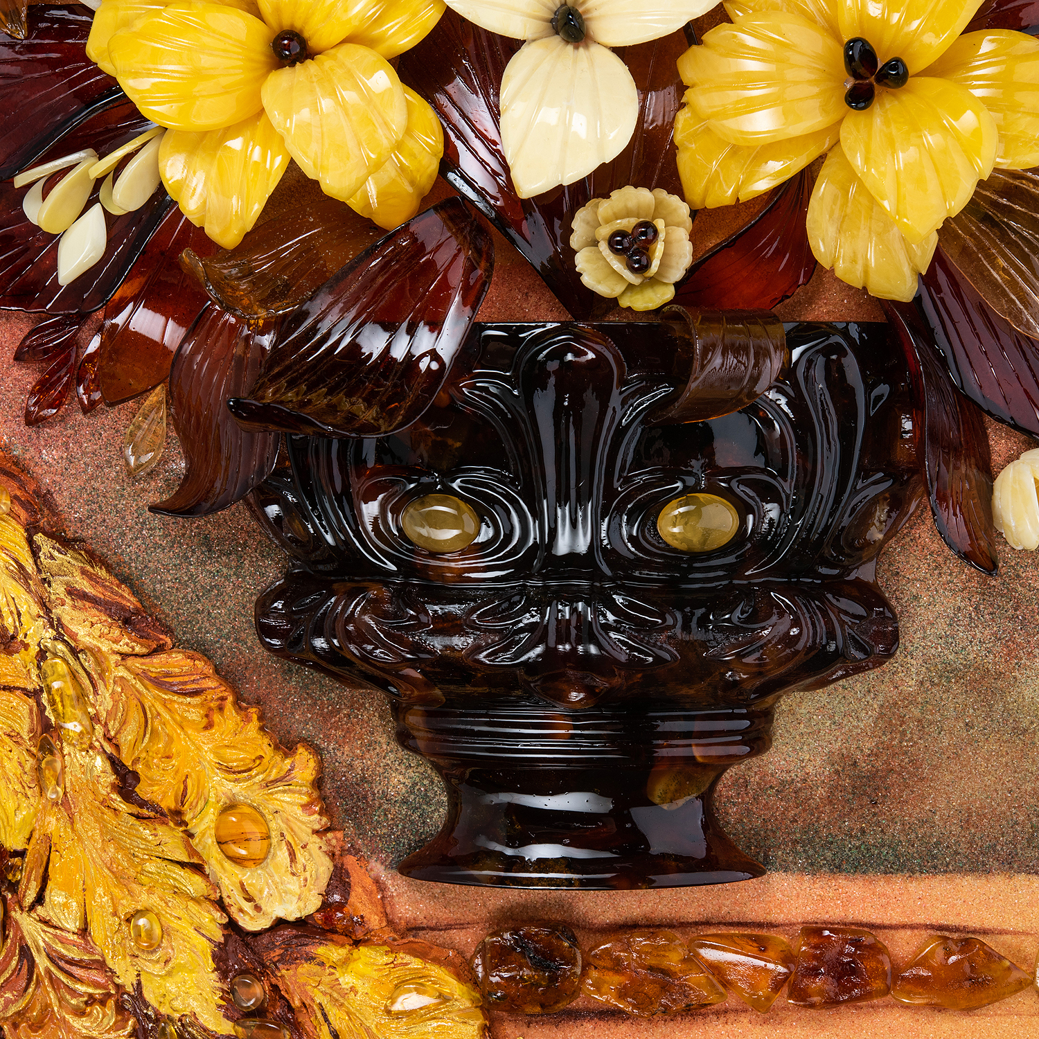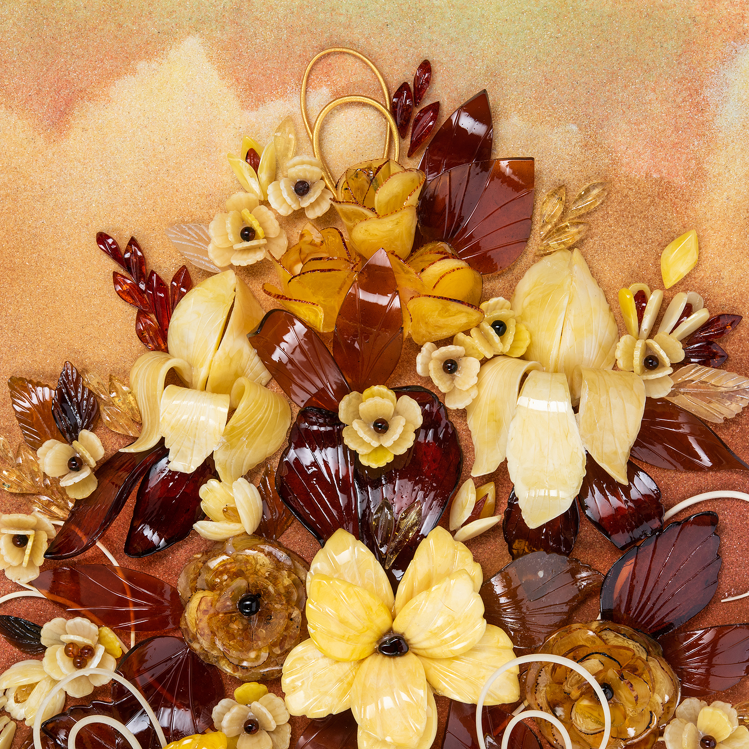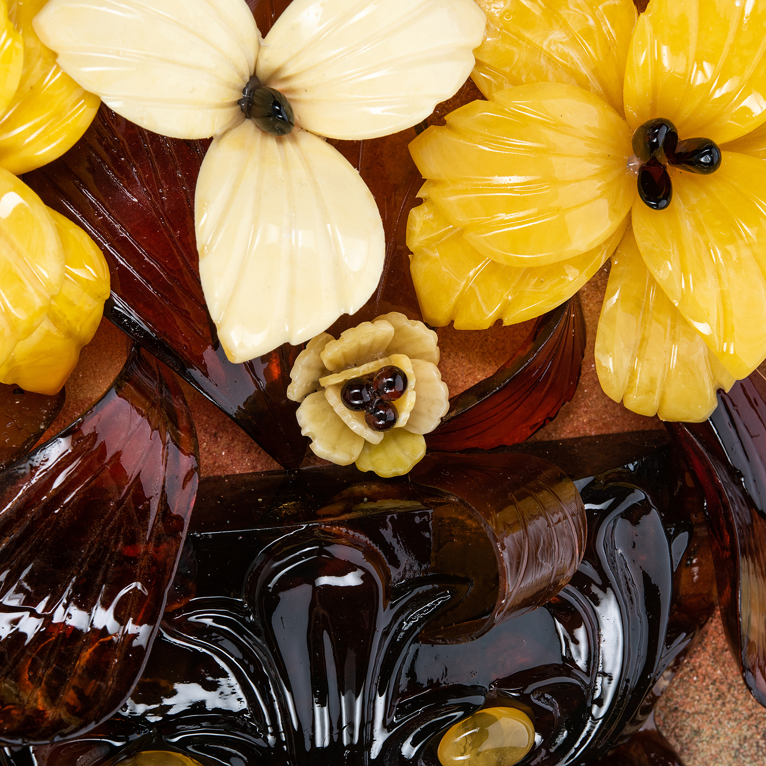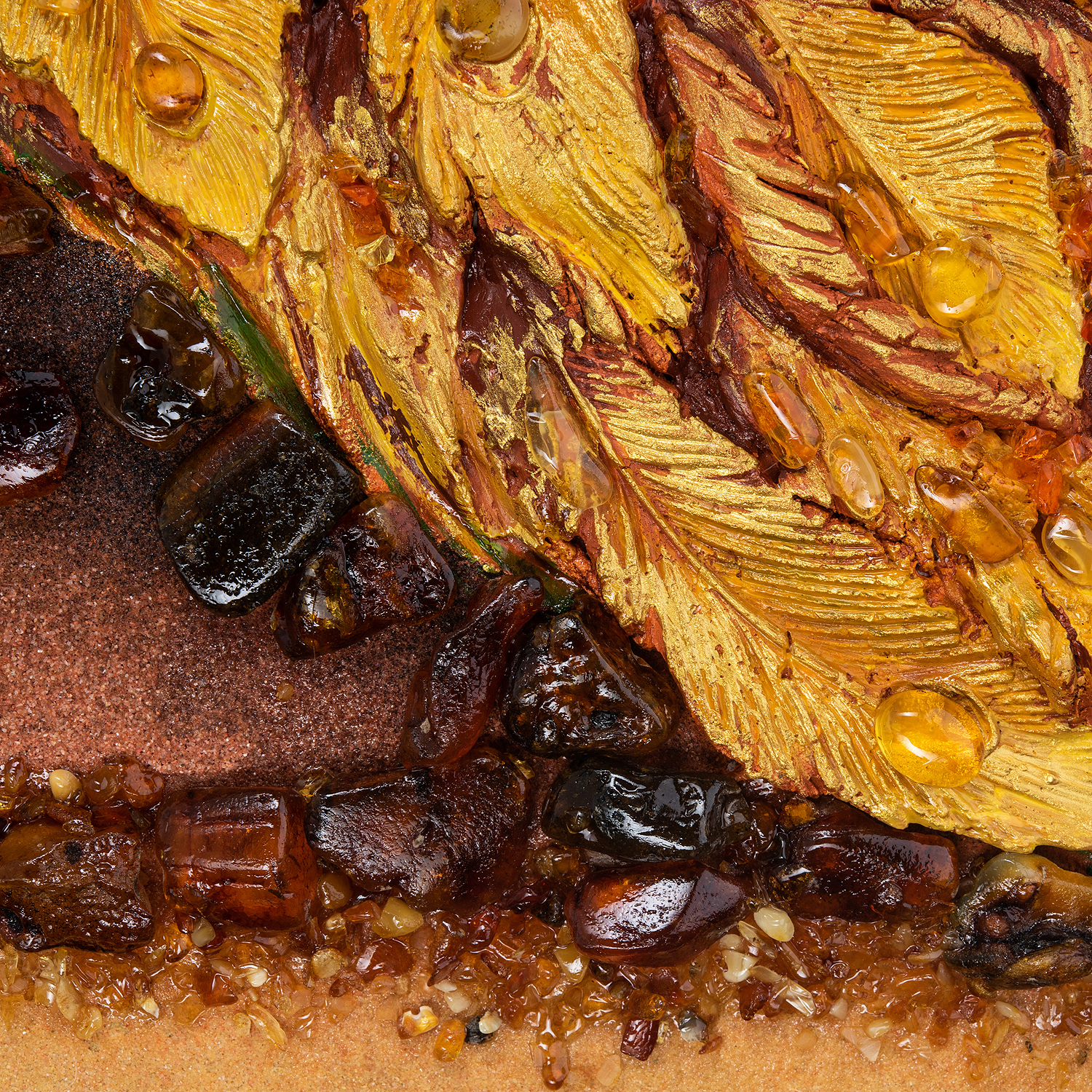 Картина янтарная "Павлин".Материалы: фанера, гипс, краски, янтарь, жемчуг, багетная рама.