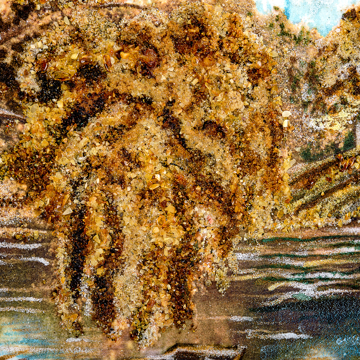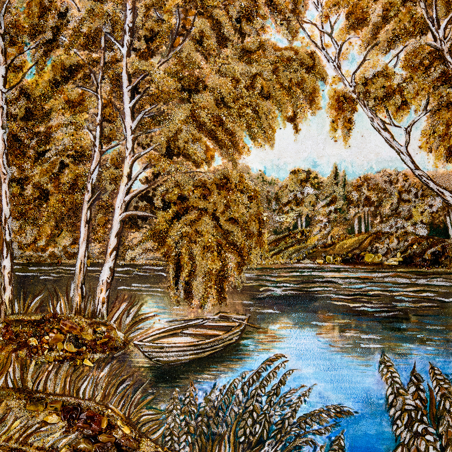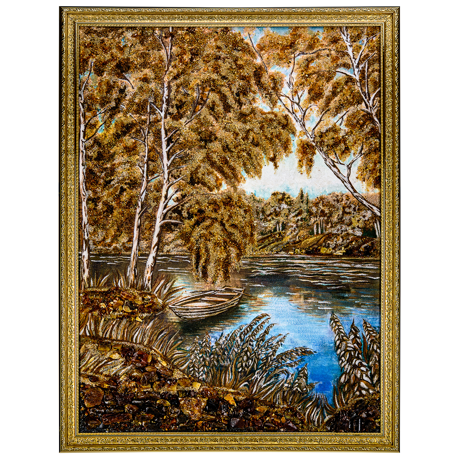 Картина янтарная "Лодка у берега".Материалы: холст, янтарь, кварцевый песок, каменная крошка, деревянный багет.