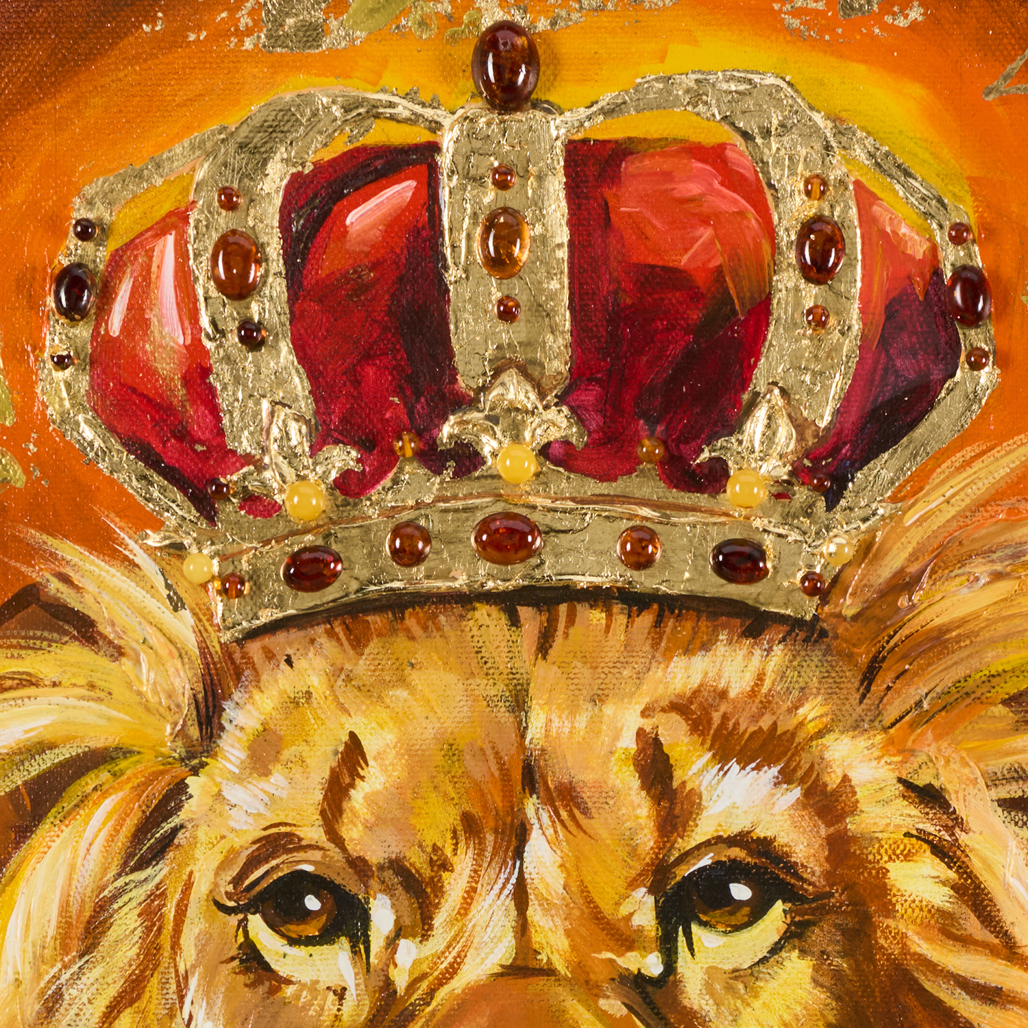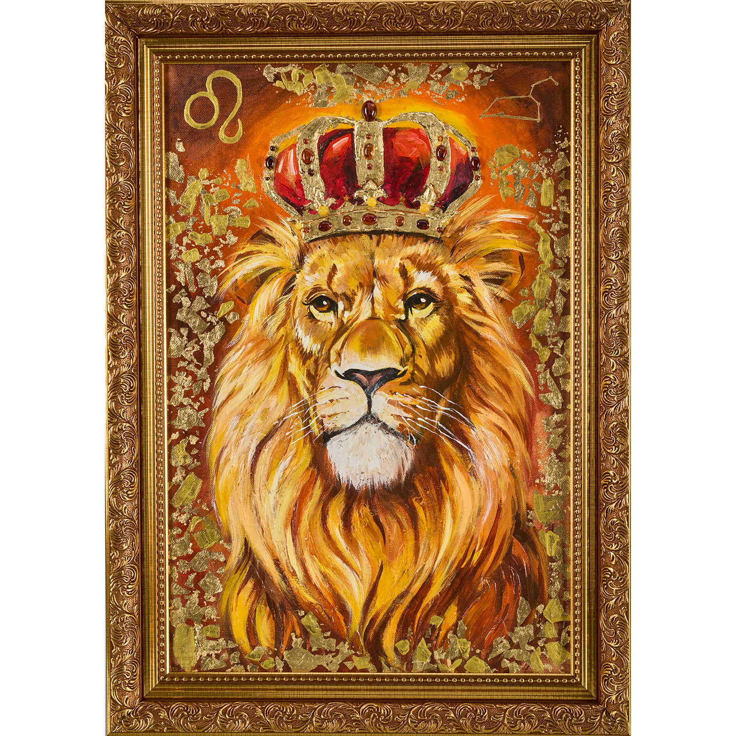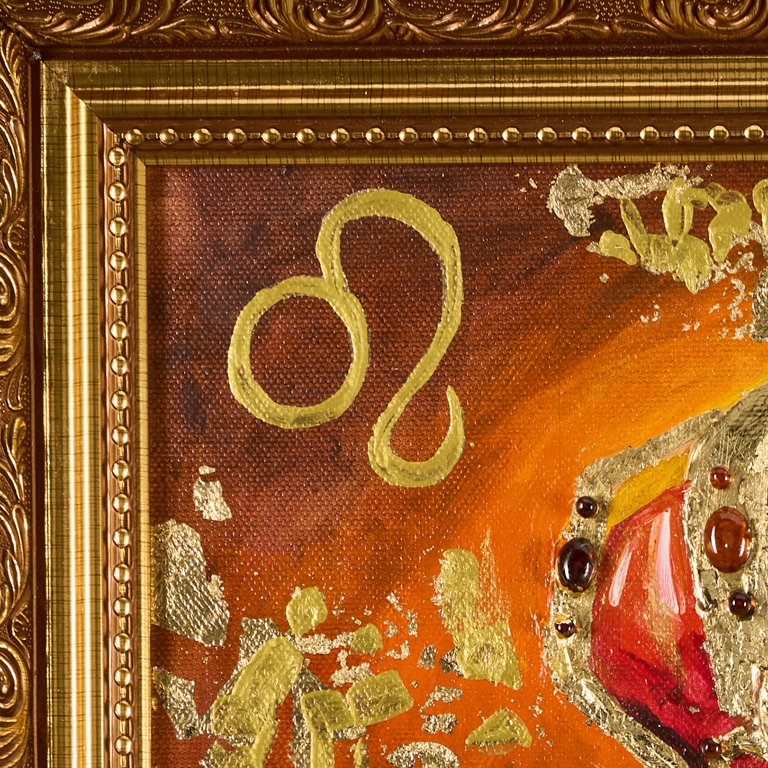 Картина с поталью и янтарем "Лев".Материалы: холст, краски, поталь, янтарь, багетная рама.
