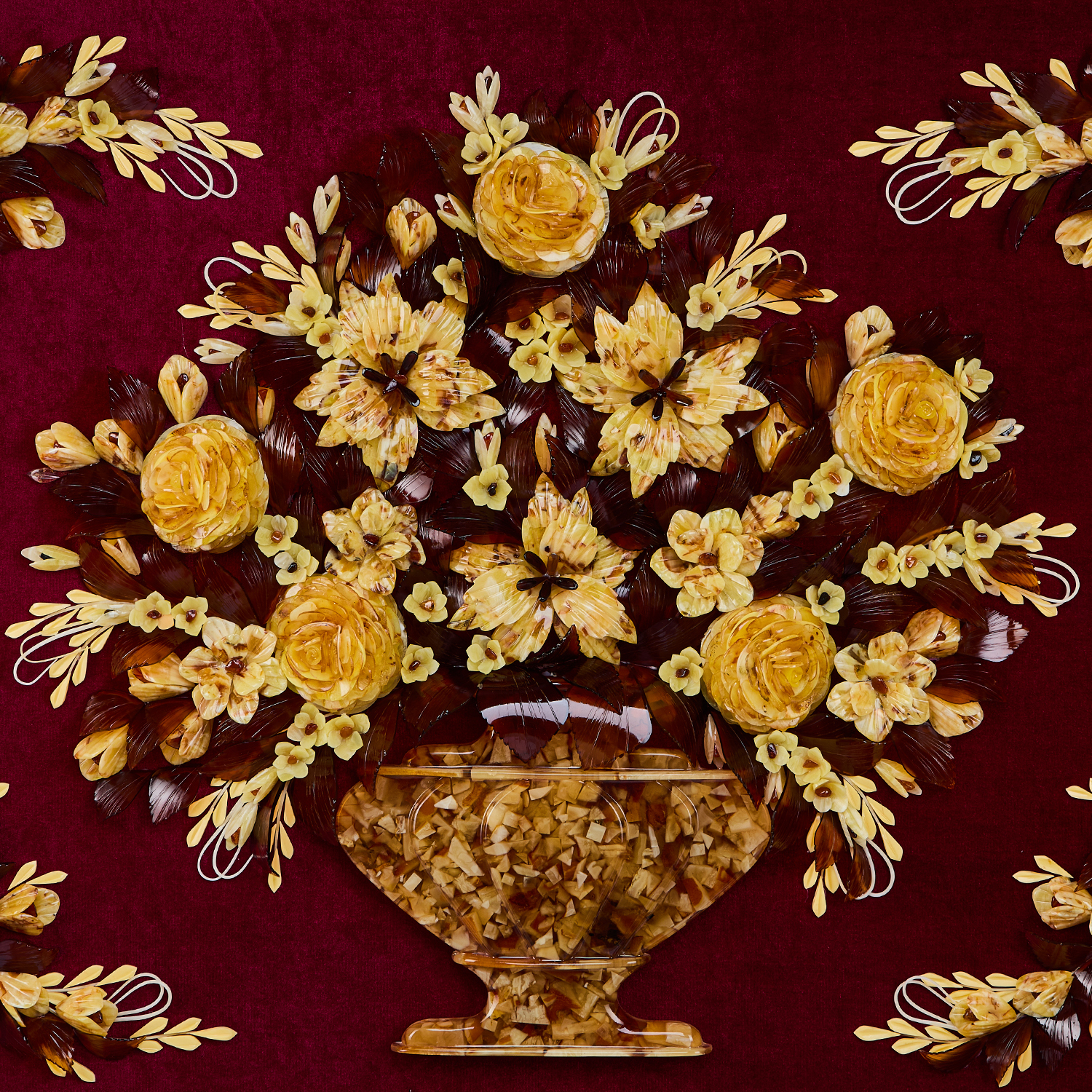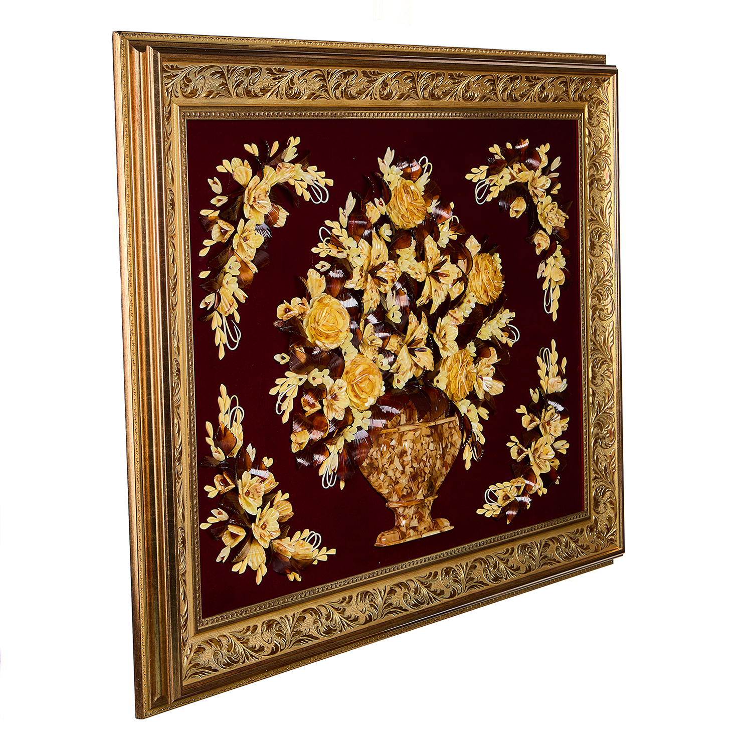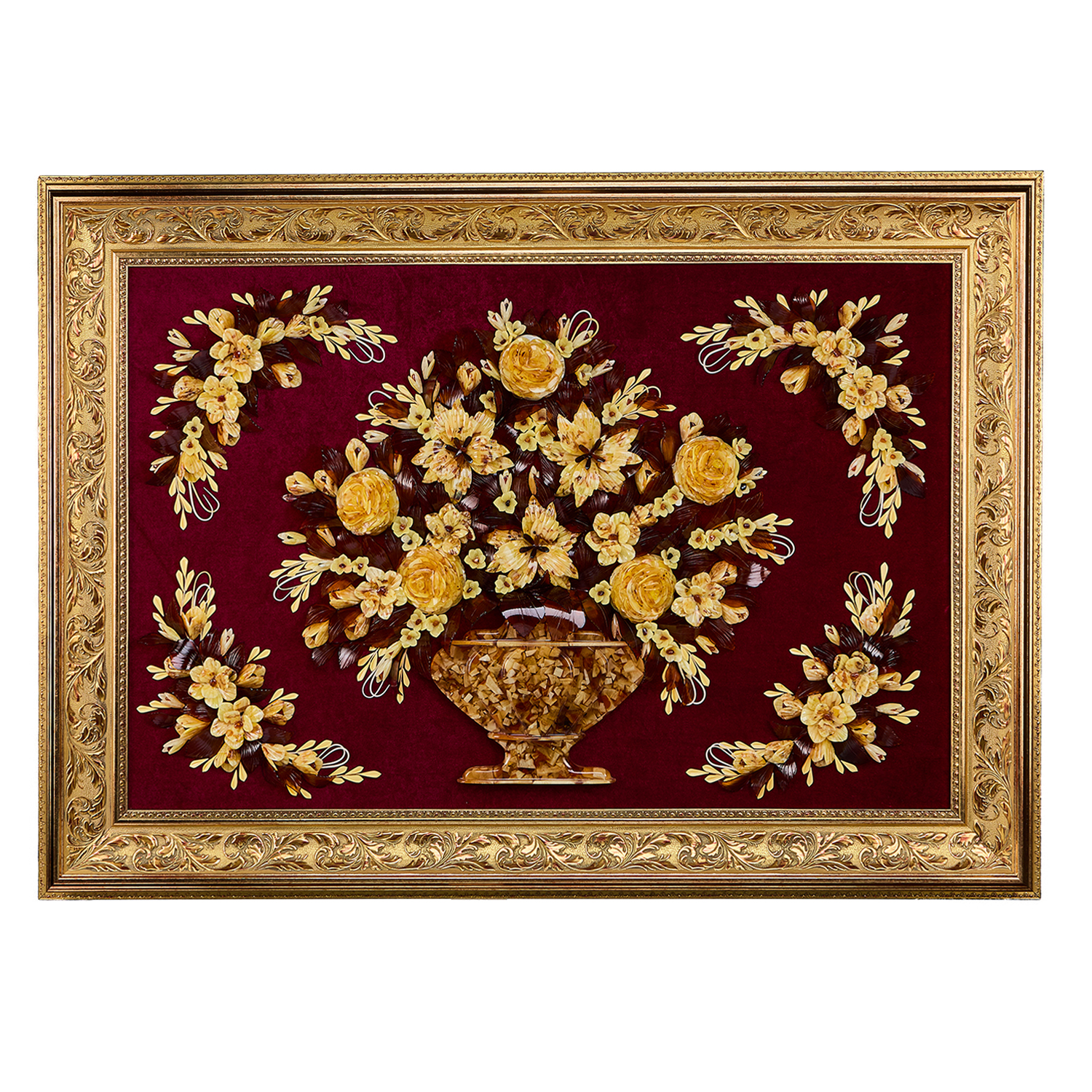 Картина янтарная "Цветы".Материалы: янтарь, барат, багетная рама.