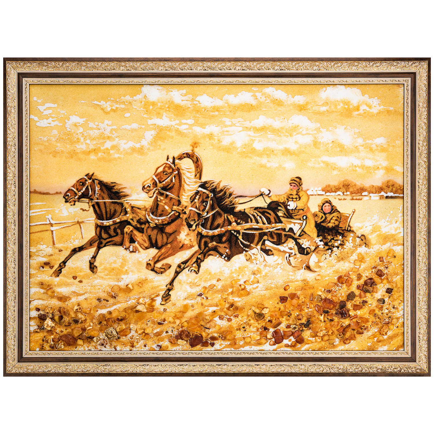 Русские подарки и сувениры → Интерьерные изделия → Картины → Картина янтарная "Зимняя тройка" 60x80 см