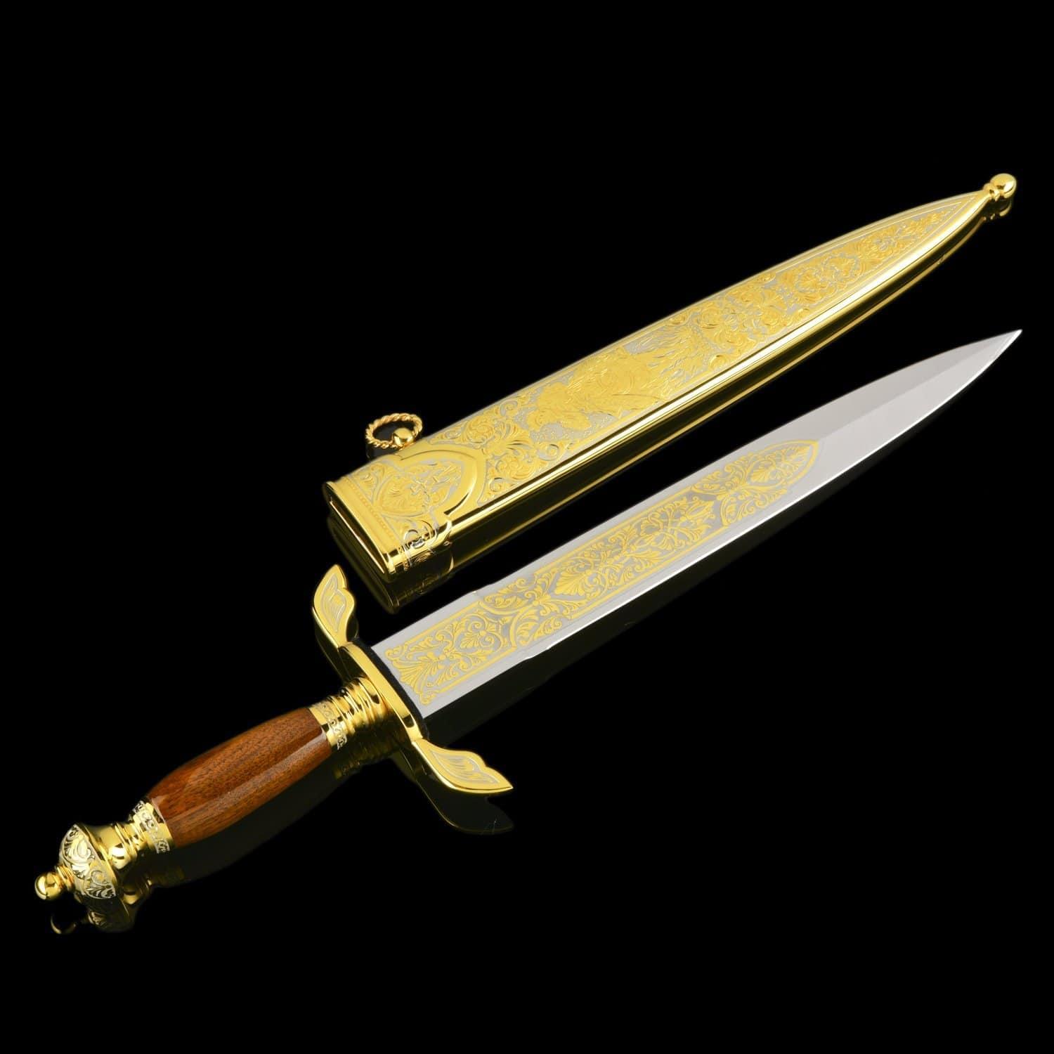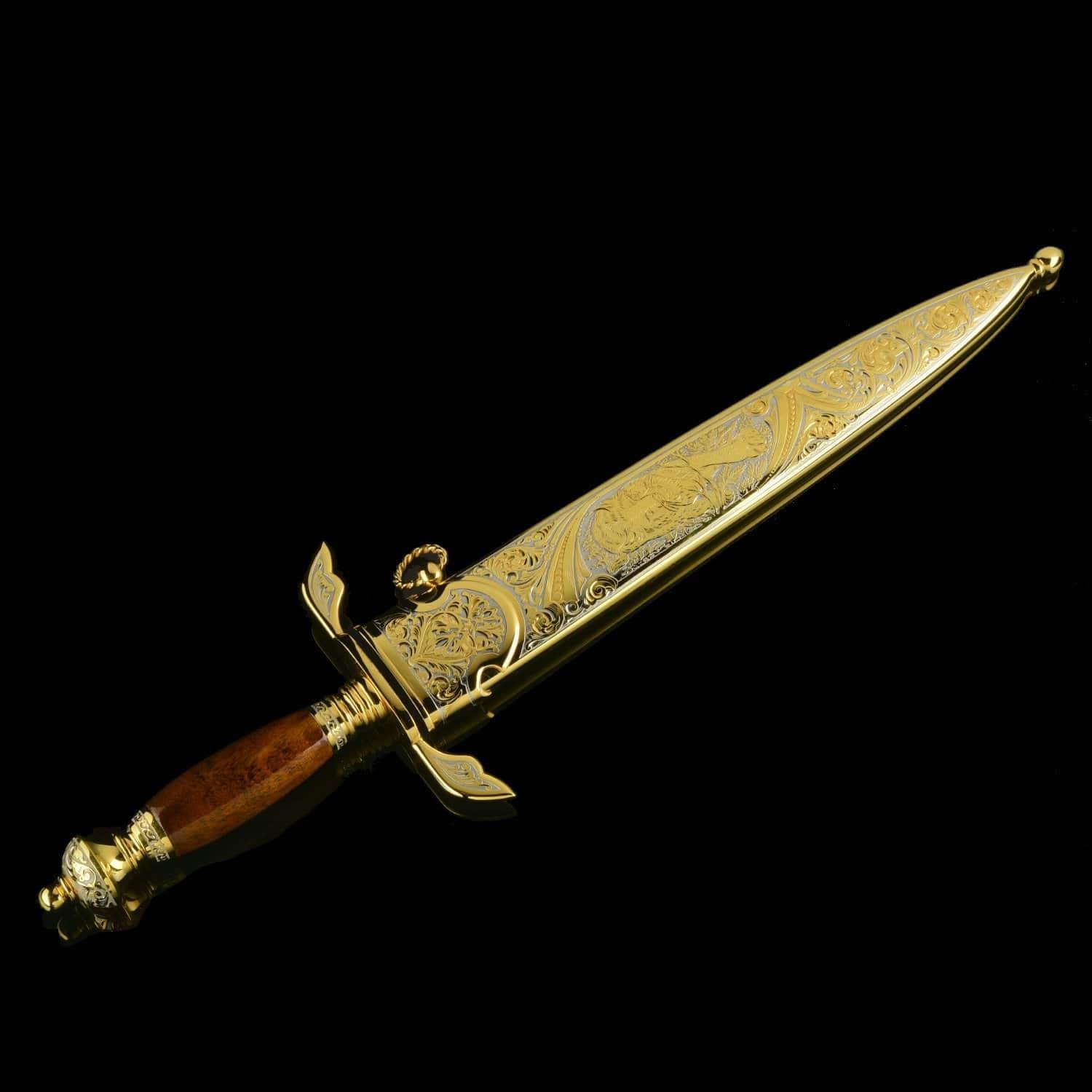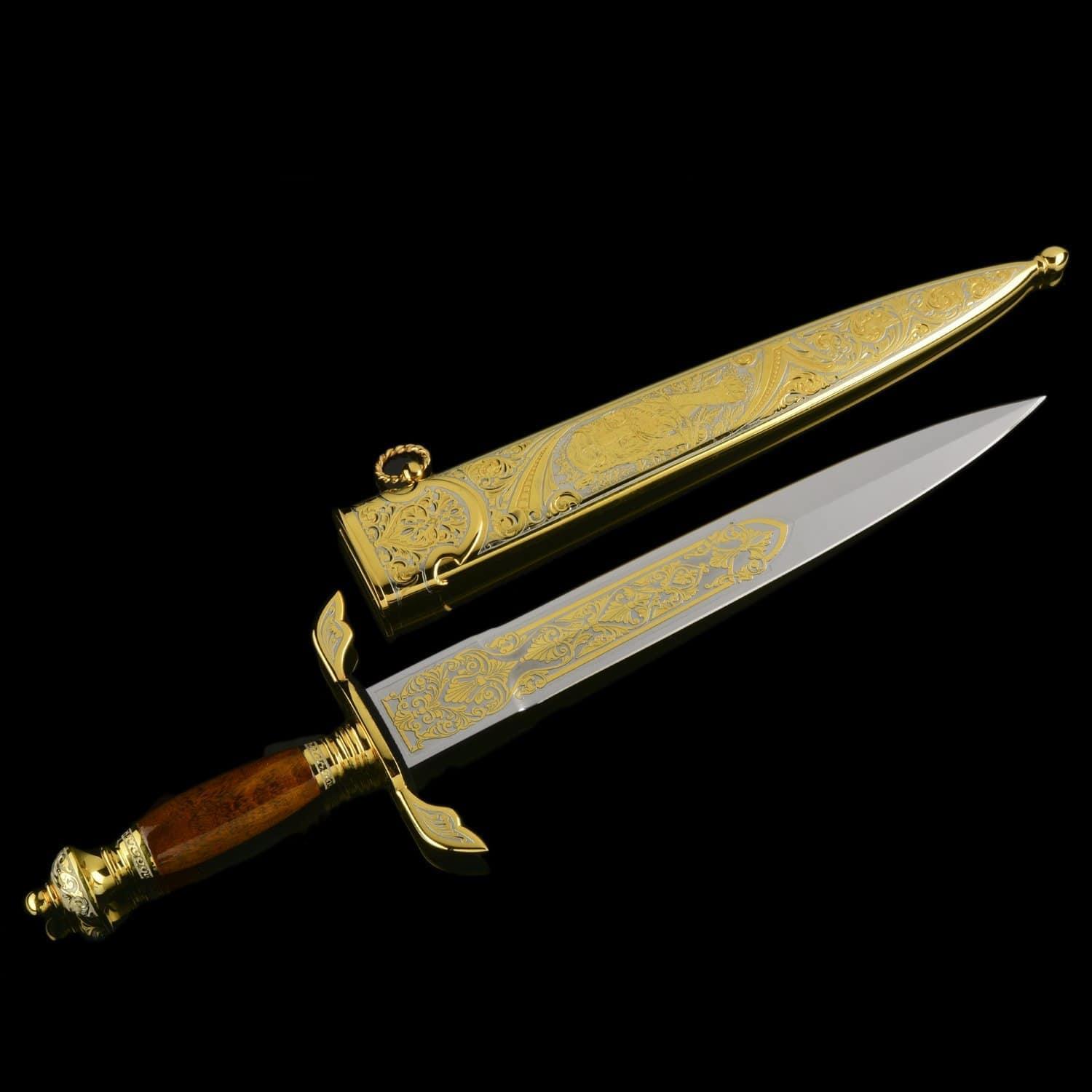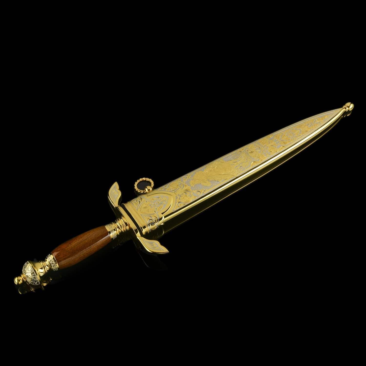 История кинжала насчитывает тысячелетия, а способ ведения боя с нанесением колющих ударов - один из самых эффективных. Кинжалы почитались во всех цивилизациях во всех странах мира. До 16 века кинжал был самым популярным видом холодного оружия после ножа, а в 16 стал уступать место шпаге. С древности кинжалы применялись для собственной защиты. Острые клинки использовались и в бытовой жизни. Каждый джигит имел при себе этот символ мужества, ответственности и готовности постоять за себя и свой род. Кавказские жители применяли боевые кинжалы уже в бронзовом веке. В Майкопском кургане у реки Белая археологи нашли погребальную камеру с тремя секторами из деревянных перегородок. В главном помещении находились останки мужчины с золотым украшением на голове, а также предметы быта, золотые и серебряные изделия, медные кавказские кинжалы. Знаменитый историк 13 века Рашид ад-Дин в своих работах рассказывает о нападении татаро-монгольских войск на Кавказ и вооруженном сопротивлении горцев. Горный ландшафт помогал защитникам родины: в промежутках меж гор они обезвреживали врагов «короткими мечами». Уже в 13 столетии острый и удобный кавказский кинжал был неизменным атрибутом кавказцев. В России 19 – начала 20 веков кинжалами вооружались сухопутные войска. С 1907 по 1917 год бебуты использовались жандармами нижних чинов, строевыми частями и крепостной жандармерией. Материал: сталь ЭИ-107 (40Х10С2М), никель, позолота. Размер: общий - 46 см. длина клинка - 32 см. ширина клинка - 4 см. ....Извините, товар отсутствует