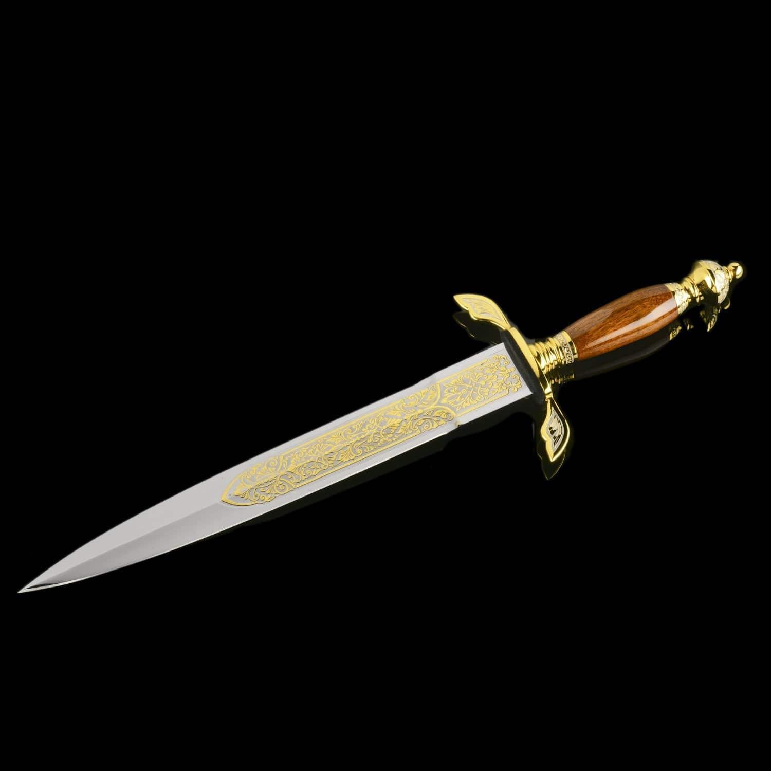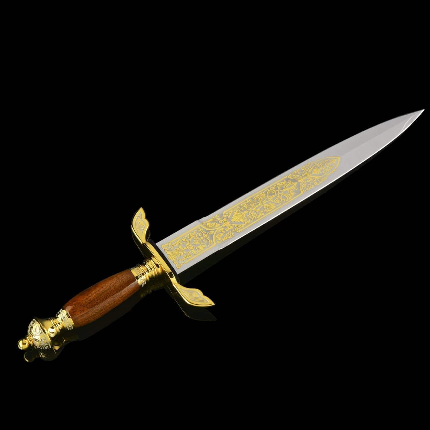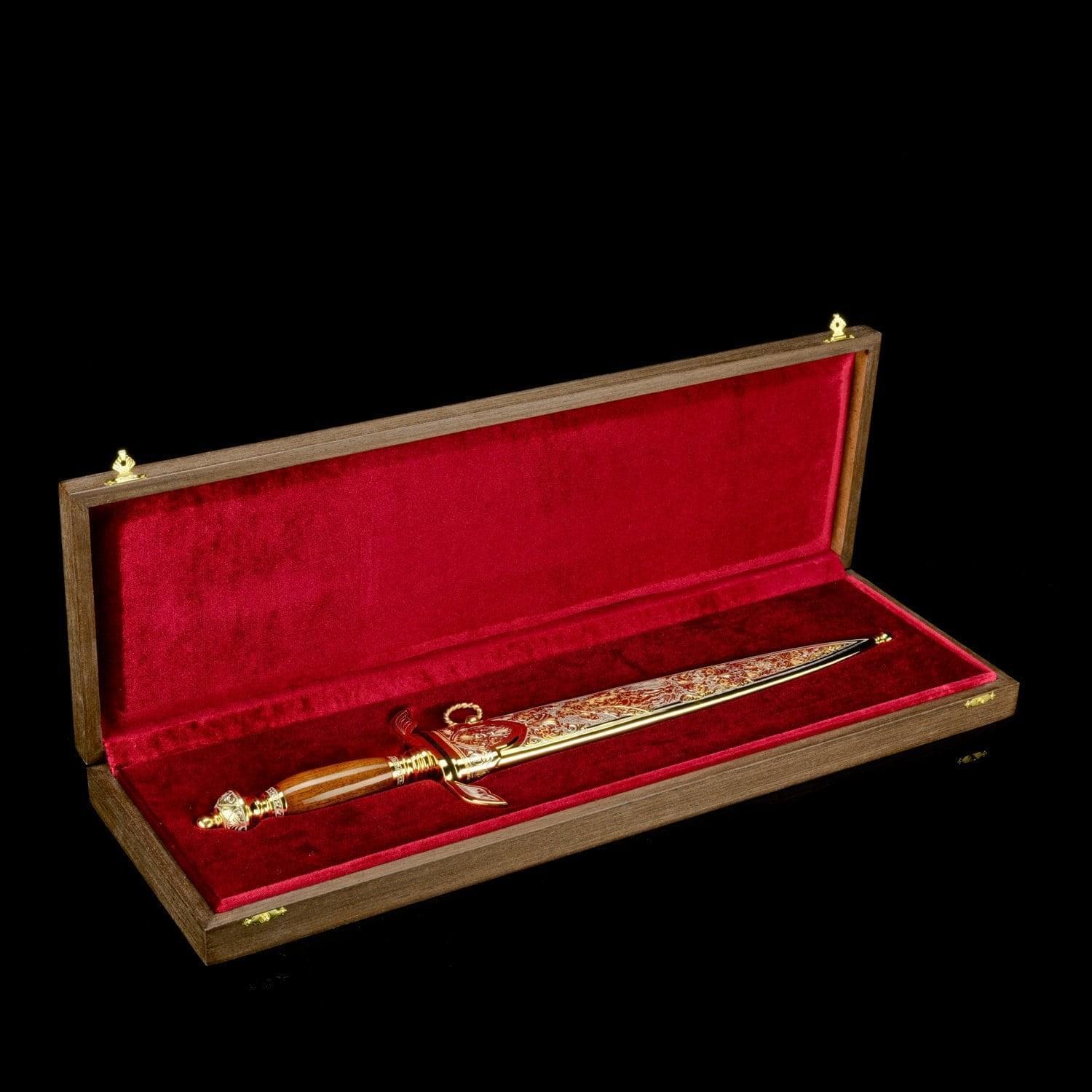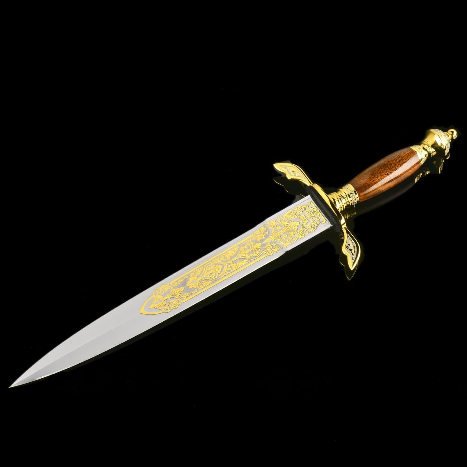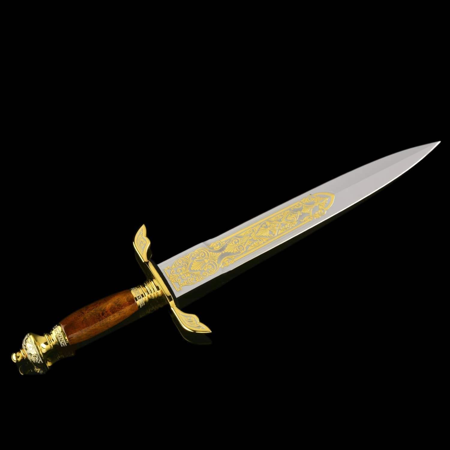 История кинжала насчитывает тысячелетия, а способ ведения боя с нанесением колющих ударов - один из самых эффективных. Кинжалы почитались во всех цивилизациях во всех странах мира. До 16 века кинжал был самым популярным видом холодного оружия после ножа, а в 16 стал уступать место шпаге. С древности кинжалы применялись для собственной защиты. Острые клинки использовались и в бытовой жизни. Каждый джигит имел при себе этот символ мужества, ответственности и готовности постоять за себя и свой род. Кавказские жители применяли боевые кинжалы уже в бронзовом веке. В Майкопском кургане у реки Белая археологи нашли погребальную камеру с тремя секторами из деревянных перегородок. В главном помещении находились останки мужчины с золотым украшением на голове, а также предметы быта, золотые и серебряные изделия, медные кавказские кинжалы. Знаменитый историк 13 века Рашид ад-Дин в своих работах рассказывает о нападении татаро-монгольских войск на Кавказ и вооруженном сопротивлении горцев. Горный ландшафт помогал защитникам родины: в промежутках меж гор они обезвреживали врагов «короткими мечами». Уже в 13 столетии острый и удобный кавказский кинжал был неизменным атрибутом кавказцев. В России 19 – начала 20 веков кинжалами вооружались сухопутные войска. С 1907 по 1917 год бебуты использовались жандармами нижних чинов, строевыми частями и крепостной жандармерией. Материал: сталь ЭИ-107 (40Х10С2М), никель, позолота. Размер: общий - 46 см. длина клинка - 32 см. ширина клинка - 4 см. ....Извините, товар отсутствует