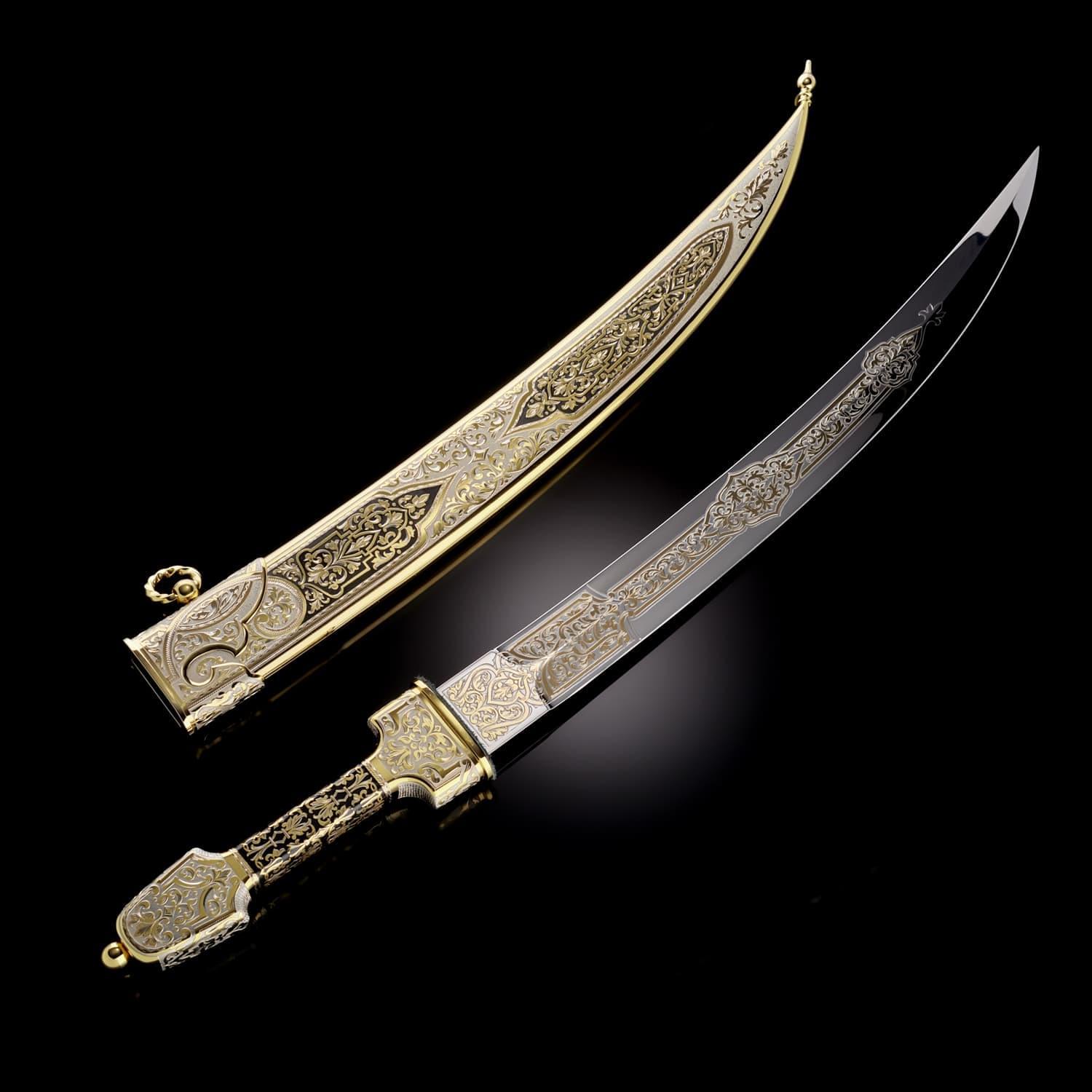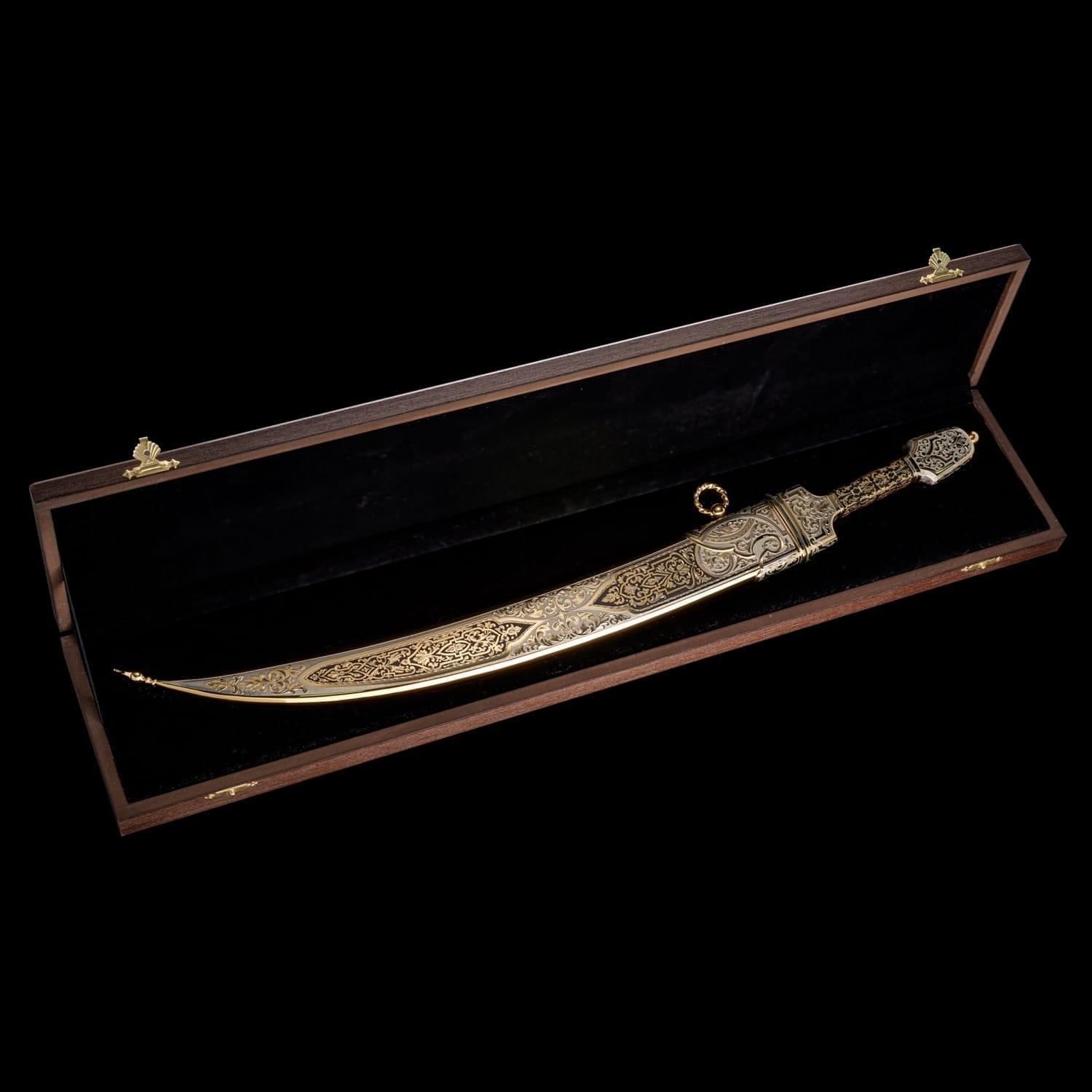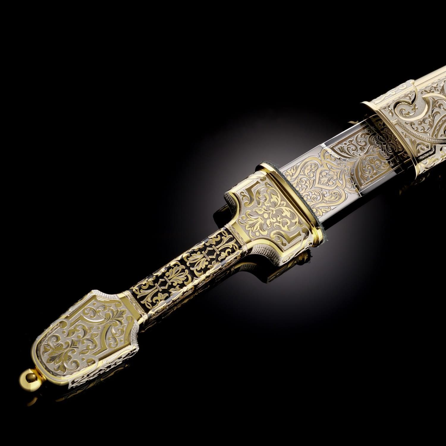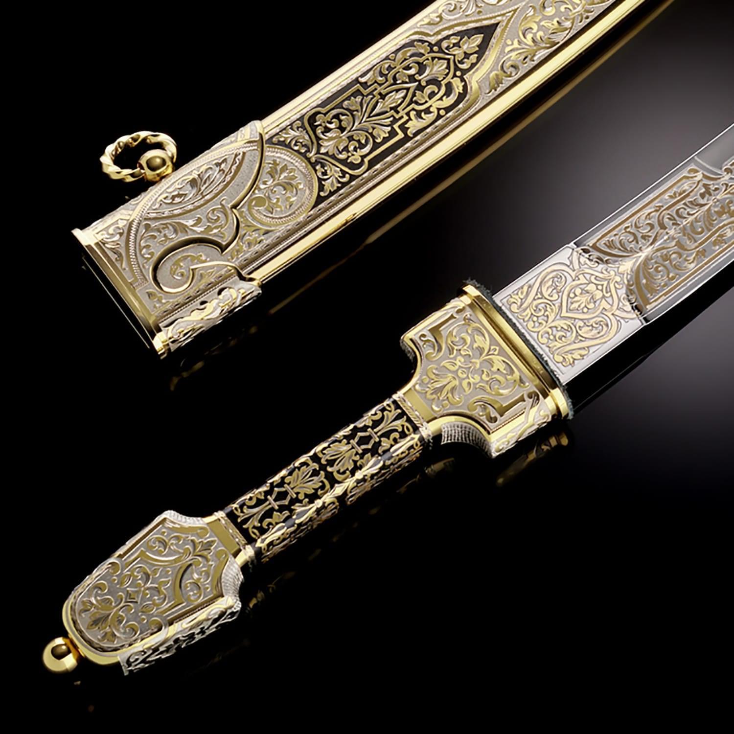 С древности кинжалы применялись для собственной защиты. Острые клинки использовались и в бытовой жизни. Каждый джигит имел при себе этот символ мужества, ответственности и готовности постоять за себя и свой род. Кавказские жители применяли боевые кинжалы уже в бронзовом веке. В Майкопском кургане у реки Белая археологи нашли погребальную камеру с тремя секторами из деревянных перегородок. В главном помещении находились останки мужчины с золотым украшением на голове, а также предметы быта, золотые и серебряные изделия, медные кавказские кинжалы. Знаменитый историк 13 века Рашид ад-Дин в своих работах рассказывает о нападении татаро-монгольских войск на Кавказ и вооруженном сопротивлении горцев. Горный ландшафт помогал защитникам родины: в промежутках меж гор они обезвреживали врагов «короткими мечами». Уже в 13 столетии острый и удобный кавказский кинжал был неизменным атрибутом кавказцев. В России 19 – начала 20 веков кинжалами вооружались сухопутные войска. Размеры: общая длина - 62 см. ширина - 6,5 см. длина клинка - 42 см. ширина клинка - 3,7 см. толщина клинка - 0,4 см. футляр: длина - 66,5 см. ширина - 13 см. высота - 4,5 см.Материалы: сталь ЭИ-107 (40Х10С2М), латунь, никель, золото 999,9*