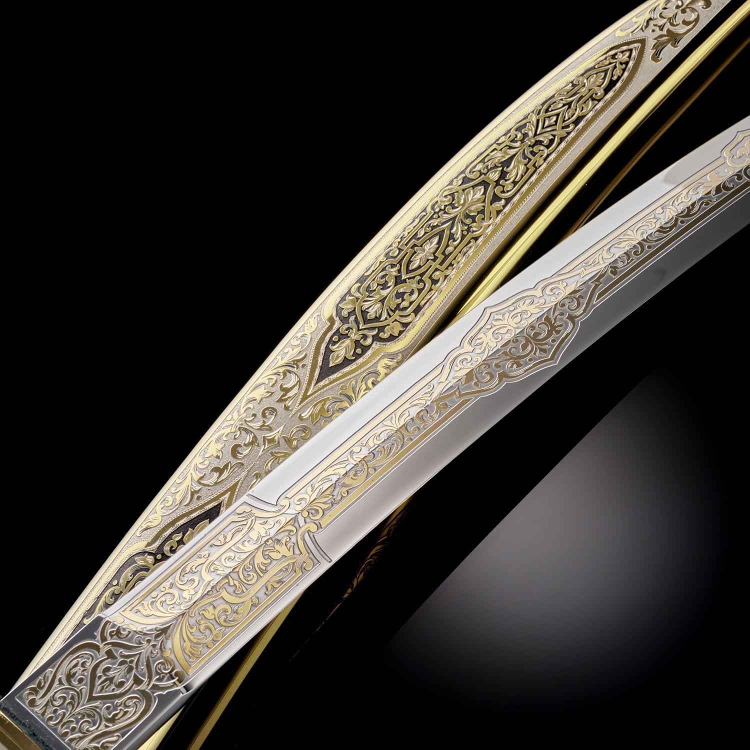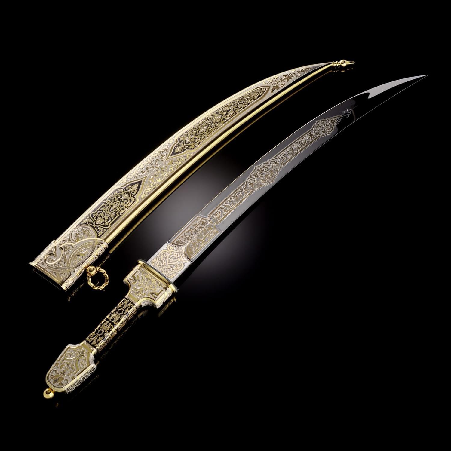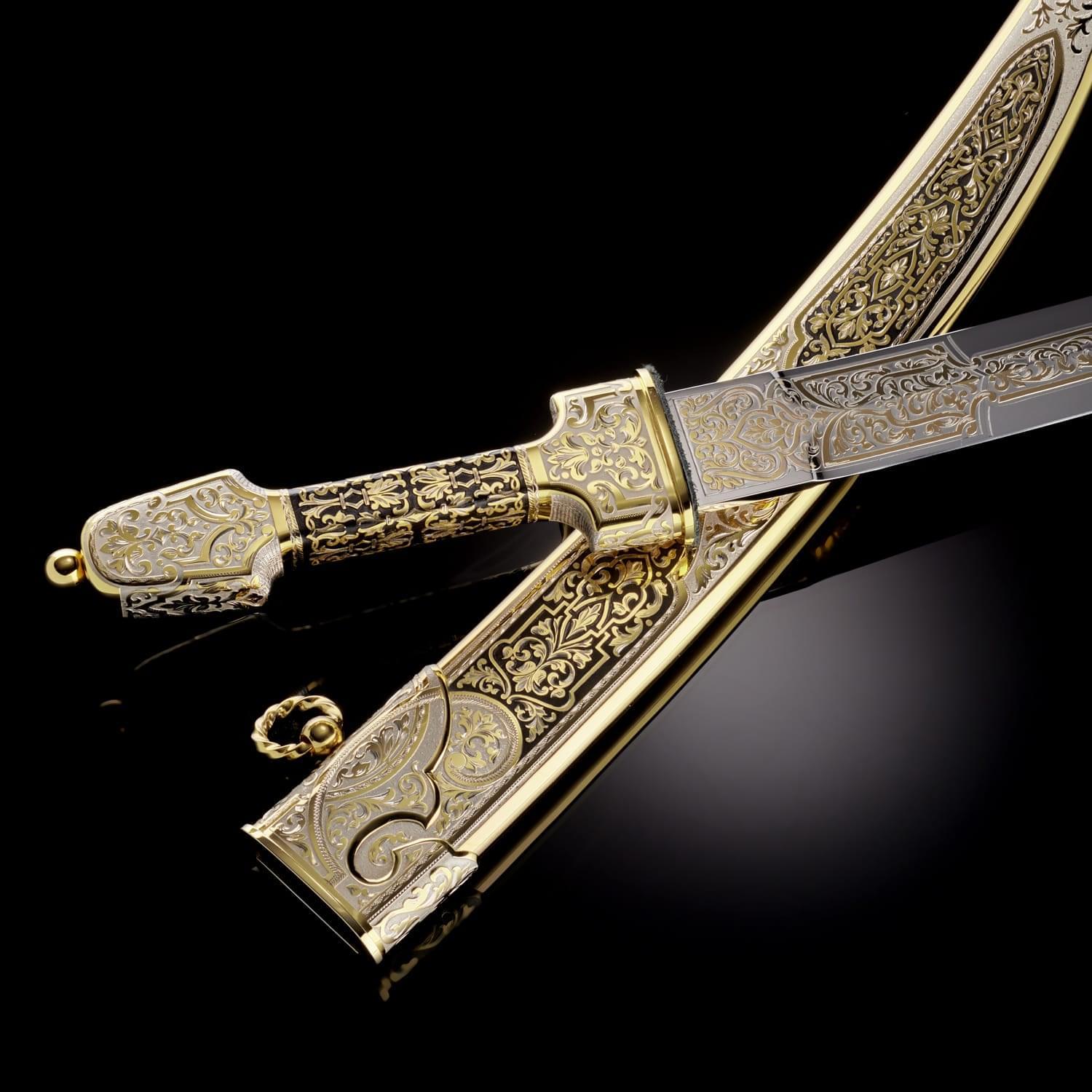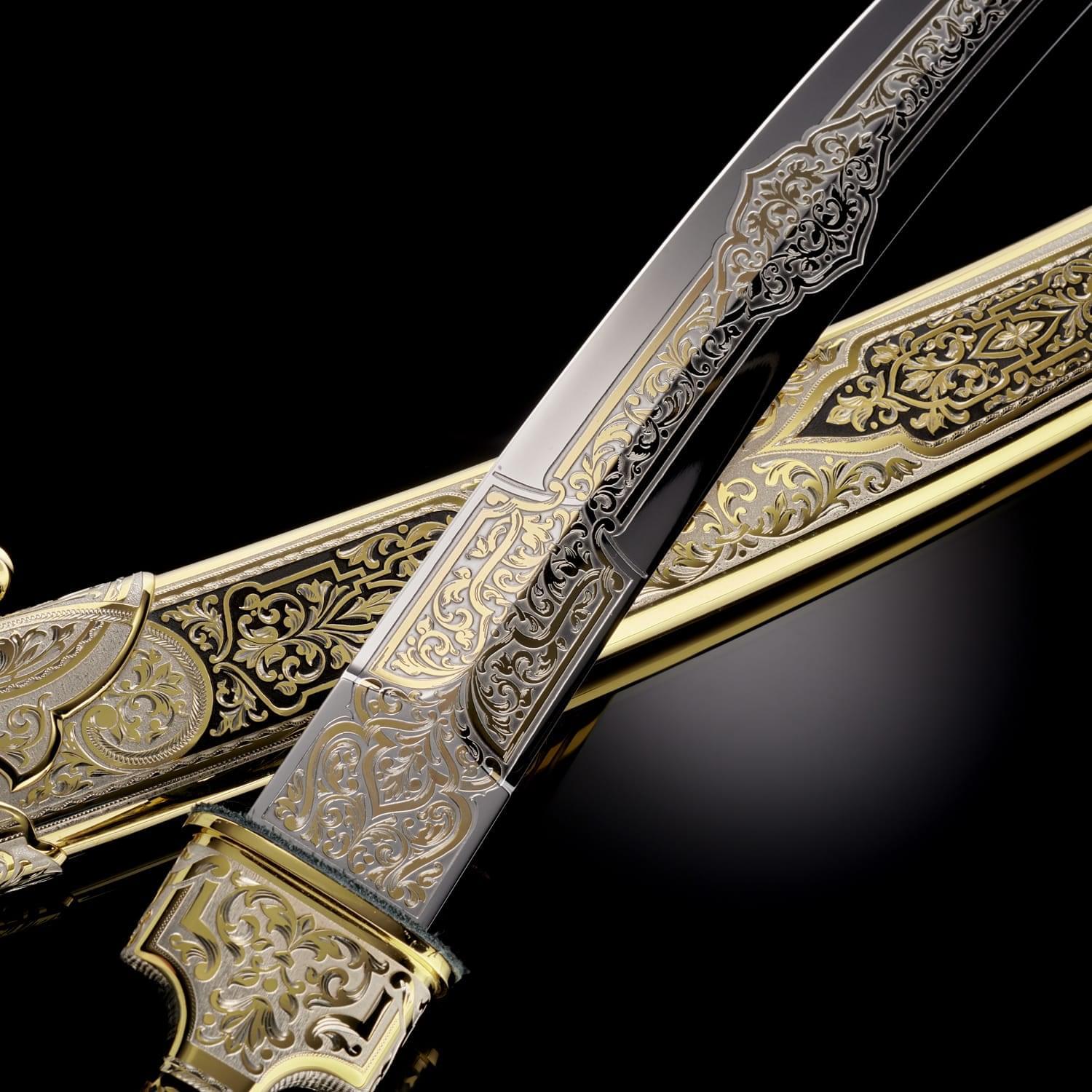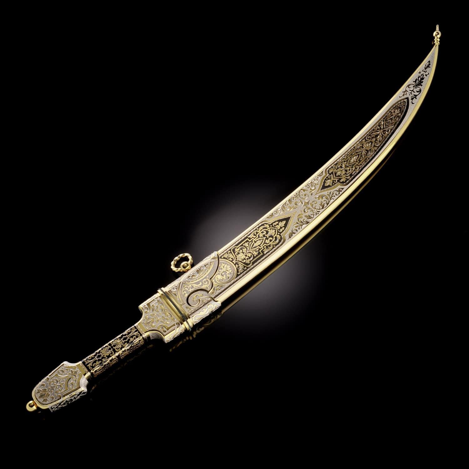 С древности кинжалы применялись для собственной защиты. Острые клинки использовались и в бытовой жизни. Каждый джигит имел при себе этот символ мужества, ответственности и готовности постоять за себя и свой род. Кавказские жители применяли боевые кинжалы уже в бронзовом веке. В Майкопском кургане у реки Белая археологи нашли погребальную камеру с тремя секторами из деревянных перегородок. В главном помещении находились останки мужчины с золотым украшением на голове, а также предметы быта, золотые и серебряные изделия, медные кавказские кинжалы. Знаменитый историк 13 века Рашид ад-Дин в своих работах рассказывает о нападении татаро-монгольских войск на Кавказ и вооруженном сопротивлении горцев. Горный ландшафт помогал защитникам родины: в промежутках меж гор они обезвреживали врагов «короткими мечами». Уже в 13 столетии острый и удобный кавказский кинжал был неизменным атрибутом кавказцев. В России 19 – начала 20 веков кинжалами вооружались сухопутные войска. Размеры: общая длина - 62 см. ширина - 6,5 см. длина клинка - 42 см. ширина клинка - 3,7 см. толщина клинка - 0,4 см. футляр: длина - 66,5 см. ширина - 13 см. высота - 4,5 см.Материалы: сталь ЭИ-107 (40Х10С2М), латунь, никель, золото 999,9*
