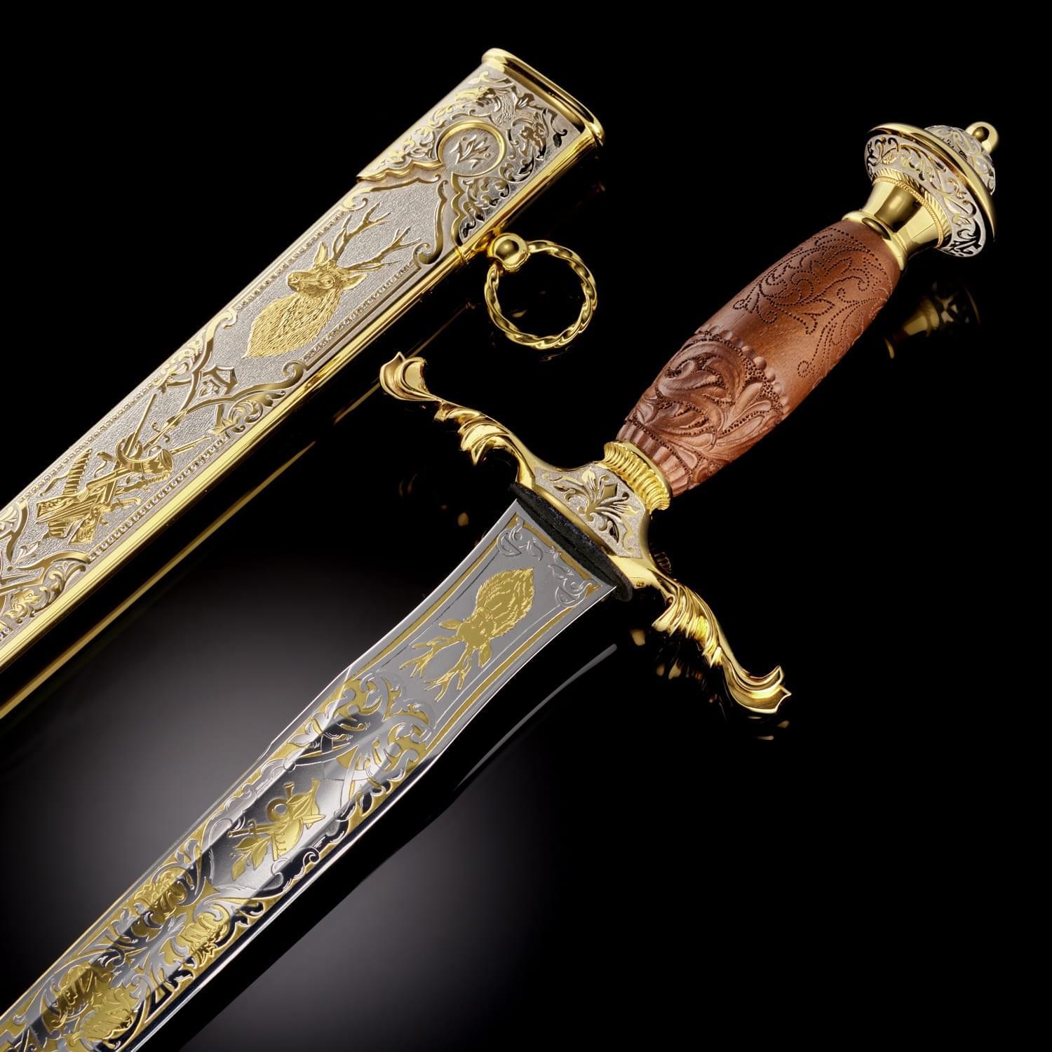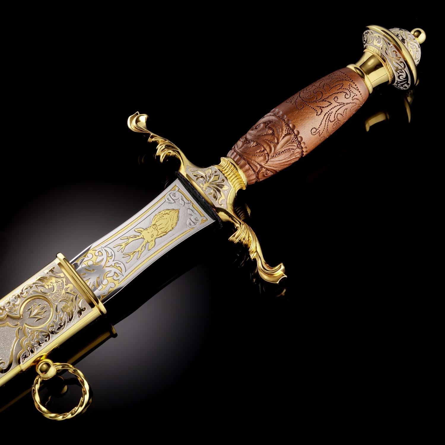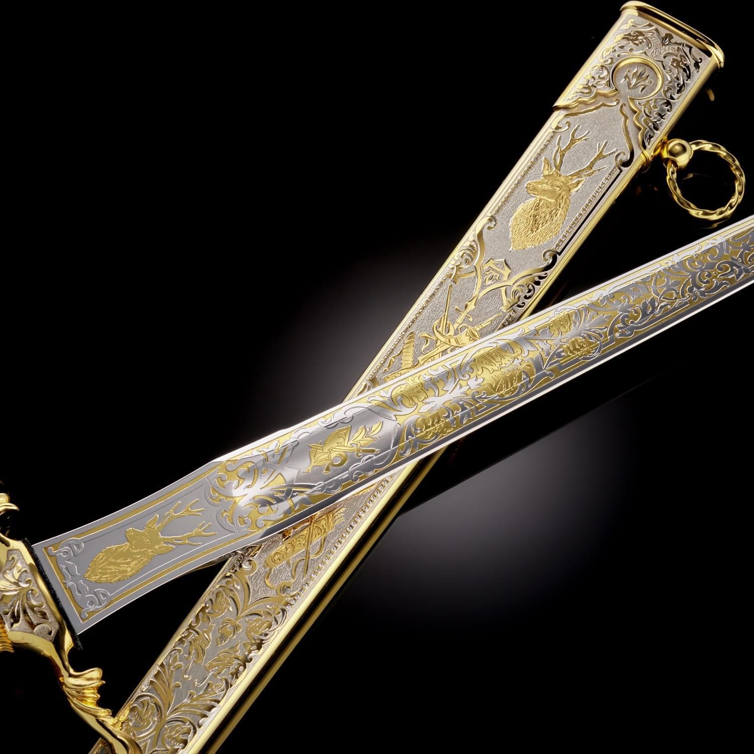 С середины XV века в Бургундии немецкоязычная знать пользовалась охотничьим мечом для добивания раненого зверя или самообороны. Это был больше статусный предмет, нежели элемент охотничьего костюма. Массивные мечи не имели эфесов, а их рукояти были так длинны, что оружием можно было действовать обеими руками. Имелись ножны с гнездами, где хранили два ножа (режущий и для разделки туши) и шило для отделения жил. Иногда добавляли гнезда для столовых приборов. В начале XVI века меч превратился в охотничий тесак, названный оленьим ножом (хиршфангер). Клинок укоротили и сделали легче. Рукоять изготавливали из рога оленя с крестовиной в виде ног косули. Хиршфангер распространился во всех германских государствах. Красота и изящество оленьего ножа привлекли и военных. Возрождение кинжал пережил во времена Третьего рейха. Оленьи ножи украсили униформы германских охотников и лесничих. Хиршфангеры выпускают в Германии и сегодня, металлические детали эфеса и прибор ножен делают из полированной латуни (под серебро), а ножны обтягивают черной или зеленоватой кожей. Материалы: сталь ЭИ-107 (40Х10С2М), латунь, никель, золото 999,9*, дерево. Размеры: общая длина - 61 см. ширина - 11,5 см. длина клинка - 40 см. ширина клинка - 2,7 см. толщина клинка - 0,4 см. футляр: длина - 64,5 см. ширина - 15,5 см. высота - 5,5 см. ....Извините, товар отсутствует