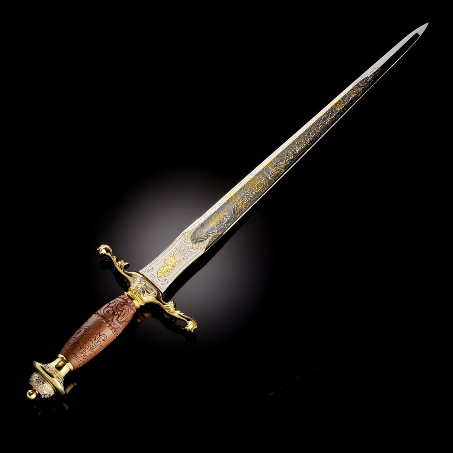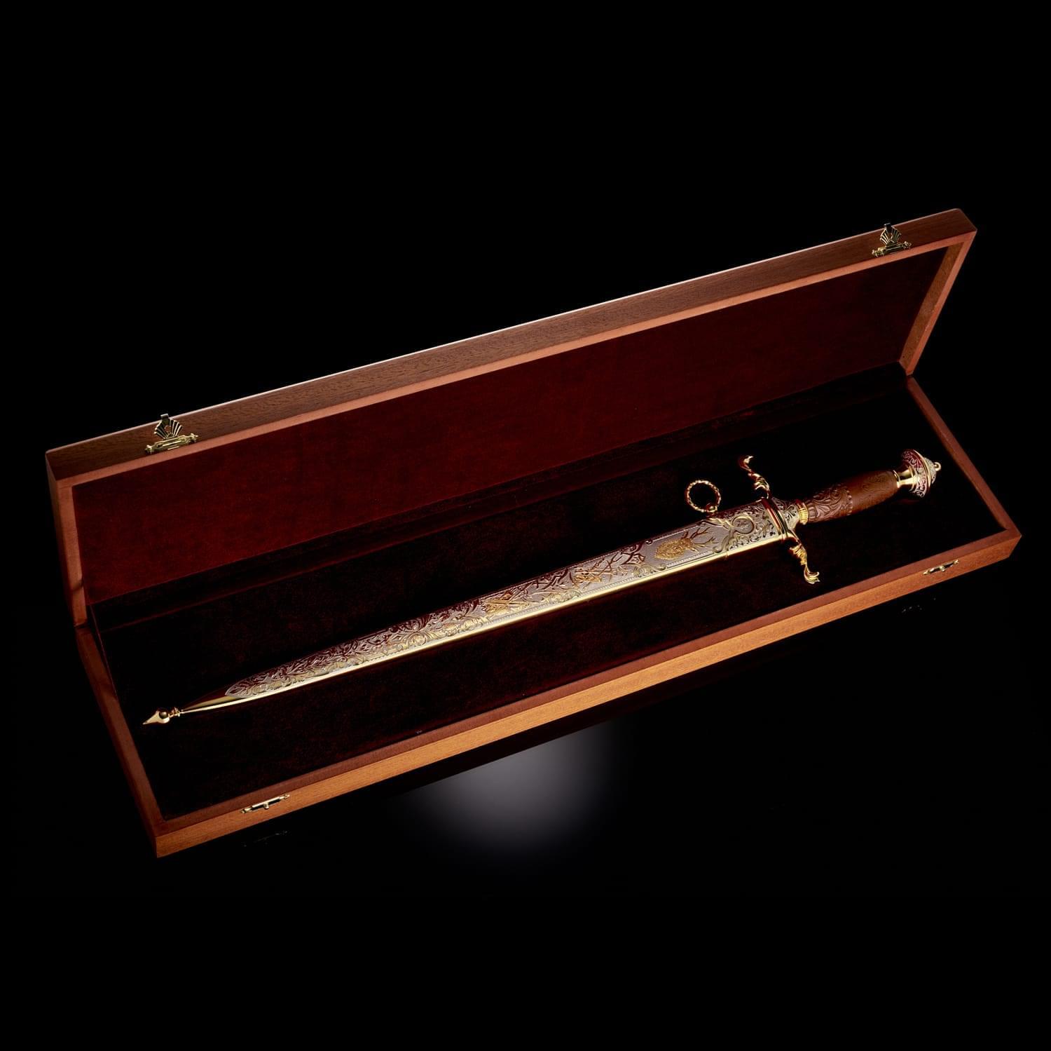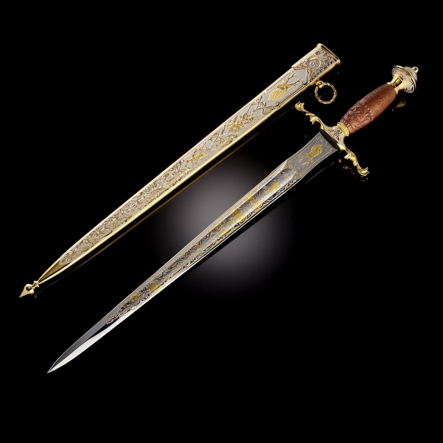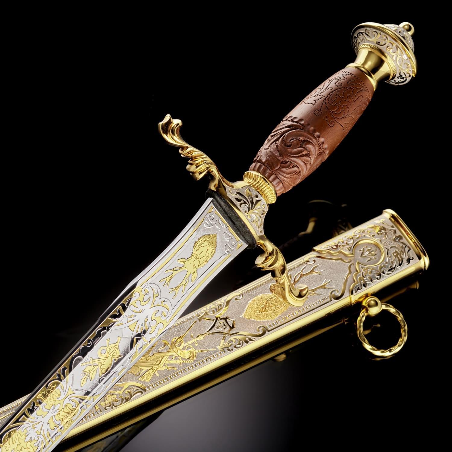 С середины XV века в Бургундии немецкоязычная знать пользовалась охотничьим мечом для добивания раненого зверя или самообороны. Это был больше статусный предмет, нежели элемент охотничьего костюма. Массивные мечи не имели эфесов, а их рукояти были так длинны, что оружием можно было действовать обеими руками. Имелись ножны с гнездами, где хранили два ножа (режущий и для разделки туши) и шило для отделения жил. Иногда добавляли гнезда для столовых приборов. В начале XVI века меч превратился в охотничий тесак, названный оленьим ножом (хиршфангер). Клинок укоротили и сделали легче. Рукоять изготавливали из рога оленя с крестовиной в виде ног косули. Хиршфангер распространился во всех германских государствах. Красота и изящество оленьего ножа привлекли и военных. Возрождение кинжал пережил во времена Третьего рейха. Оленьи ножи украсили униформы германских охотников и лесничих. Хиршфангеры выпускают в Германии и сегодня, металлические детали эфеса и прибор ножен делают из полированной латуни (под серебро), а ножны обтягивают черной или зеленоватой кожей. Материалы: сталь ЭИ-107 (40Х10С2М), латунь, никель, золото 999,9*, дерево. Размеры: общая длина - 61 см. ширина - 11,5 см. длина клинка - 40 см. ширина клинка - 2,7 см. толщина клинка - 0,4 см. футляр: длина - 64,5 см. ширина - 15,5 см. высота - 5,5 см. ....Извините, товар отсутствует