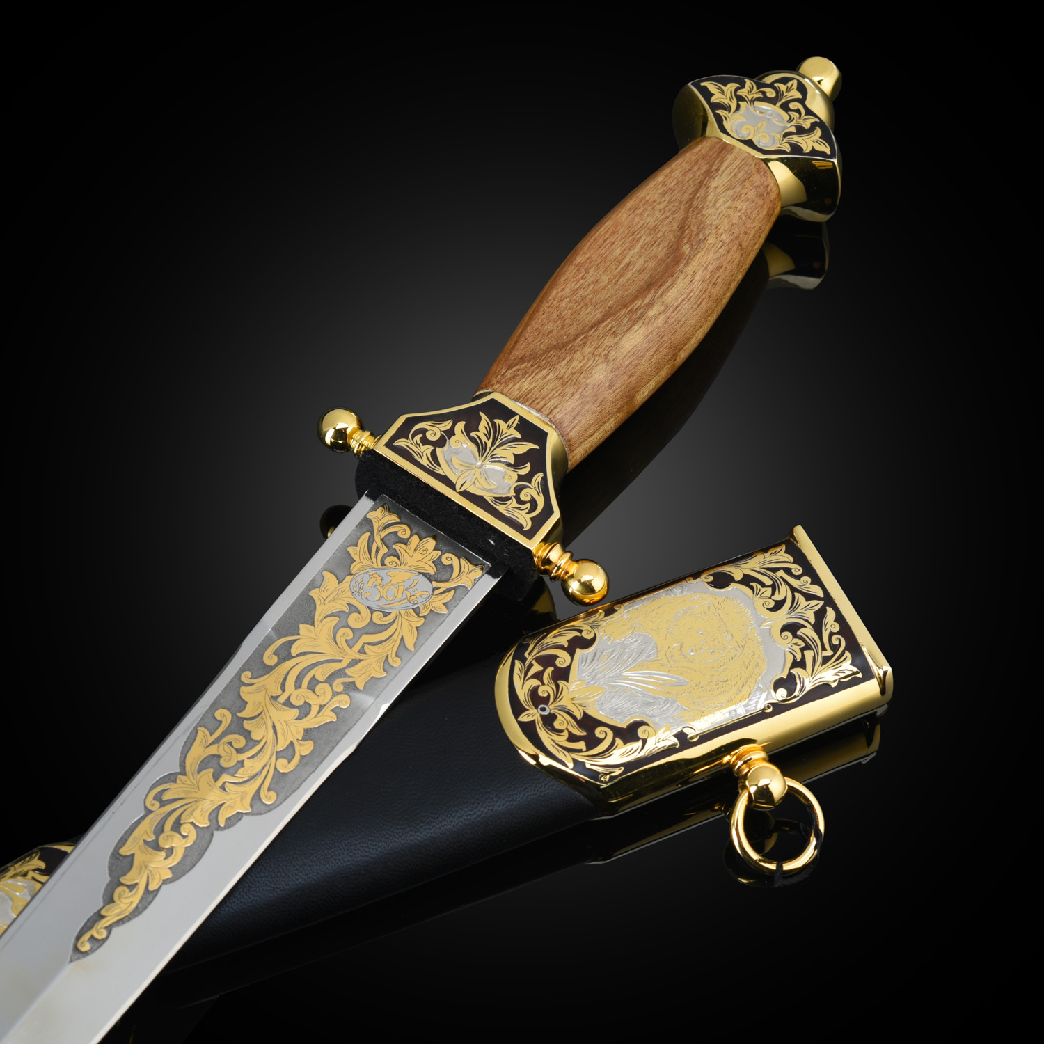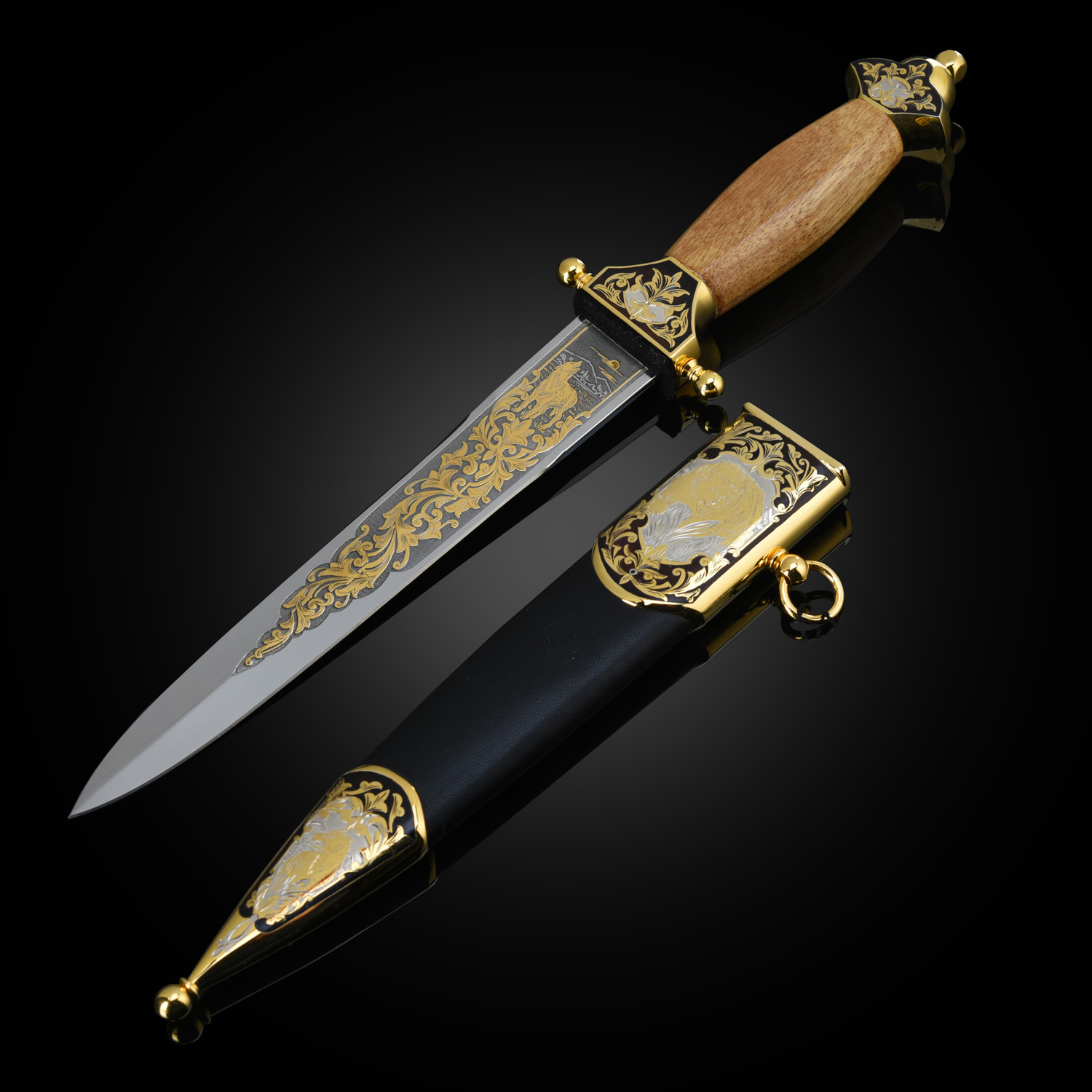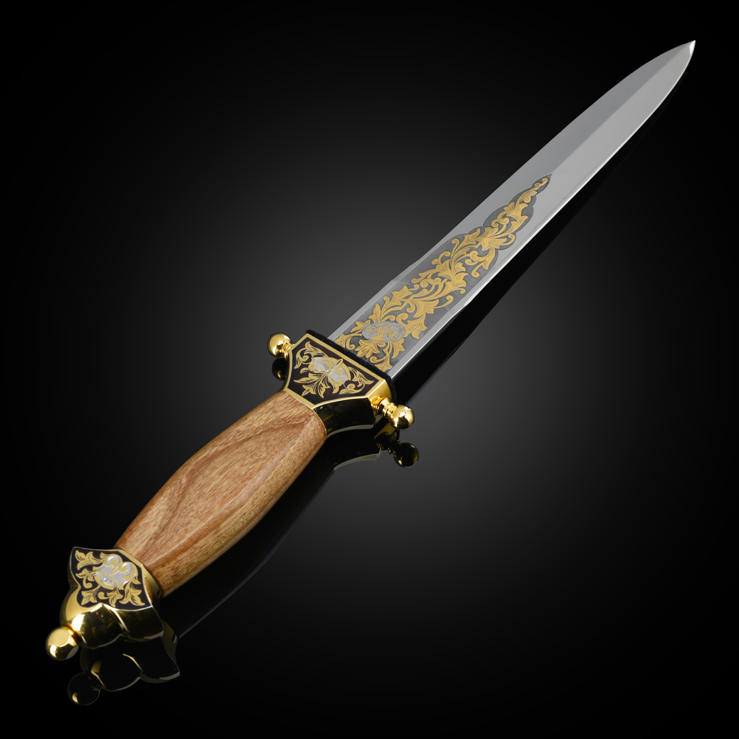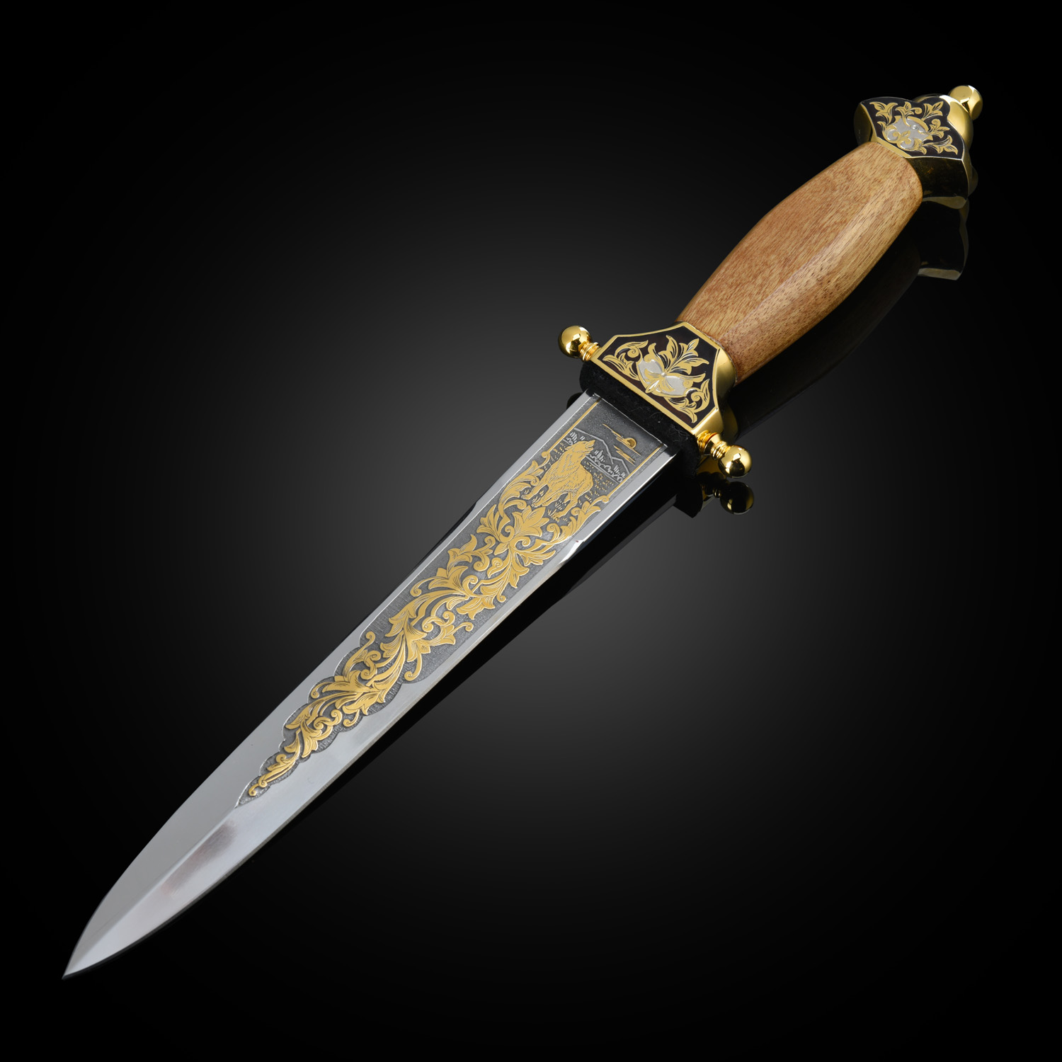 Кинжал сувенирный "Пограничник". Златоуст.Материалы: сталь ЭИ-107, латунь, никель, золото 999,9*, чернение, орех.