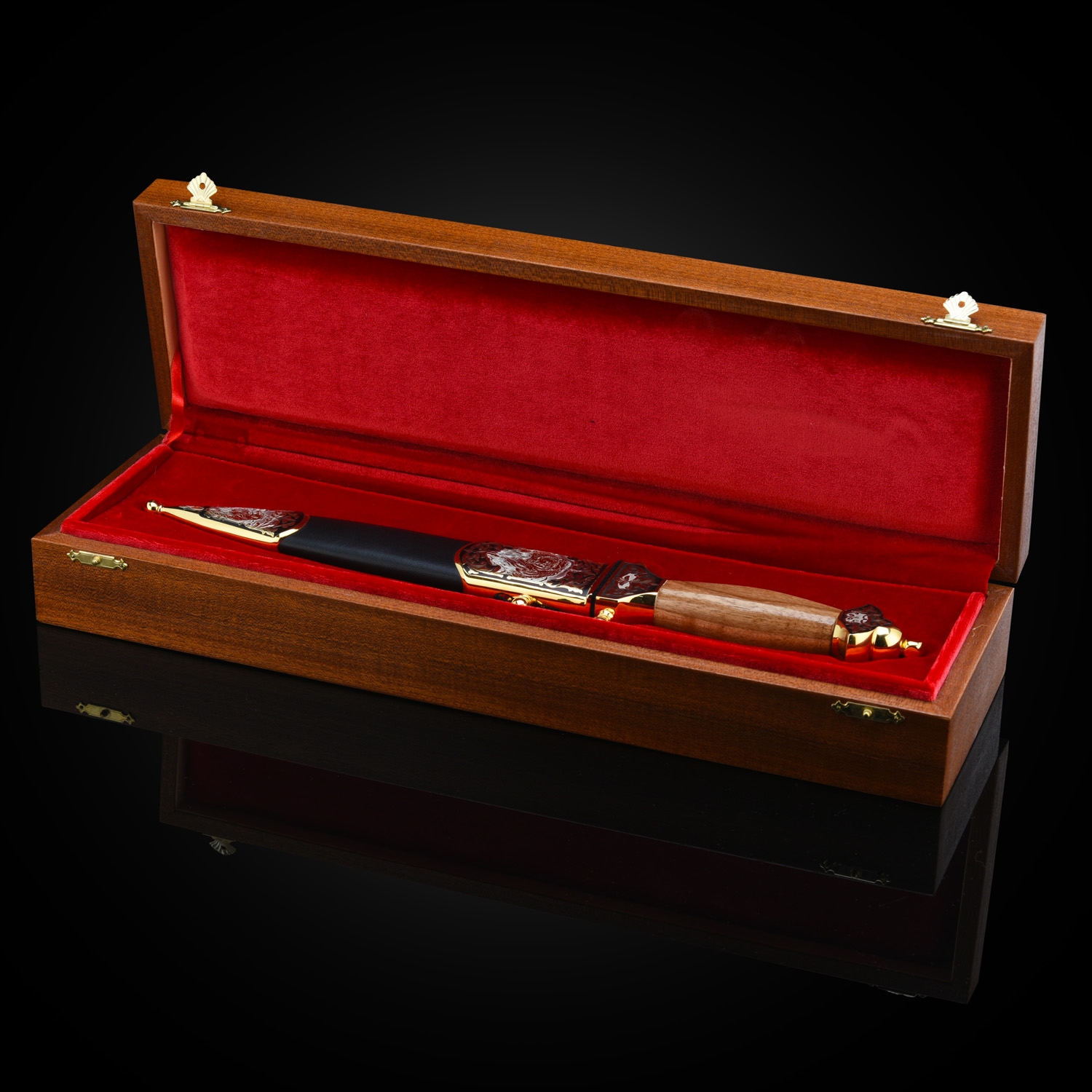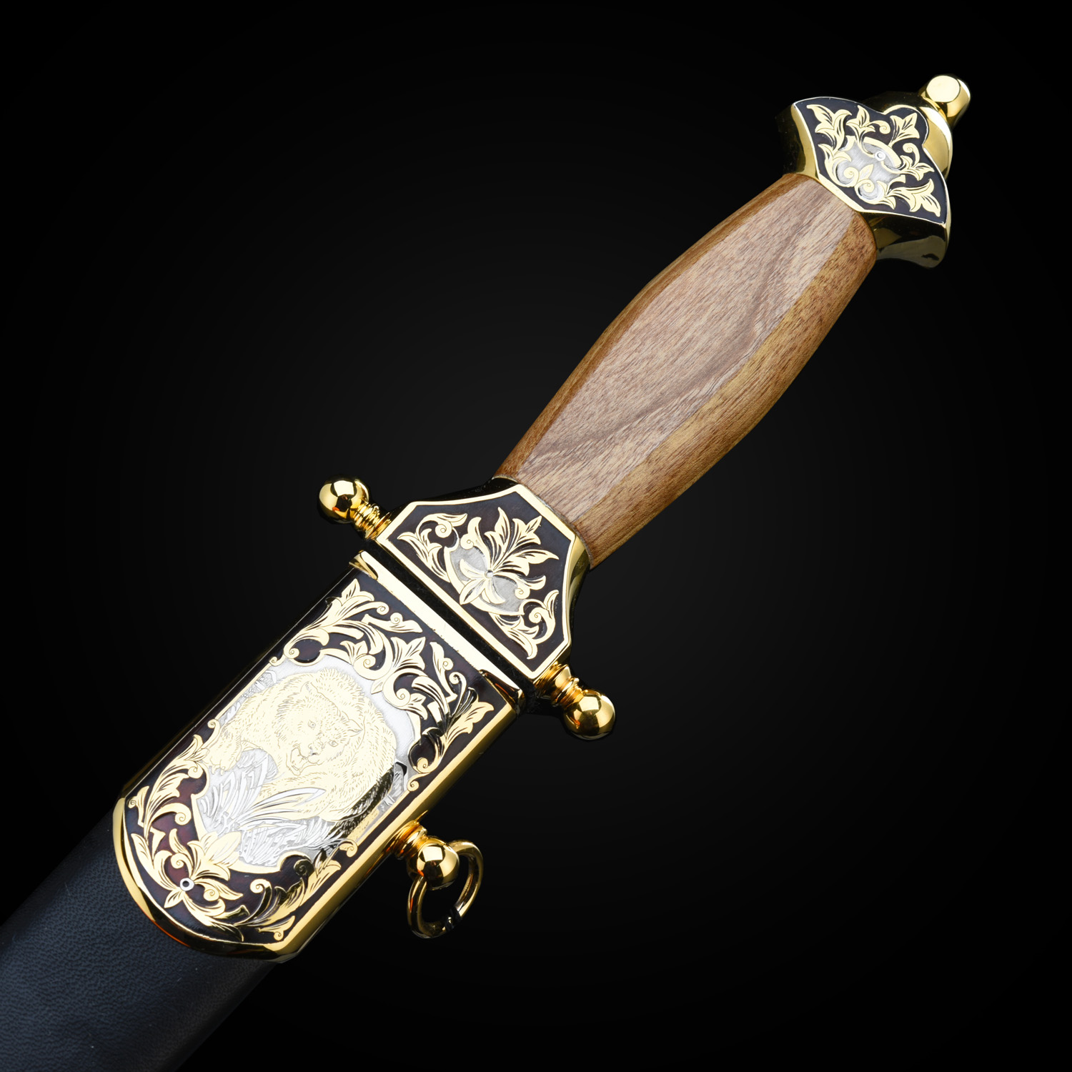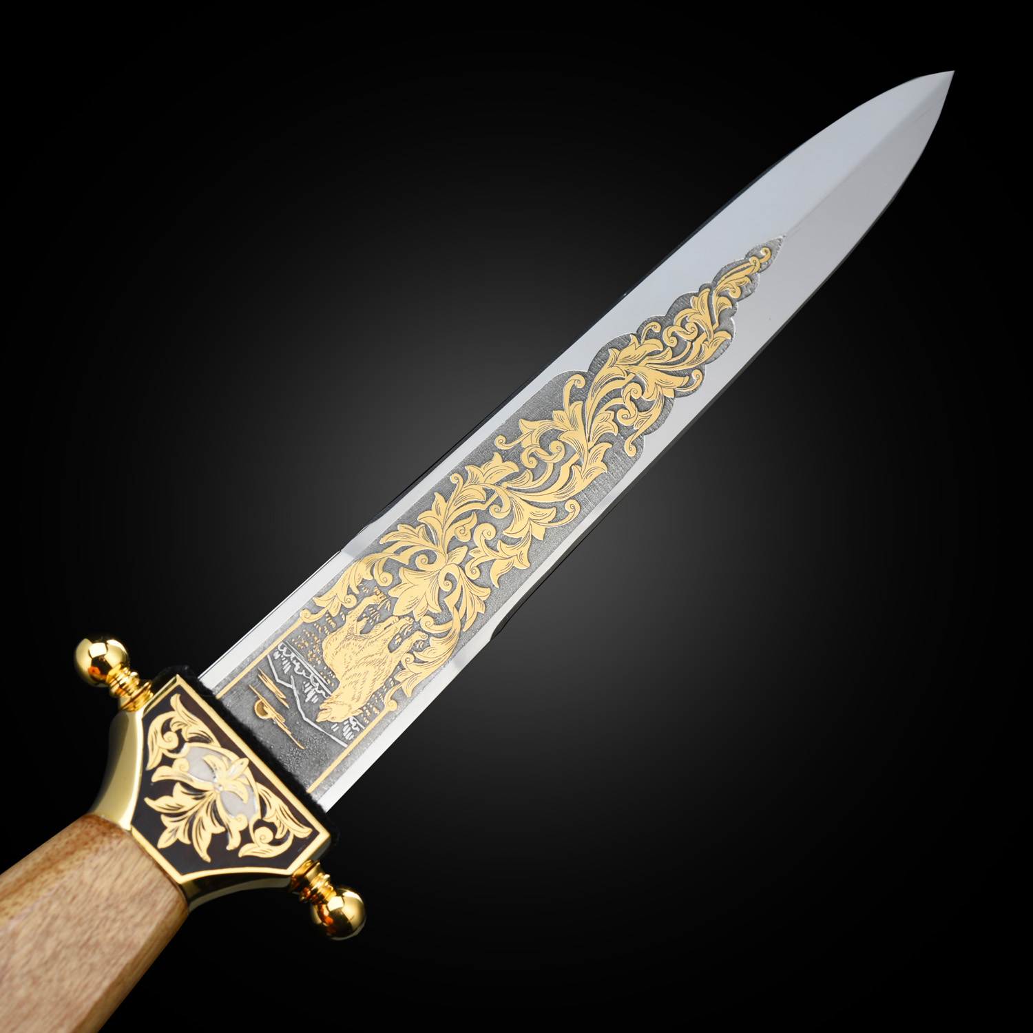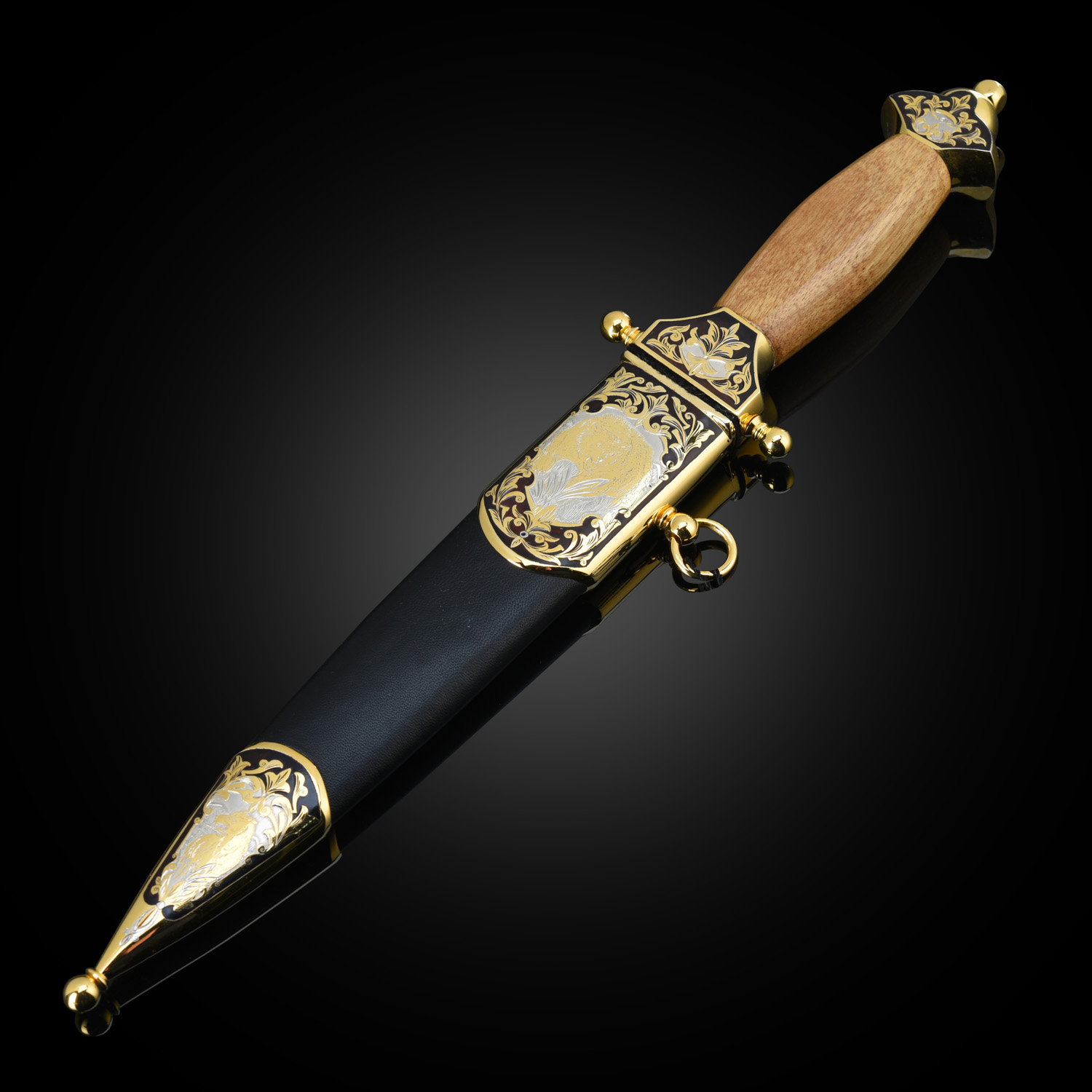 Кинжал сувенирный "Пограничник". Златоуст.Материалы: сталь ЭИ-107, латунь, никель, золото 999,9*, чернение, орех.