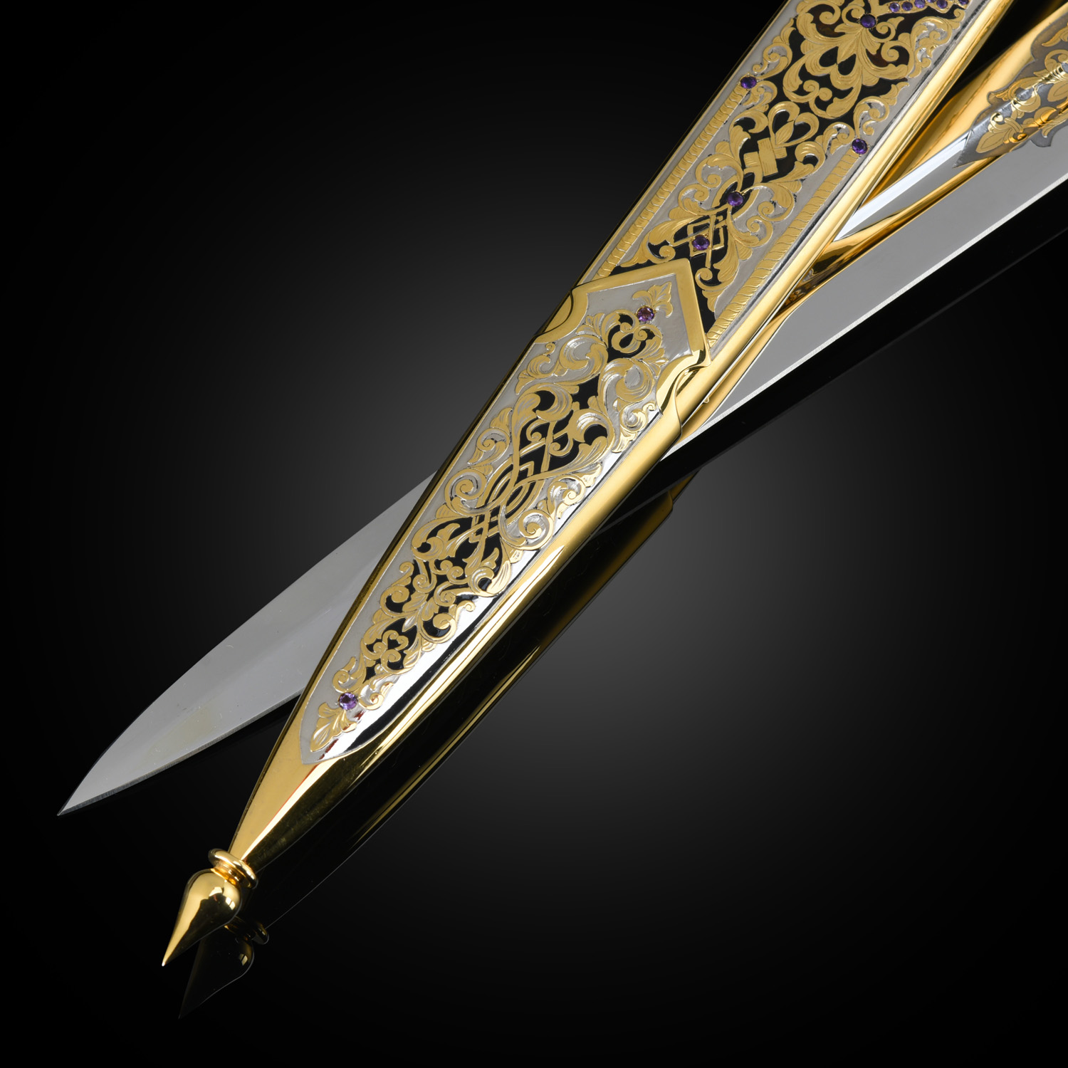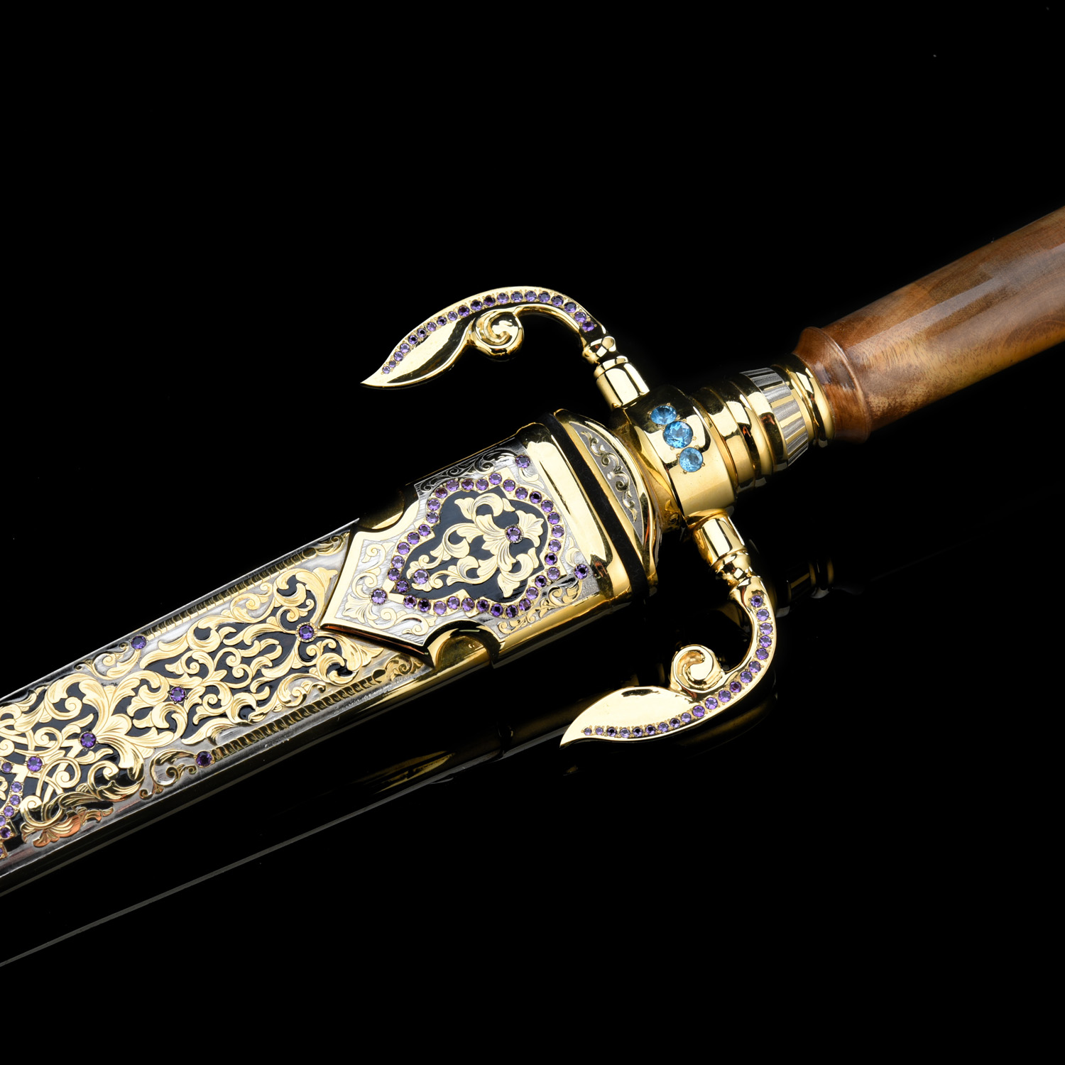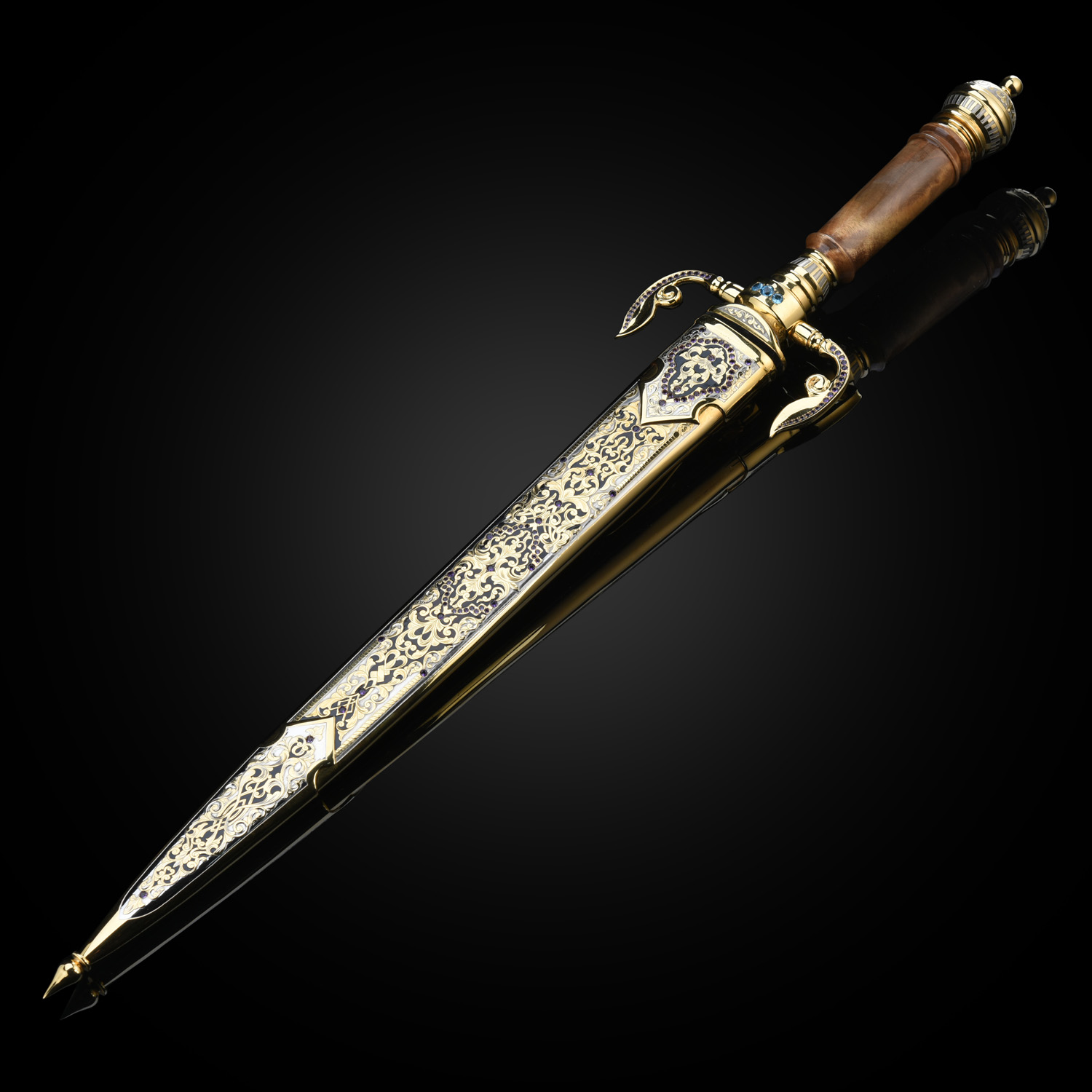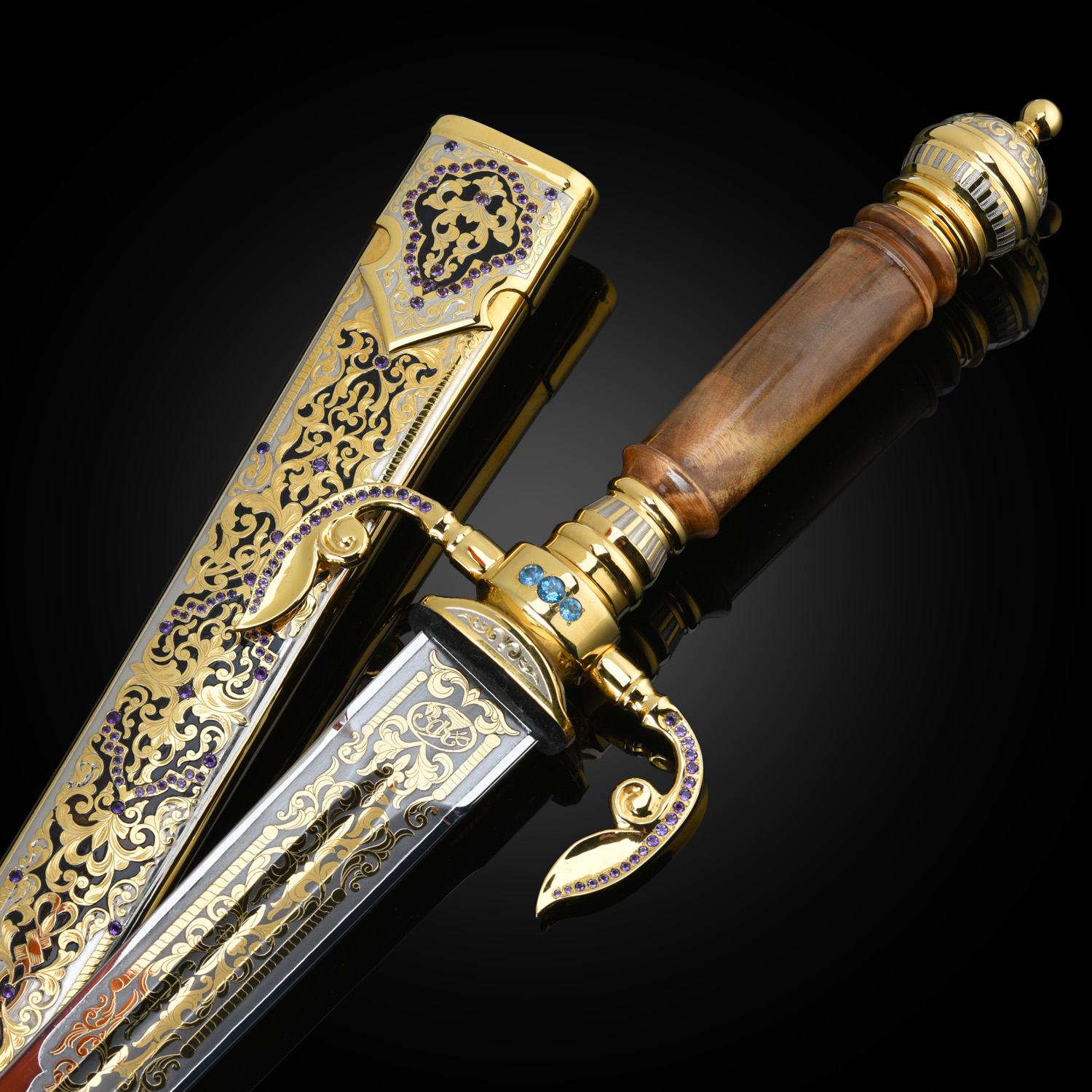 Кинжал сувенирный. Златоуст.Материалы: сталь ЭИ-107, латунь, никель, золото 999,9*, кап, аметист, топаз.