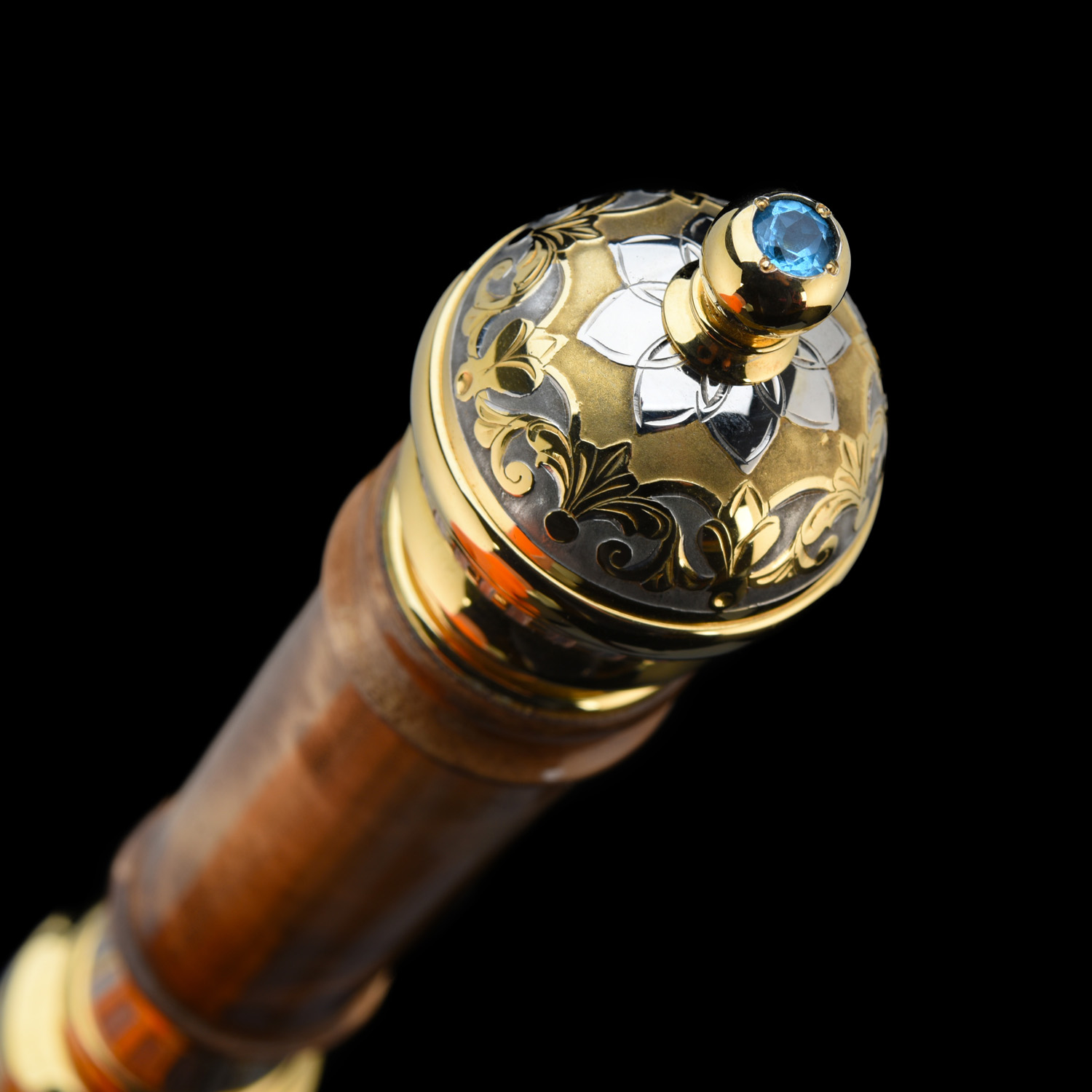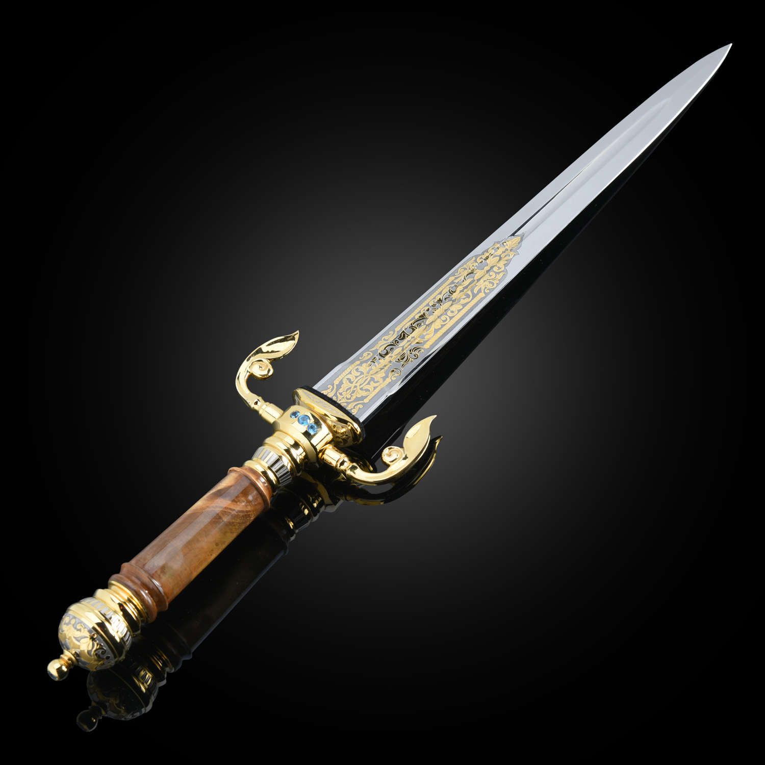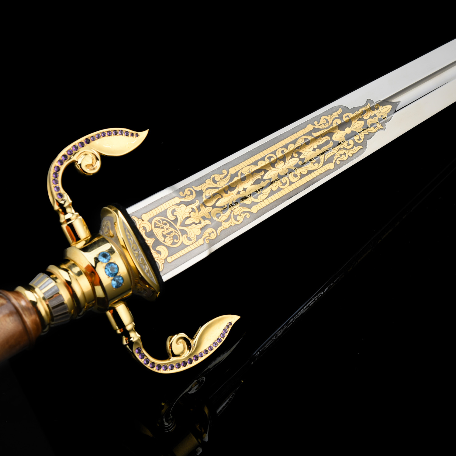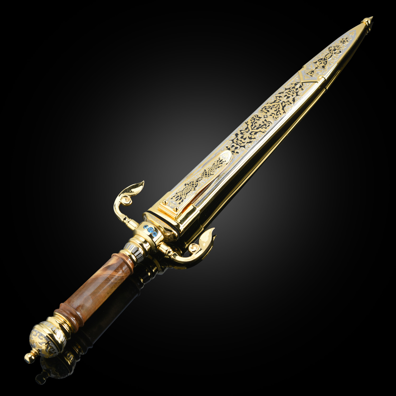 Кинжал сувенирный. Златоуст.Материалы: сталь ЭИ-107, латунь, никель, золото 999,9*, кап, аметист, топаз.