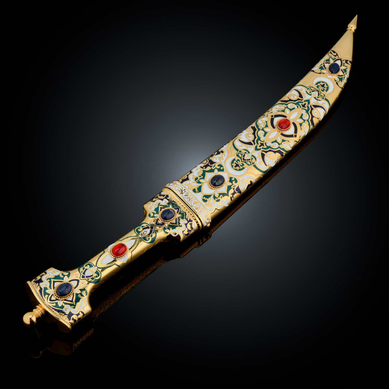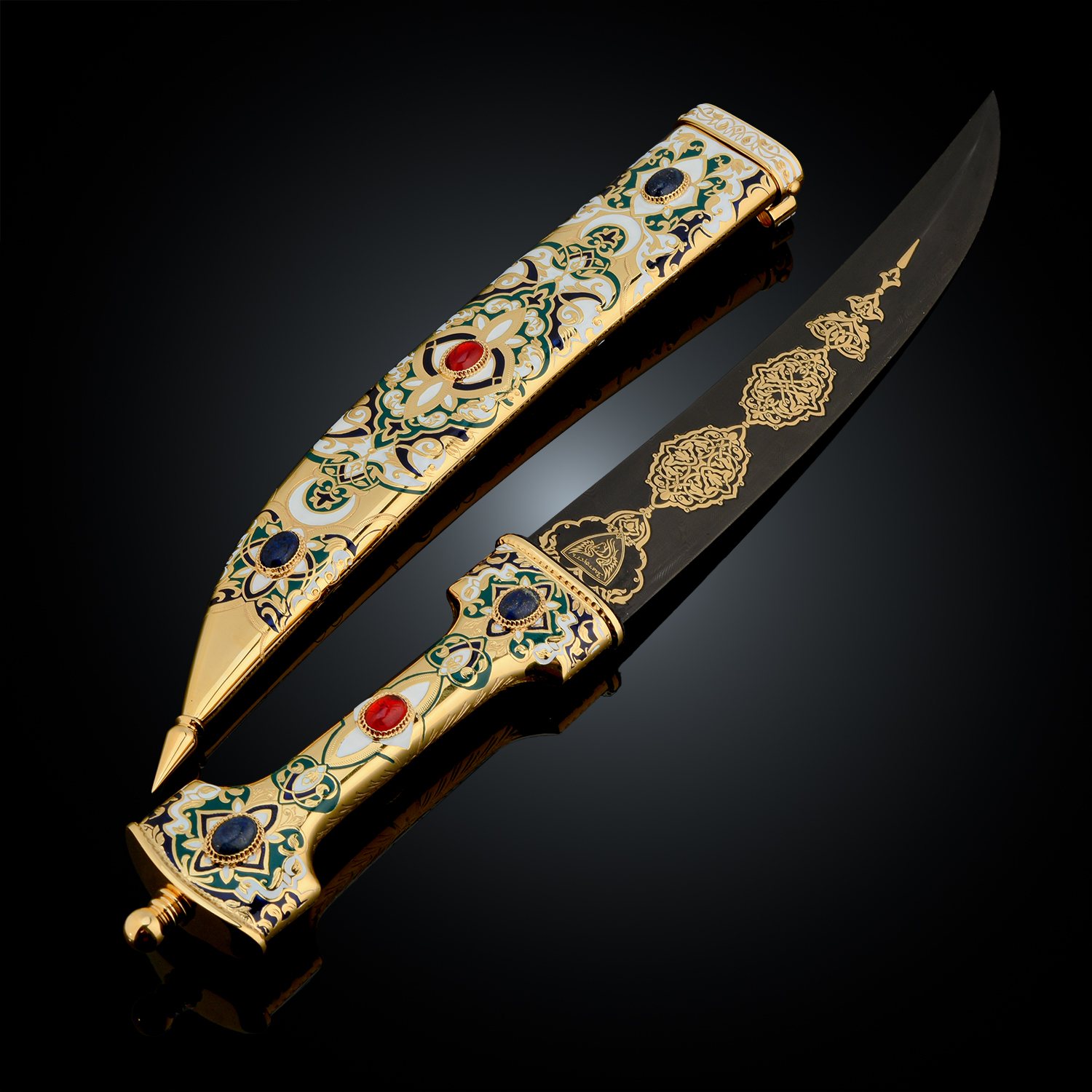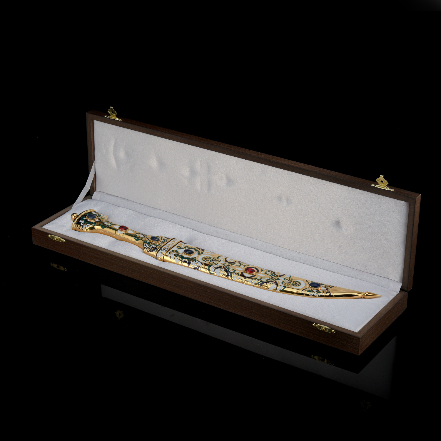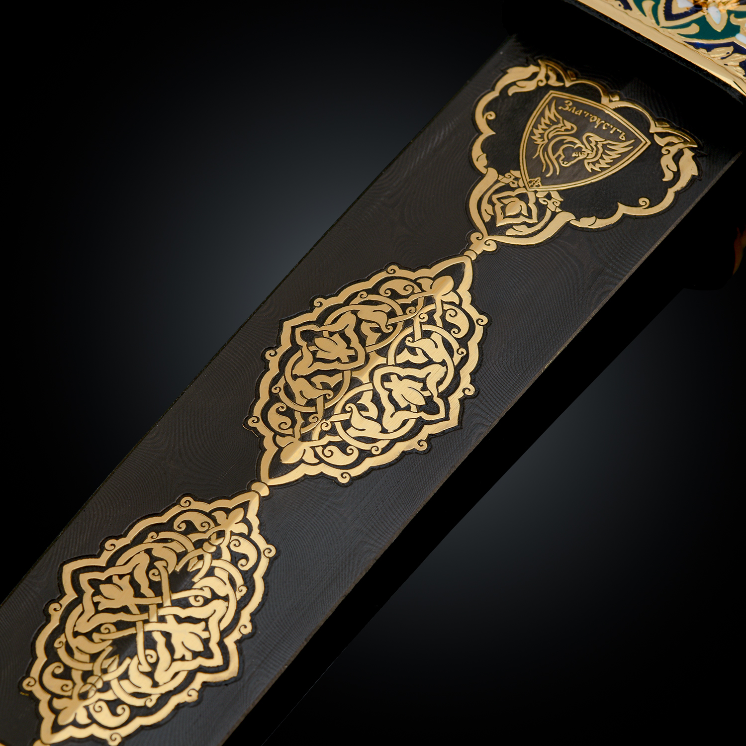 Кинжал сувенирный "Бебут". Златоуст.Материалы: дамасская сталь, латунь, никель, золото 999,9*, эмаль, кабошоны.