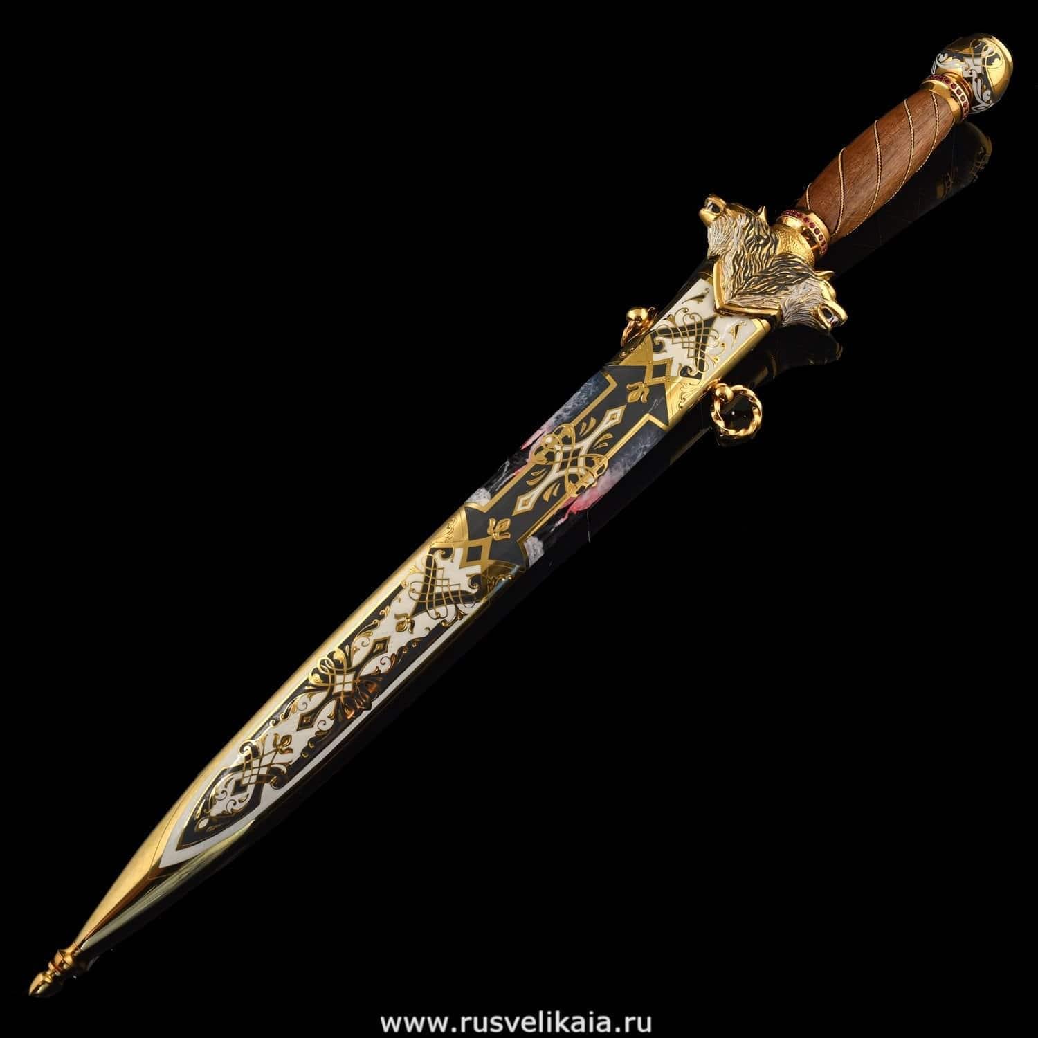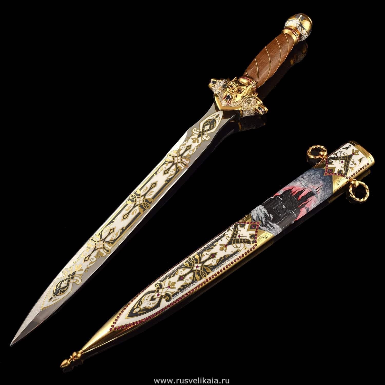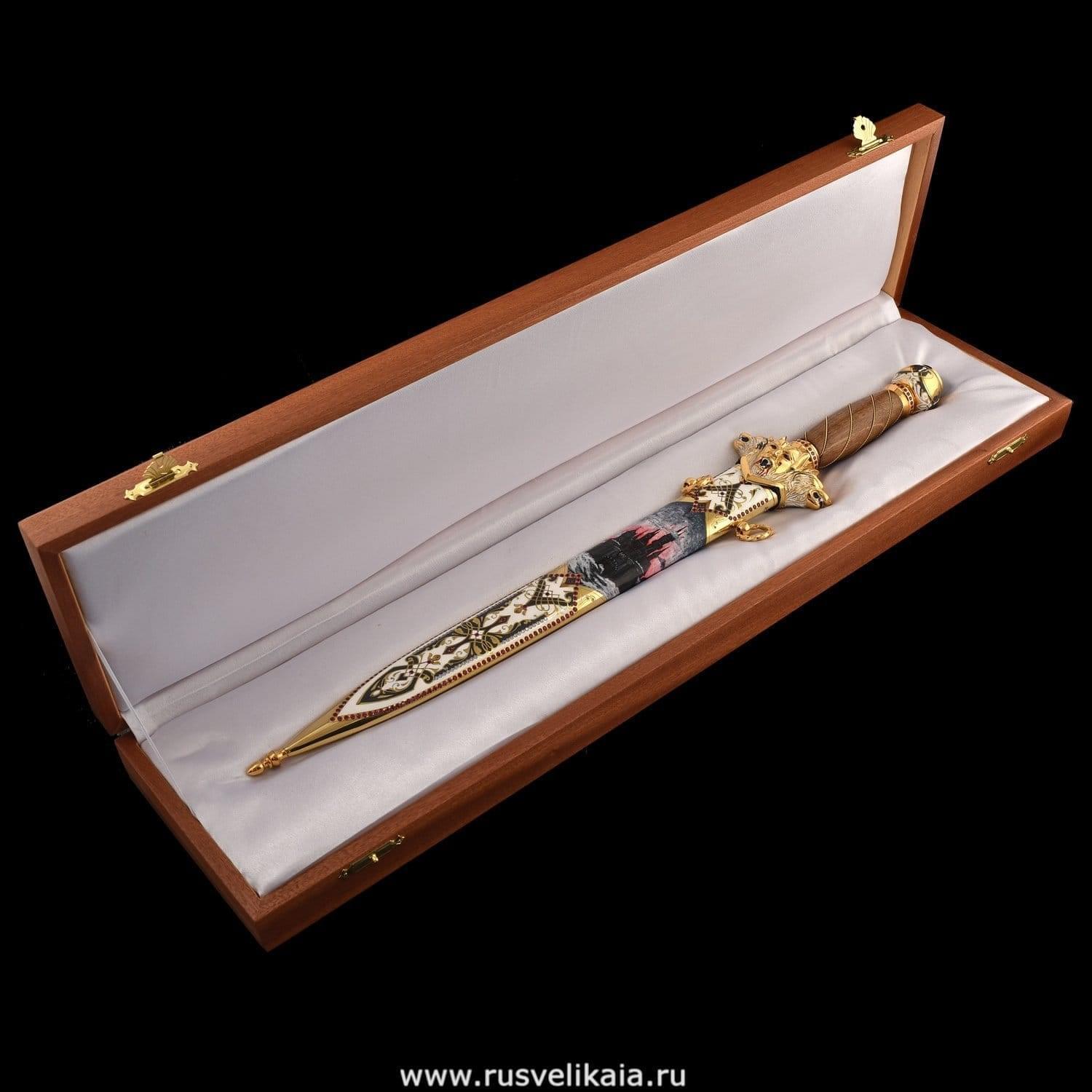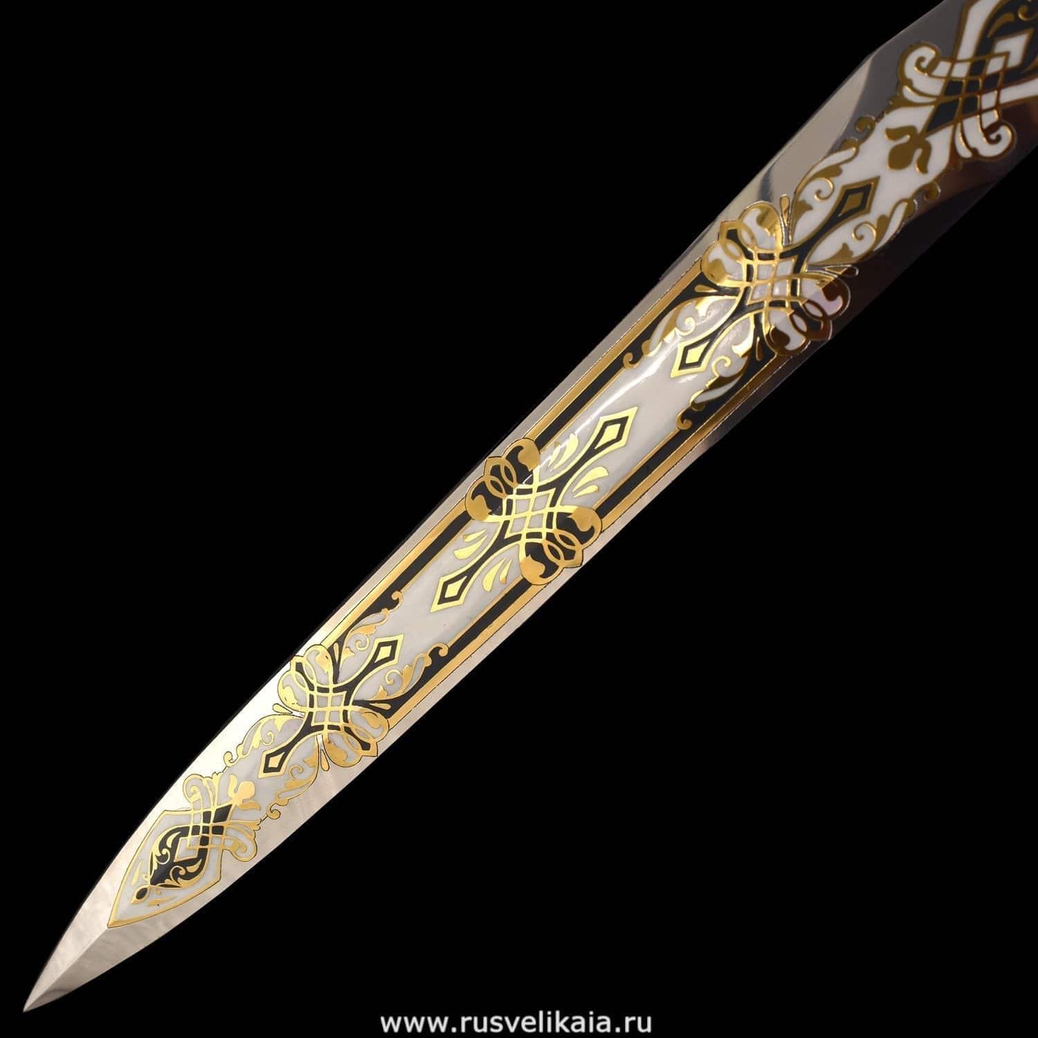 Медные «мечи» микенской эпохи уже обладали режущей кромкой, но были слишком малы (клинок 20-30 см.). Для изготовления более длинного оружия медь не годилась. После того, как железо сменило медь и бронза, маленькие «мечи» применялись ассирийцами, греками и македонцами. Кинжал переводится с арабского (ханджар), тюркского (канжал - лист железа (металла), [кан] «кровь» + [жар] «пороть, вспарывать»). Восточный «киджар», по изгибу клинка, подражает коровьему рогу, только в плоской форме из стали. В отложениях палеолитической эпохи (во Франции) обнаружили ветви оленьих рогов, отделанные в виде кинжала. В Индии в 19 веке было в ходу оружие из двух острых рогов, соединенных основаниями металлической бляхой для защиты руки. Им пользовались в рукопашном бою для нанесения ударов направо и налево. В неолитическую эпоху делали прямые кинжалы из кремня, прототипы медных, экземпляры которых нашли в Сибири. В Западной Европе кинжалы заменялись мечами, приспособленными колоть, а не рубить. Типичные кинжалы свойственны Востоку, от Индии до Турции: киджар, бичвар, куттар, ятаган и другие. Некоторые типы происходят от оружия с вогнутым лезвием (вроде серпа); таков был копис древних персов и затем греков, кукри - оружие гурков в Непале; отсюда же корни изогнутого турецкого, албанского и персидского ятаганов. Нечто среднее между кинжалом и мечом представляют малайские крисы и другое оружие, используемое даяками, племенами Малайского архипелага. В России кинжалы распространились в казачьих войсках в первой половине 19 века. Образцовый казачий кинжал был утвержден в 1904 году. Размер: общая длина - 51,5 см. длина клинка - 34,5 см. ширина - 3,1 см. твердость клинка не более 25 HRC. Техника исполнения: токарные работы, рисовка кистью, гравировка иглой по лаку, травление, гравировка резцом, полировка, никелирование, золочение. В изделии использовались традиционные методы обработки и украшения Златоустовской гравюры на металле.Материал: сталь ЭИ-107 (40Х10С2М), латунь, никель, позолота, эмаль, фианиты.