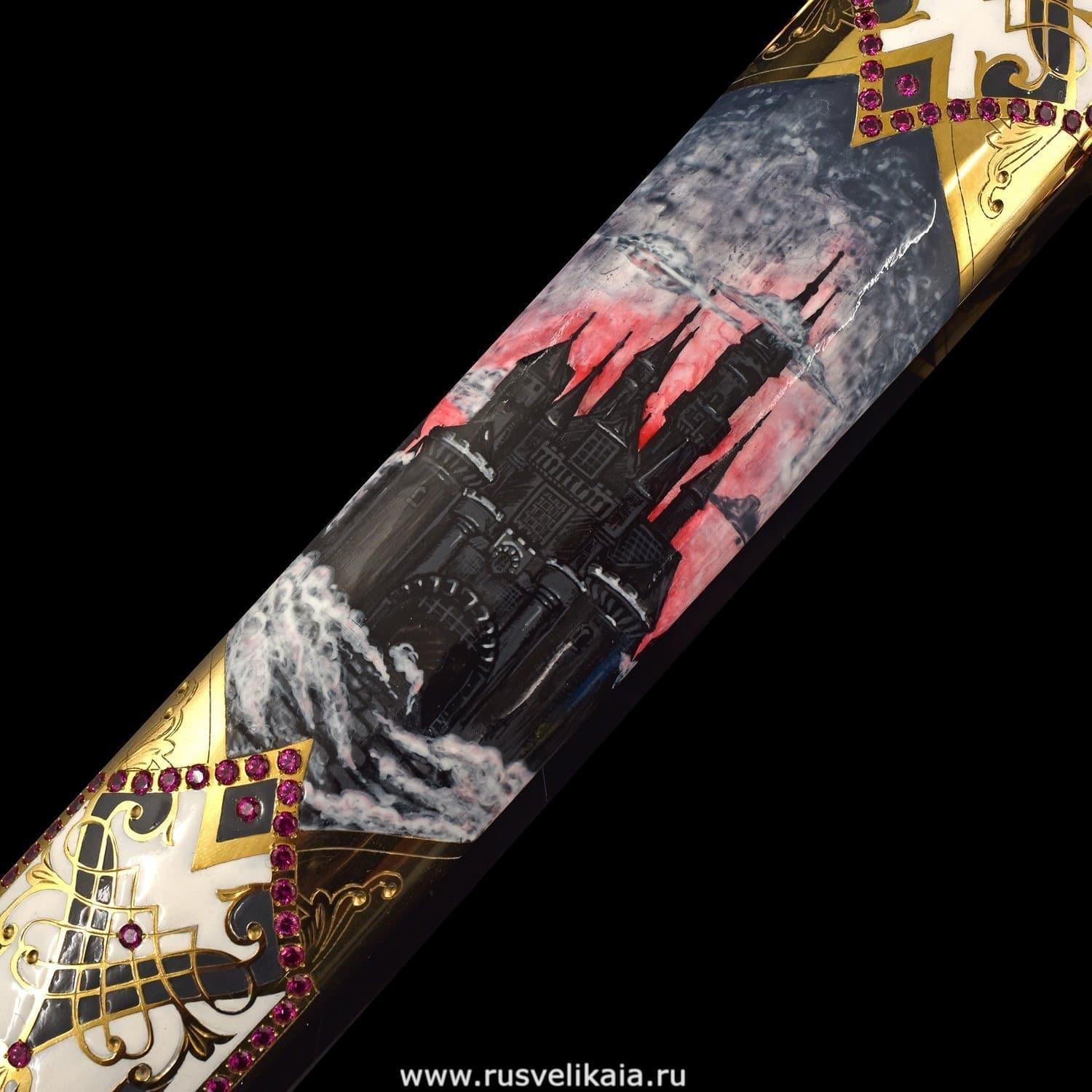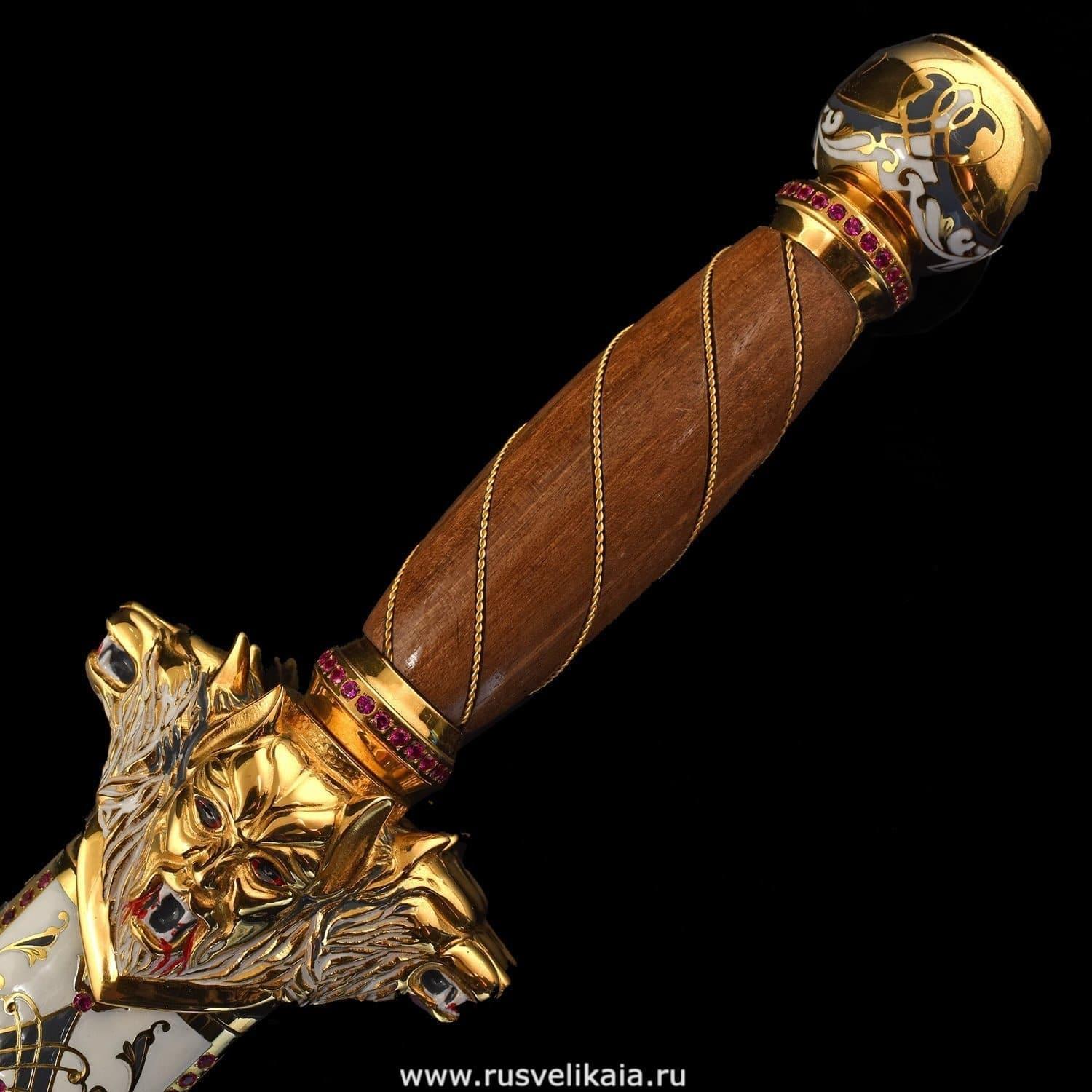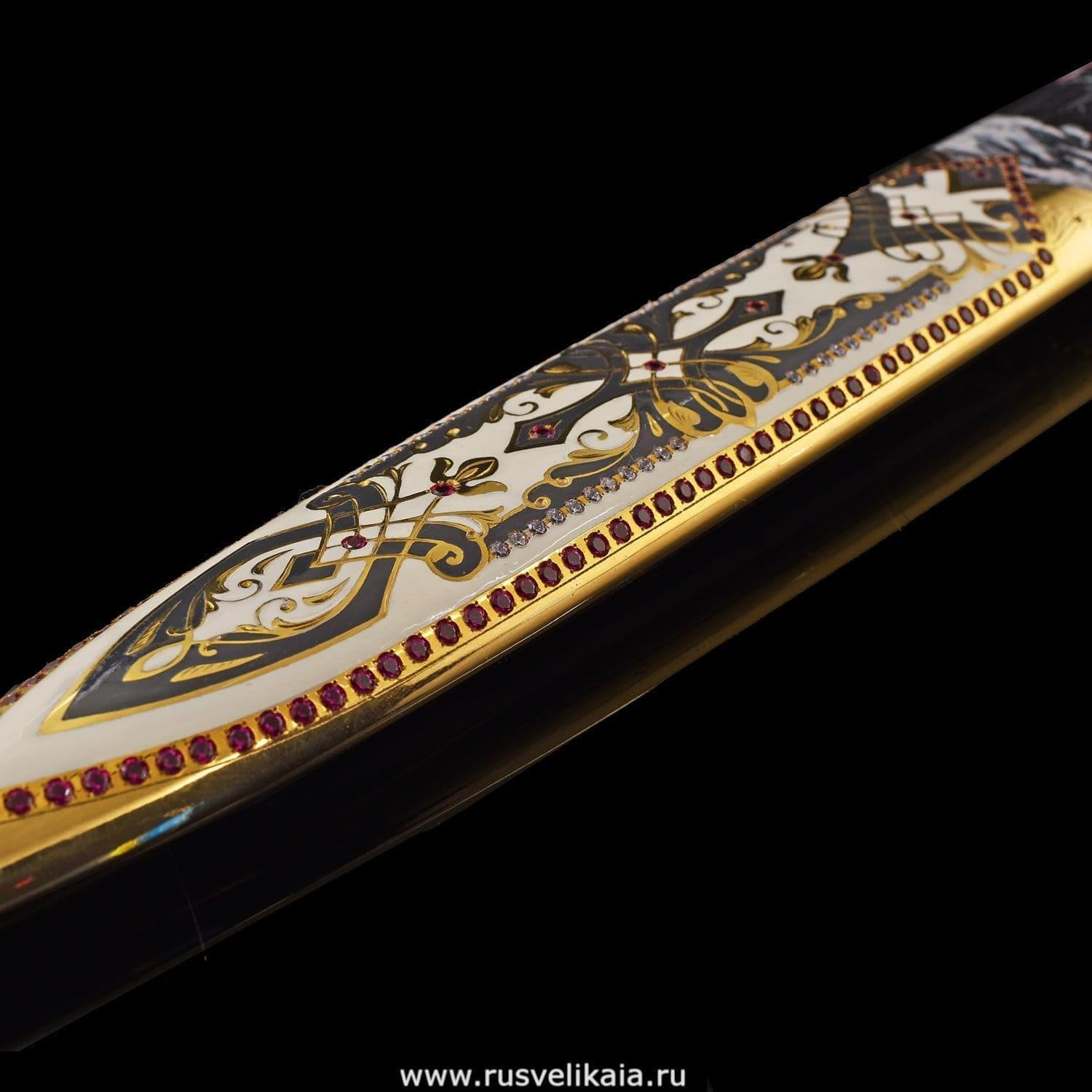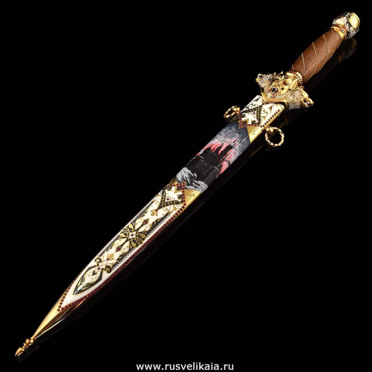 Медные «мечи» микенской эпохи уже обладали режущей кромкой, но были слишком малы (клинок 20-30 см.). Для изготовления более длинного оружия медь не годилась. После того, как железо сменило медь и бронза, маленькие «мечи» применялись ассирийцами, греками и македонцами. Кинжал переводится с арабского (ханджар), тюркского (канжал - лист железа (металла), [кан] «кровь» + [жар] «пороть, вспарывать»). Восточный «киджар», по изгибу клинка, подражает коровьему рогу, только в плоской форме из стали. В отложениях палеолитической эпохи (во Франции) обнаружили ветви оленьих рогов, отделанные в виде кинжала. В Индии в 19 веке было в ходу оружие из двух острых рогов, соединенных основаниями металлической бляхой для защиты руки. Им пользовались в рукопашном бою для нанесения ударов направо и налево. В неолитическую эпоху делали прямые кинжалы из кремня, прототипы медных, экземпляры которых нашли в Сибири. В Западной Европе кинжалы заменялись мечами, приспособленными колоть, а не рубить. Типичные кинжалы свойственны Востоку, от Индии до Турции: киджар, бичвар, куттар, ятаган и другие. Некоторые типы происходят от оружия с вогнутым лезвием (вроде серпа); таков был копис древних персов и затем греков, кукри - оружие гурков в Непале; отсюда же корни изогнутого турецкого, албанского и персидского ятаганов. Нечто среднее между кинжалом и мечом представляют малайские крисы и другое оружие, используемое даяками, племенами Малайского архипелага. В России кинжалы распространились в казачьих войсках в первой половине 19 века. Образцовый казачий кинжал был утвержден в 1904 году. Размер: общая длина - 51,5 см. длина клинка - 34,5 см. ширина - 3,1 см. твердость клинка не более 25 HRC. Техника исполнения: токарные работы, рисовка кистью, гравировка иглой по лаку, травление, гравировка резцом, полировка, никелирование, золочение. В изделии использовались традиционные методы обработки и украшения Златоустовской гравюры на металле.Материал: сталь ЭИ-107 (40Х10С2М), латунь, никель, позолота, эмаль, фианиты.