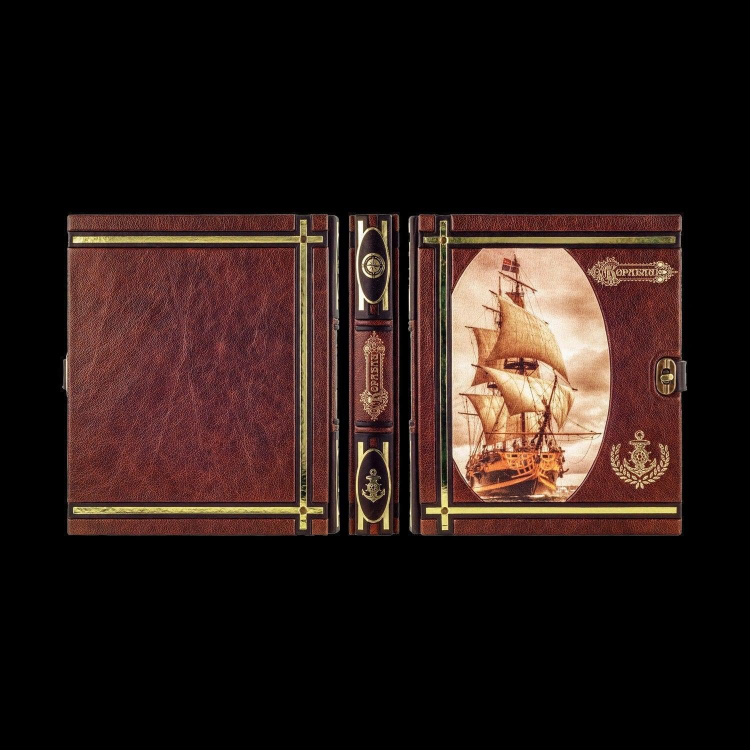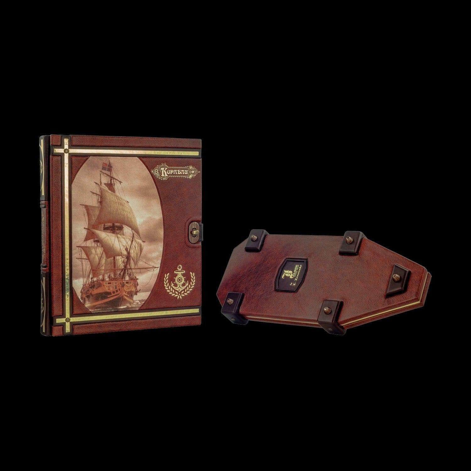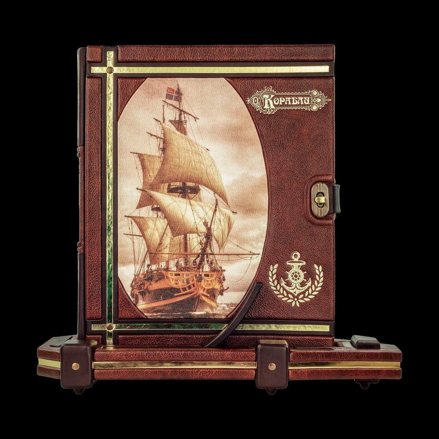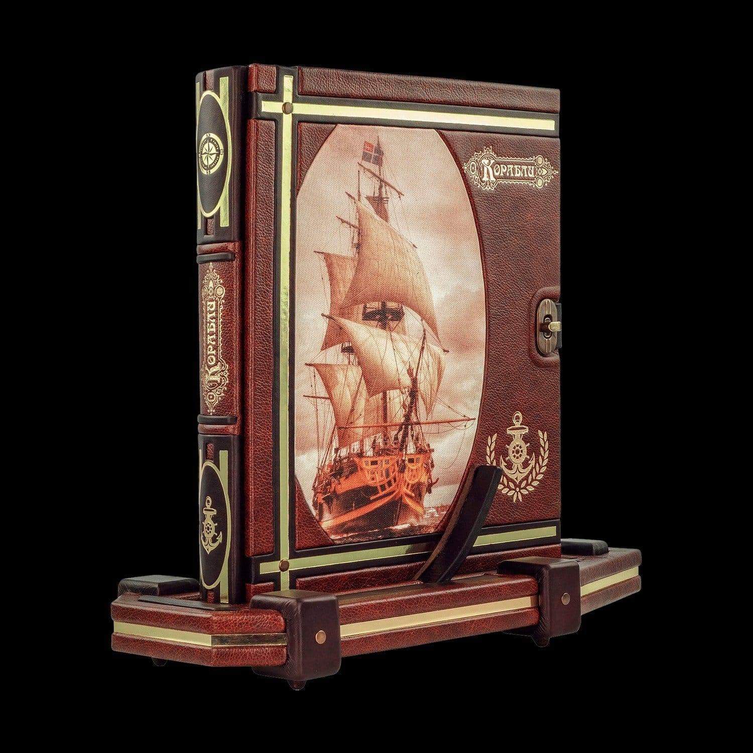 Подарочная книга на подставке "Корабли". Кожаный переплёт