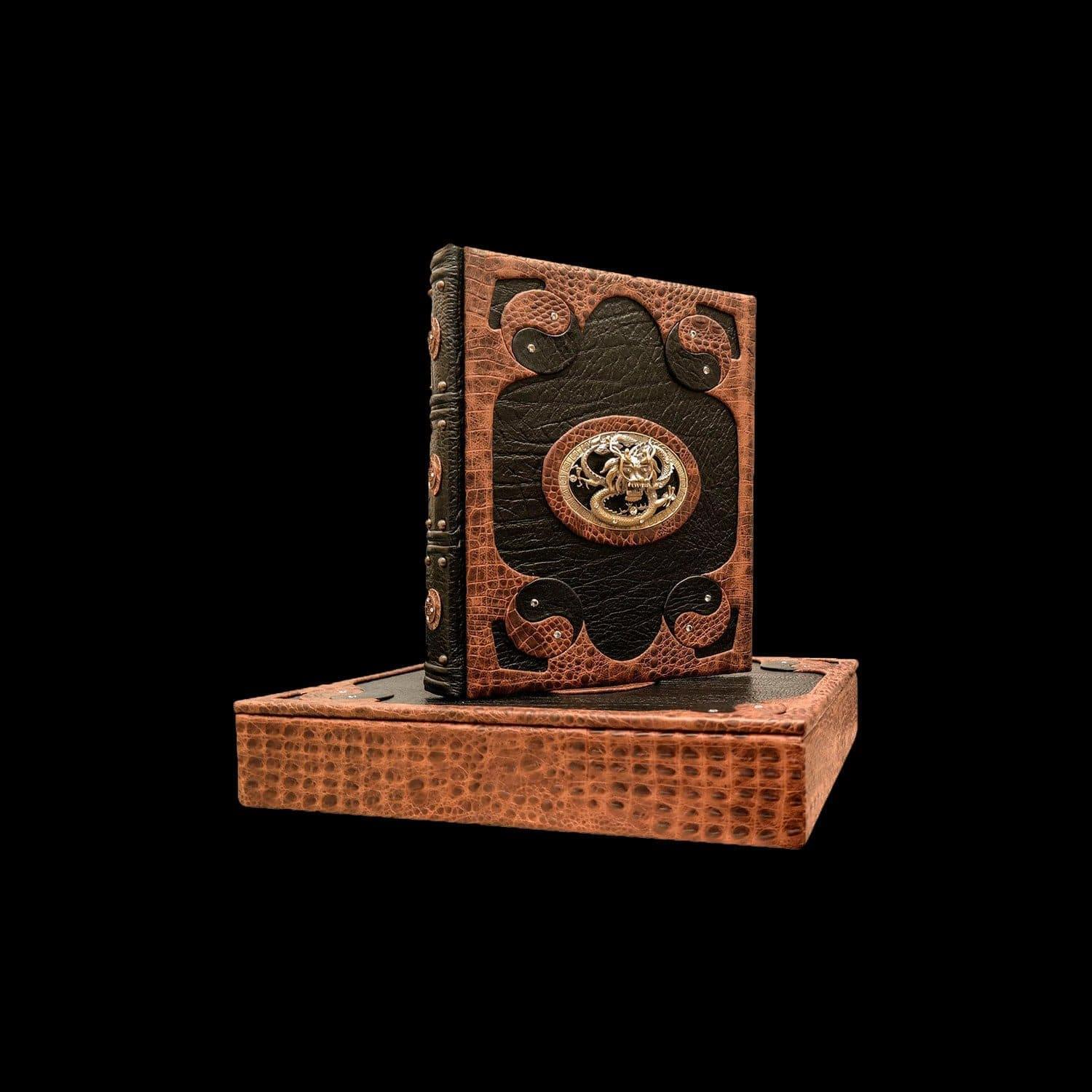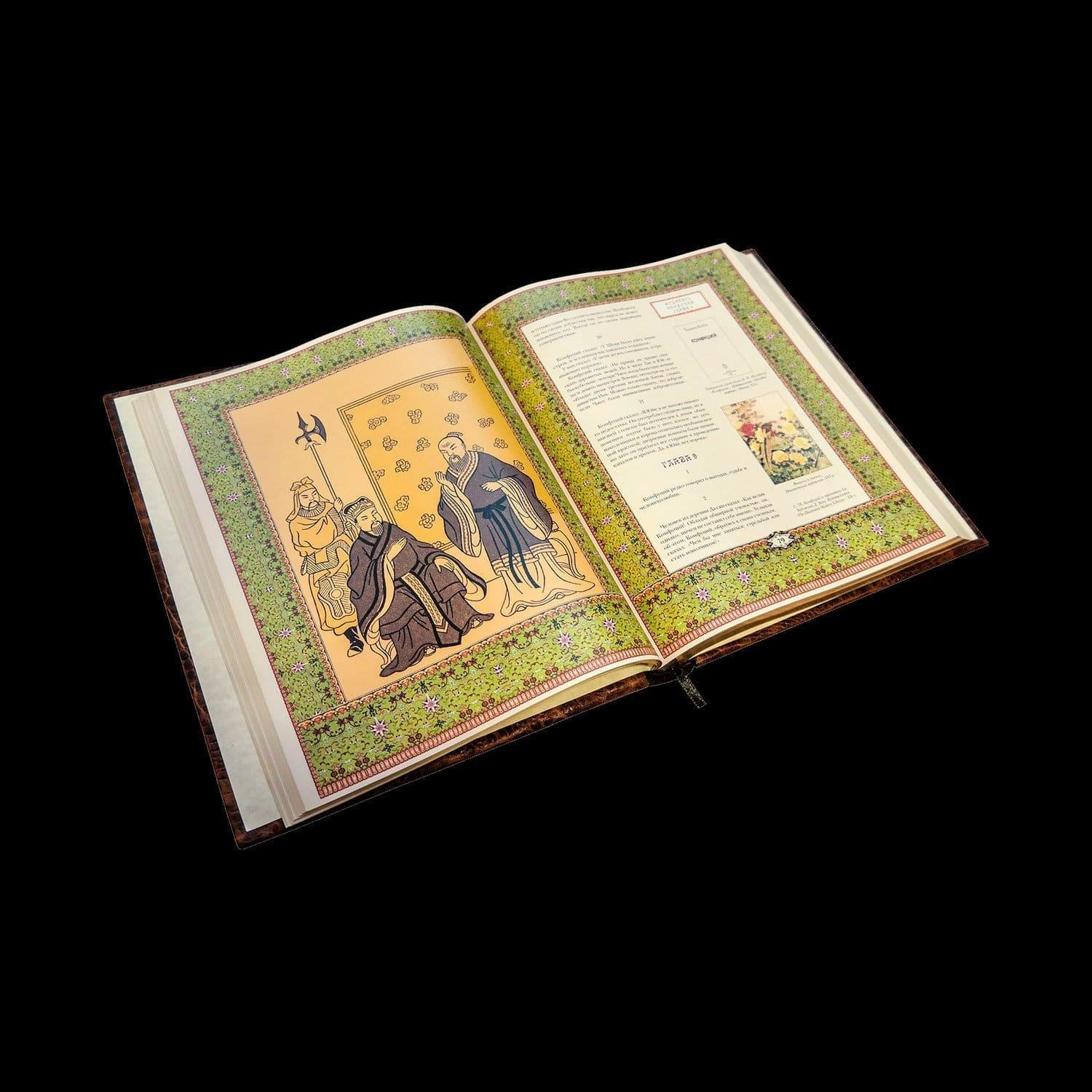 Сотни цветных иллюстраций, старинные гравюры и другие произведения китайского изобразительного искусства, отражают древнюю культуру Поднебесной империи. Издание включает жизнеописание Конфуция, философский трактат Лунь-юй, содержащий афоризмы и высказывания знаменитого философа, комментарии и варианты перевода «Памятники культуры». Конфуций (настоящее имя - Кун Цю, в литературе именуется «учитель Кун» или Цзы - «Учитель») основал первый университет и систематизировал летописи, составленные в разных княжествах. Учение Конфуция о правилах поведения князей, чиновников, воинов и крестьян распространялось в Китае так же широко, как учение Будды в Индии. Конфуцианство как государственная идеология сохранялось до начала 20 века, временно уступая место буддизму и даосизму. Хотя его называют религией, в нем нет института церкви - конфуцианская этика не религиозна. Ее идеал - создание гармоничного общества по древнему образцу, в котором всякая личность имеет свою функцию. Гармоническое общество построено на идее преданности подчиненного начальнику, направленной на сохранение гармонии самого общества. Конфуций сформулировал золотое правило этики: «Не делай человеку того, чего не желаешь себе». Нравственные обязанности - дело воспитания, образования, культуры. Труд «Лунь юй» («Беседы и суждения») составлен из школьных записей Конфуция его учениками уже после смерти мыслителя. Оформление: Составной переплет «Брадель», ручной работы, выполнен из комбинации натуральных кож (кожа «Elefante Geox», кожа «Crocozombo» производства итальянской кожевенной фабрики «Claudio»). Обложка книги и футляр инкрустированы камнями циркон брильянтовой огранки (диаметр 5 мм., высший сорт, производства компании «Swarovski») общим количеством 16 штук, фурнитурой «Just Cavalli», количеством 3 штук, латунными холитенами, количеством 12 штук, художественным литьем «Китайский Дракон». Обрез блока вручную полирован и позолочен. Характеристики: Формат книги – 270х330 мм. Формат футляра – 310х380 мм. Вес комплекта – 5,2 кг. Количество иллюстраций: 470 Количество страниц: 448 (мелованная бумага). .