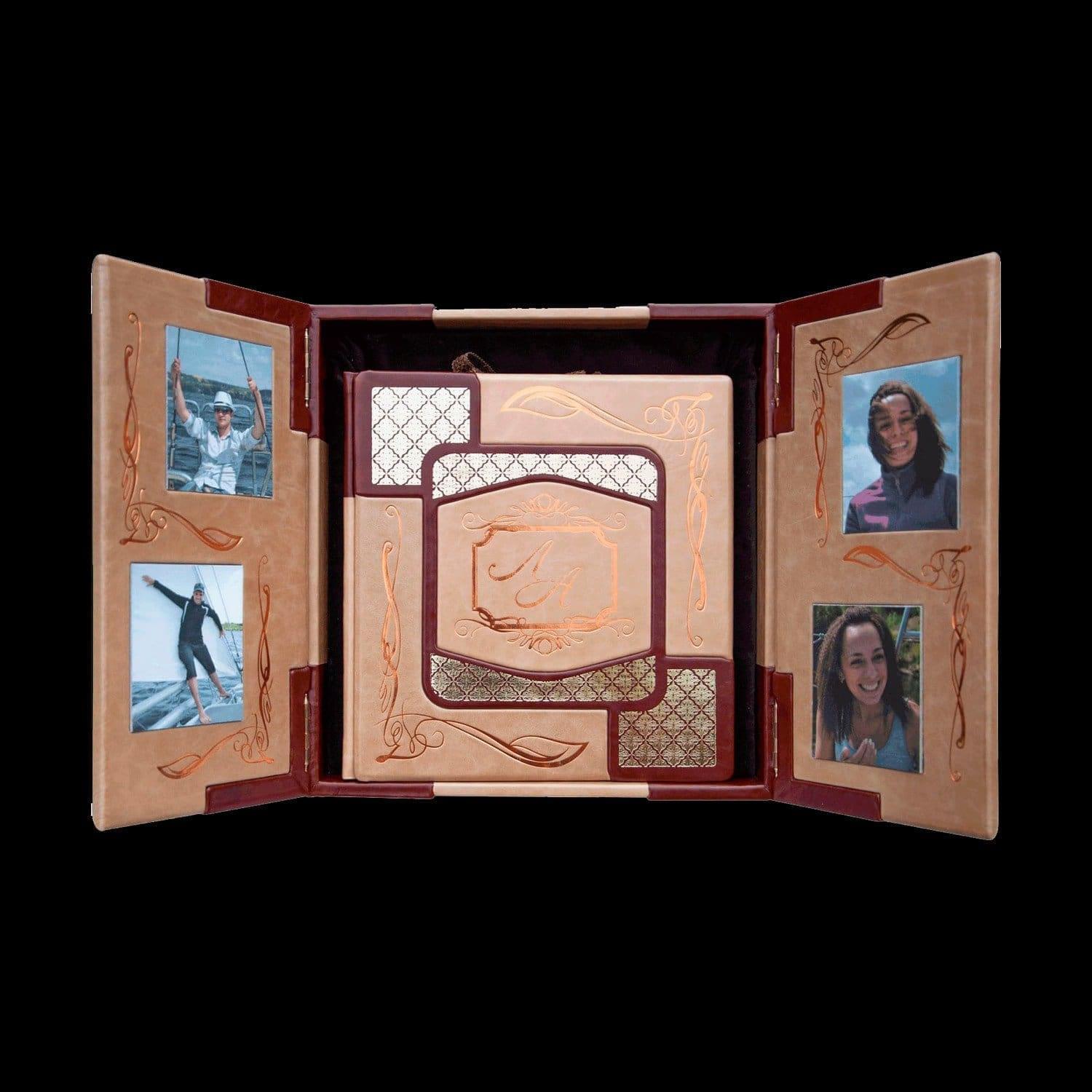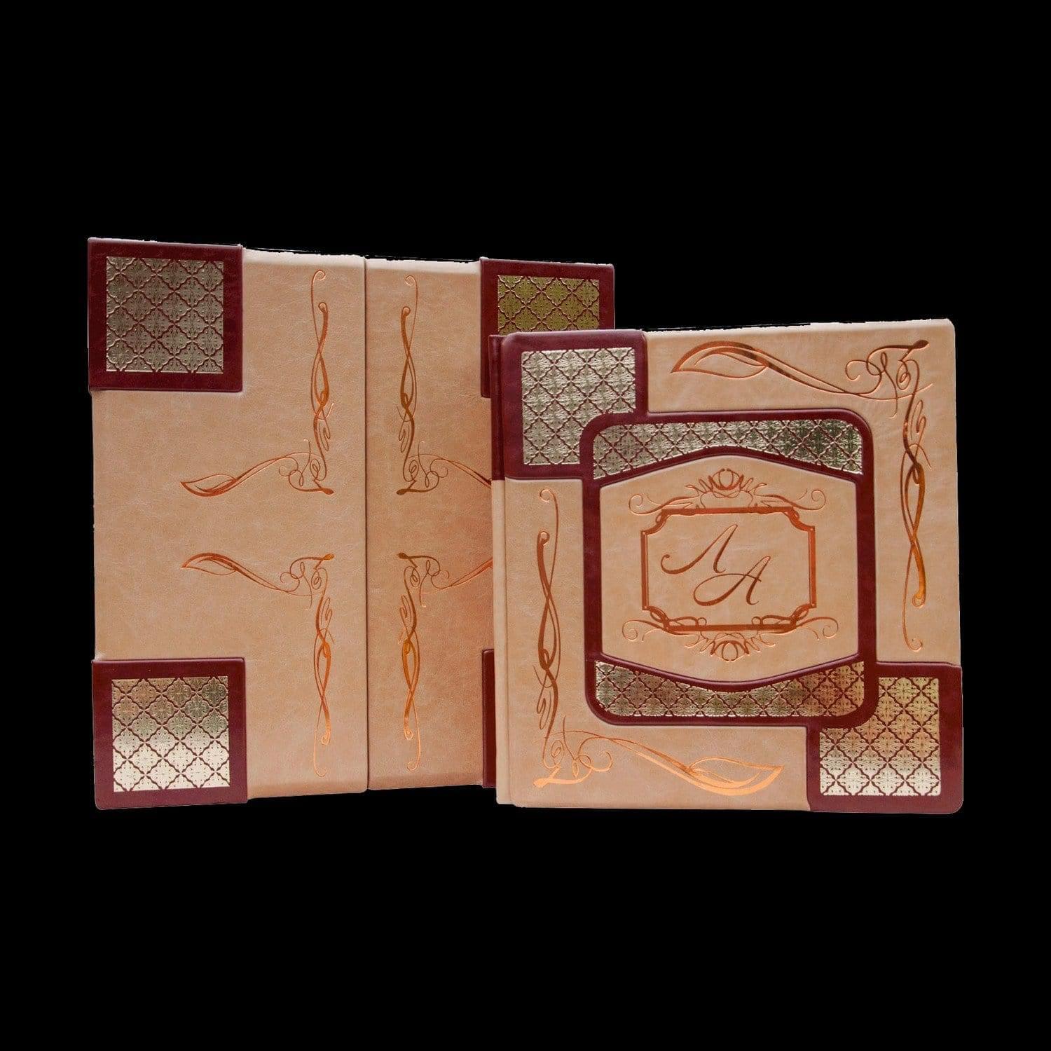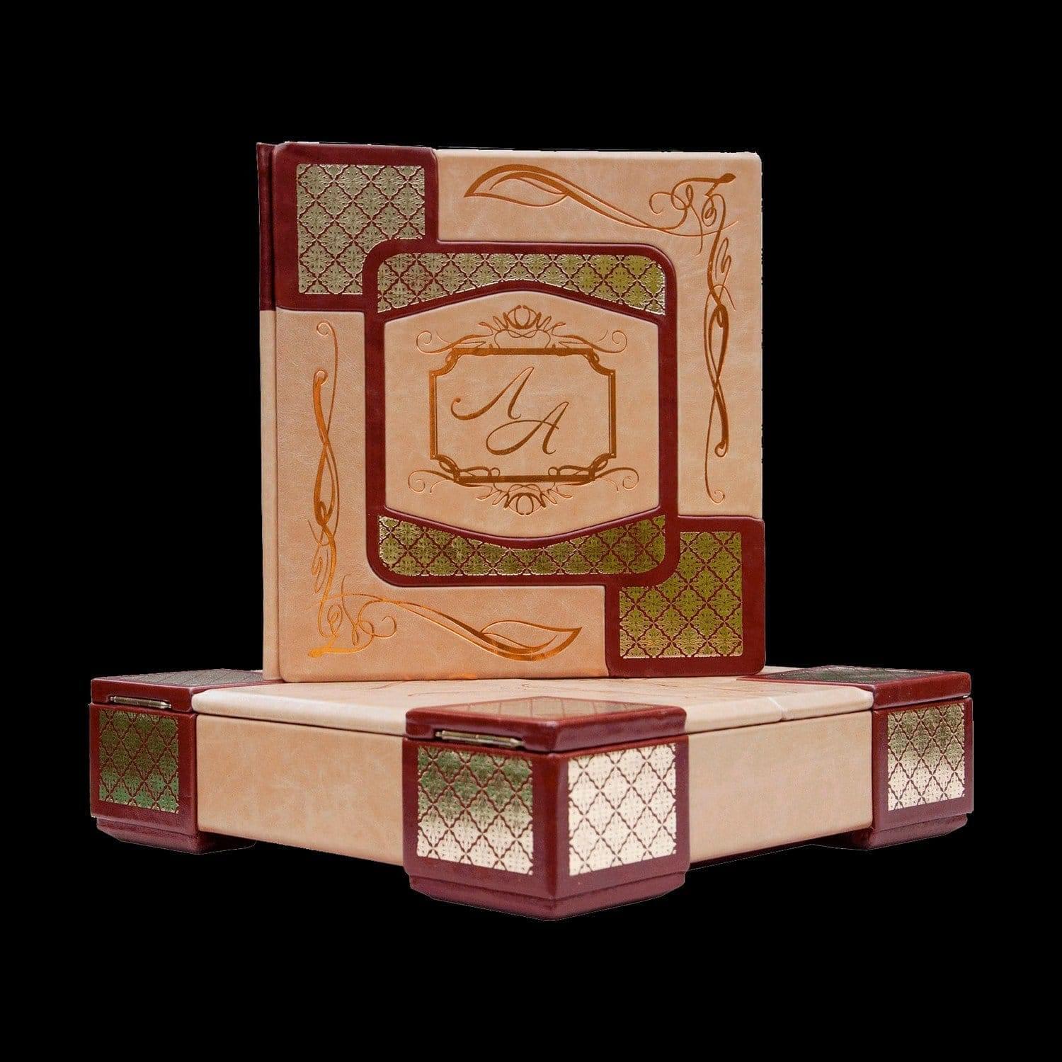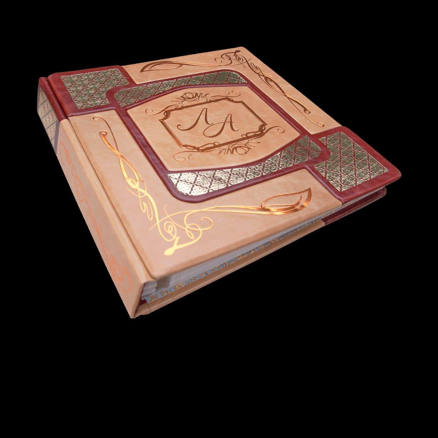 Изготовление под заказ альбома в индивидуальном сочетании кожи и тиснение фамилии с инициалами на титульной обложке. Также мастерская распечатает на холсте фотографии для оформления створок футляра. Внутренний блок может быть на магнитных листах или под двухсторонний скотч (приклеивание фотографий). Оформление: Составной переплет «Брадель», ручной работы, изготовлен из комбинации натуральных кож (кожа «Robbat cognac», кожа «Robbat parle» производства итальянской кожевенной фабрики «Claudio»). Обложка книги и футляр двухуровневые, оформлены комбинацией золотого и червоного тиснения. Авторский футляр-попитюр, изготовлен полностью вручную, является органичным дополнением альбома, призван максимально усиливать эффект от подарочного комплекта. Характеристики: Сертификат. Бархатный чехол. Формат альбома – 340х255х55 мм. Формат футляра – 400х430х150 мм. Вес комплекта – 7,2 кг. Вес альбома – 3,5 кг. ....