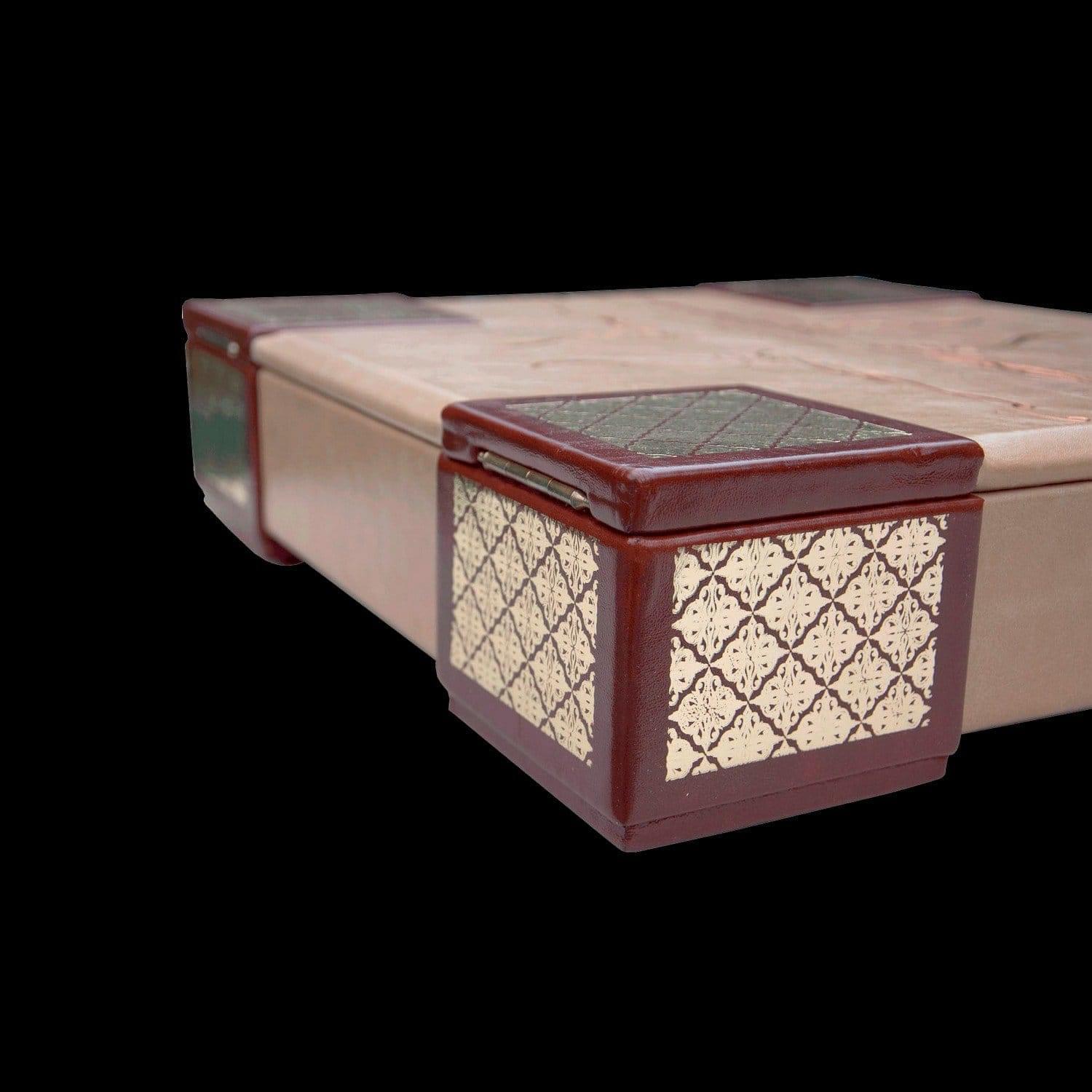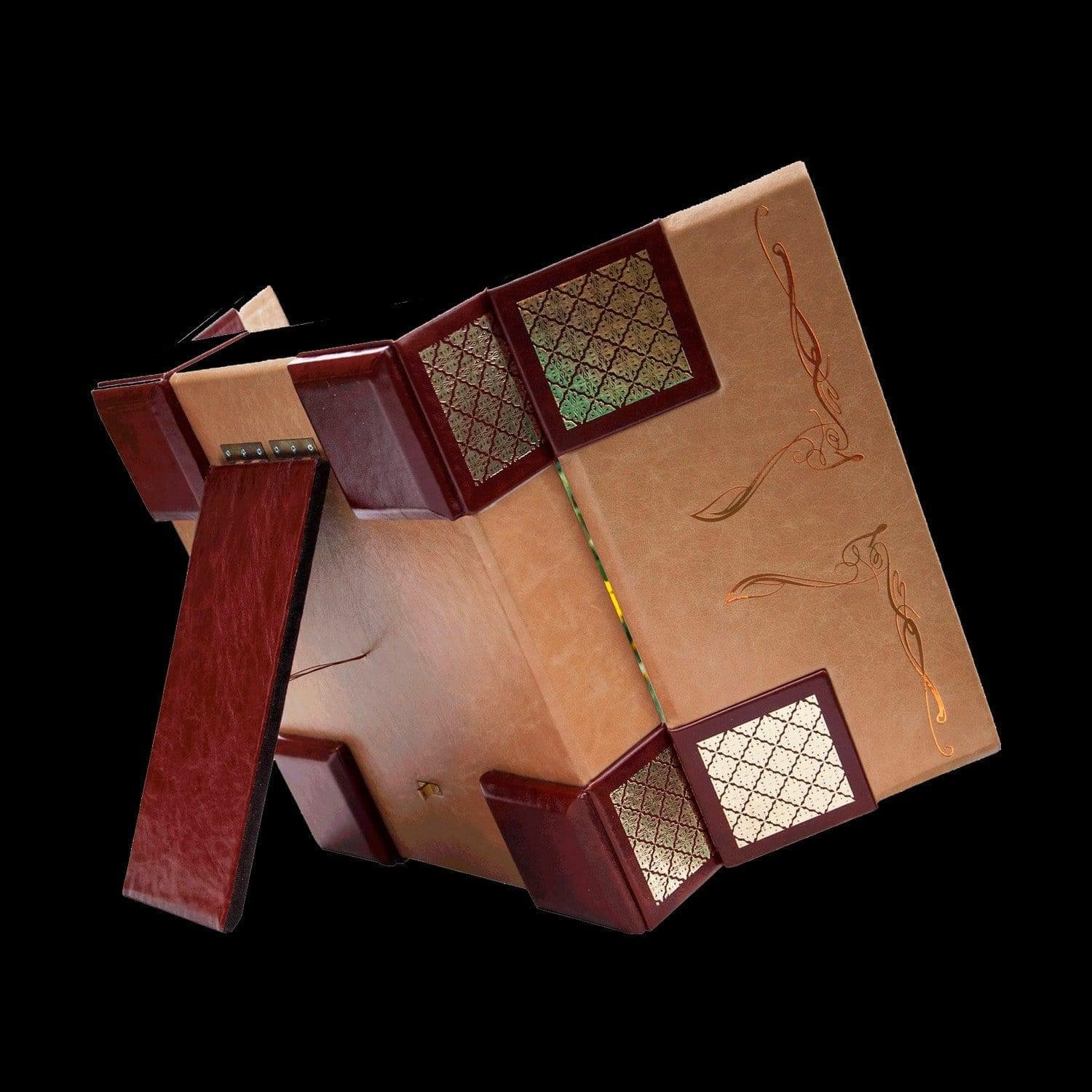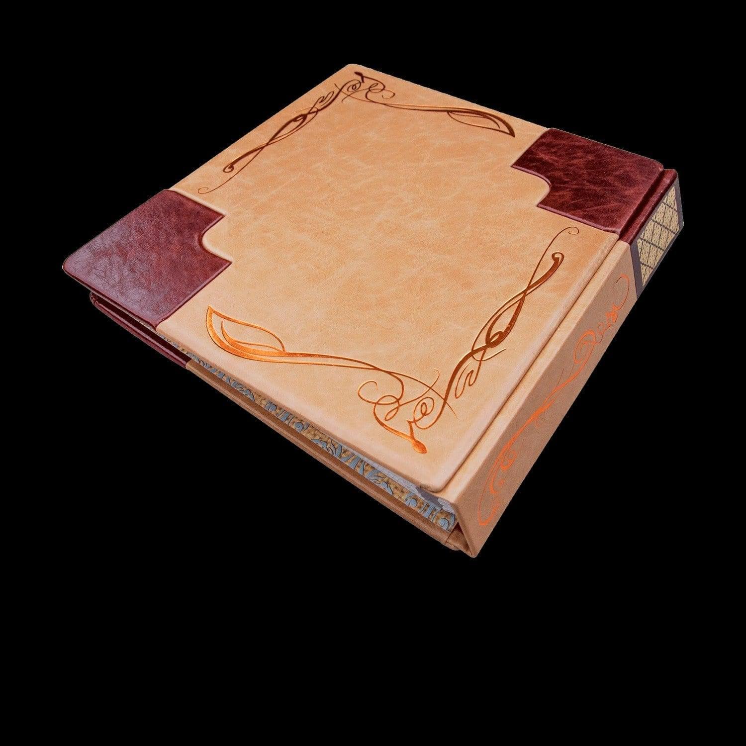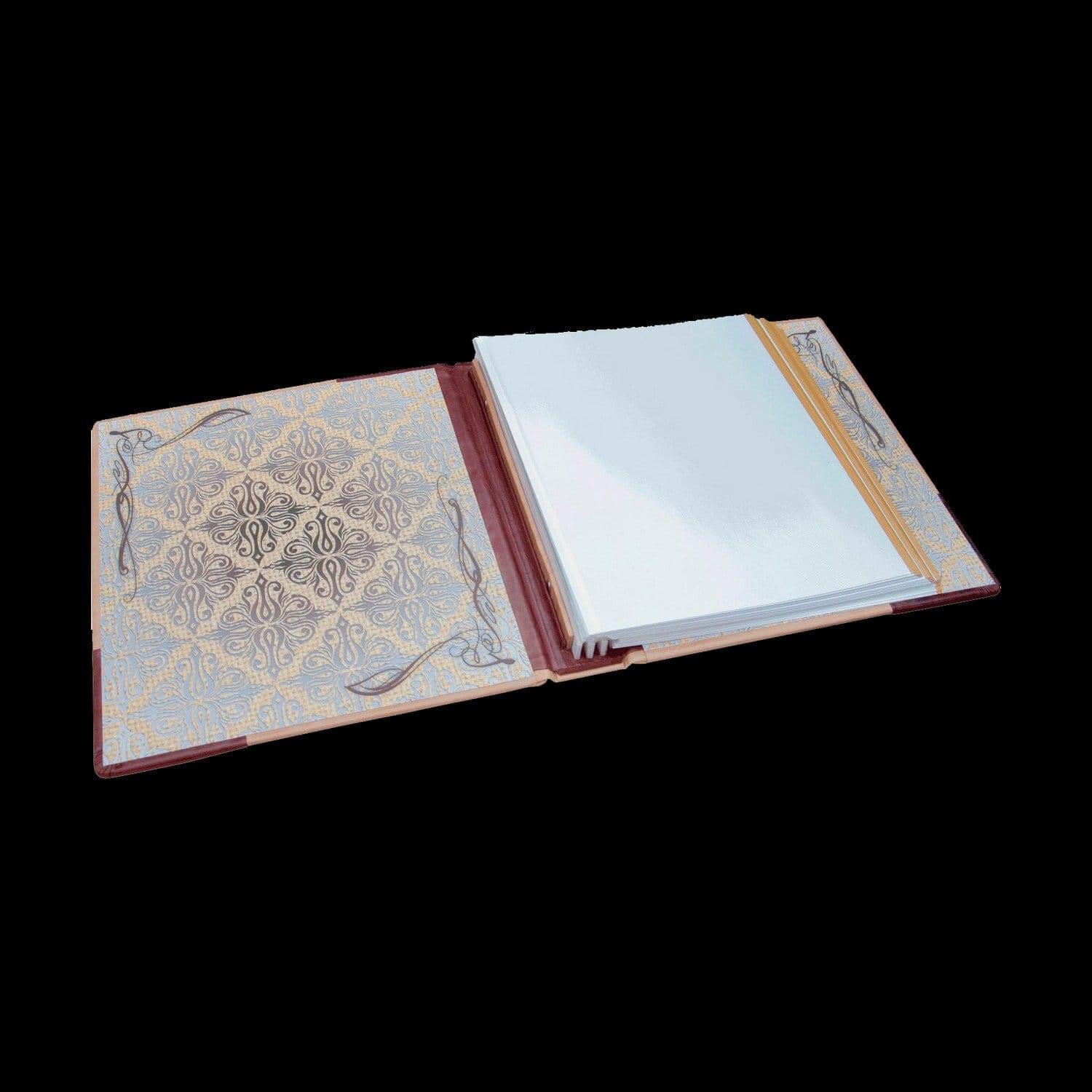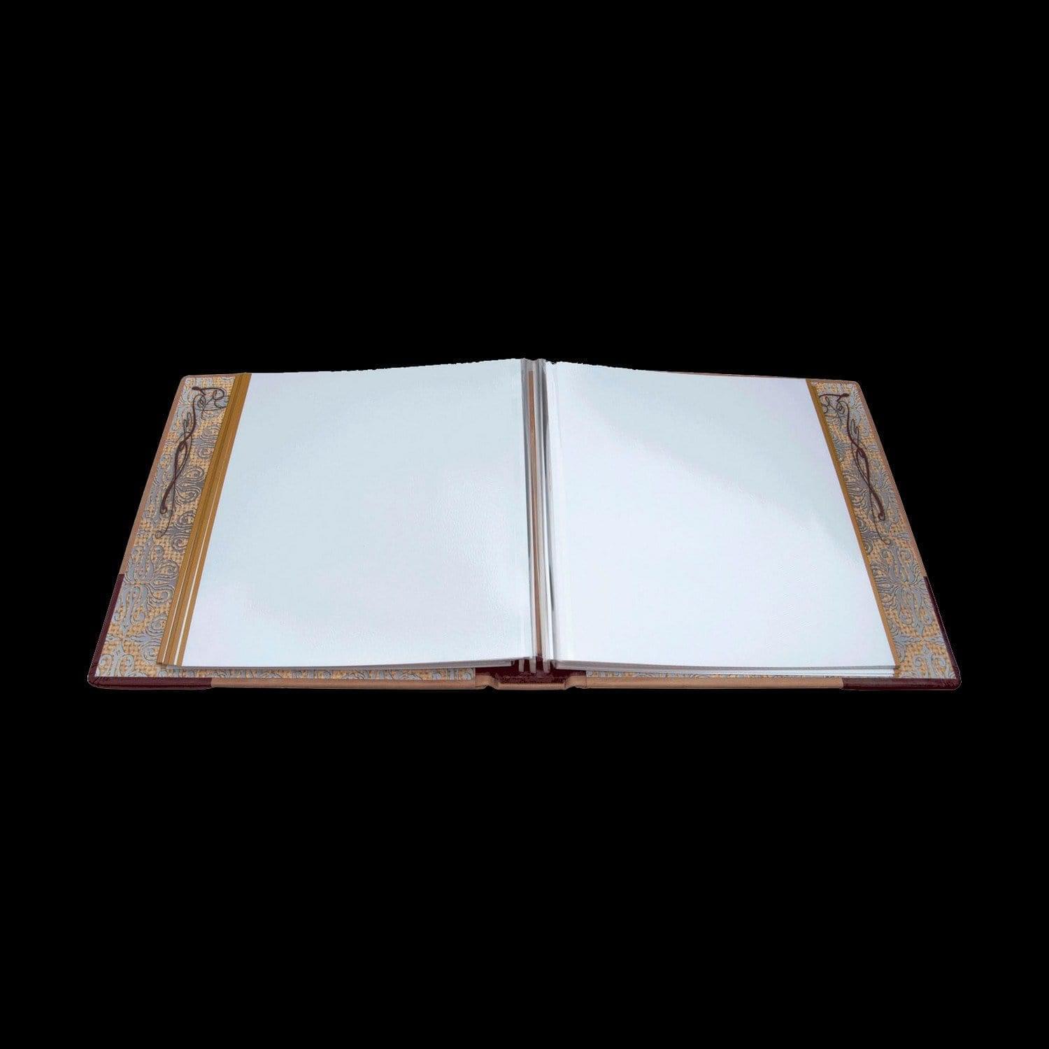 Изготовление под заказ альбома в индивидуальном сочетании кожи и тиснение фамилии с инициалами на титульной обложке. Также мастерская распечатает на холсте фотографии для оформления створок футляра. Внутренний блок может быть на магнитных листах или под двухсторонний скотч (приклеивание фотографий). Оформление: Составной переплет «Брадель», ручной работы, изготовлен из комбинации натуральных кож (кожа «Robbat cognac», кожа «Robbat parle» производства итальянской кожевенной фабрики «Claudio»). Обложка книги и футляр двухуровневые, оформлены комбинацией золотого и червоного тиснения. Авторский футляр-попитюр, изготовлен полностью вручную, является органичным дополнением альбома, призван максимально усиливать эффект от подарочного комплекта. Характеристики: Сертификат. Бархатный чехол. Формат альбома – 340х255х55 мм. Формат футляра – 400х430х150 мм. Вес комплекта – 7,2 кг. Вес альбома – 3,5 кг. ....