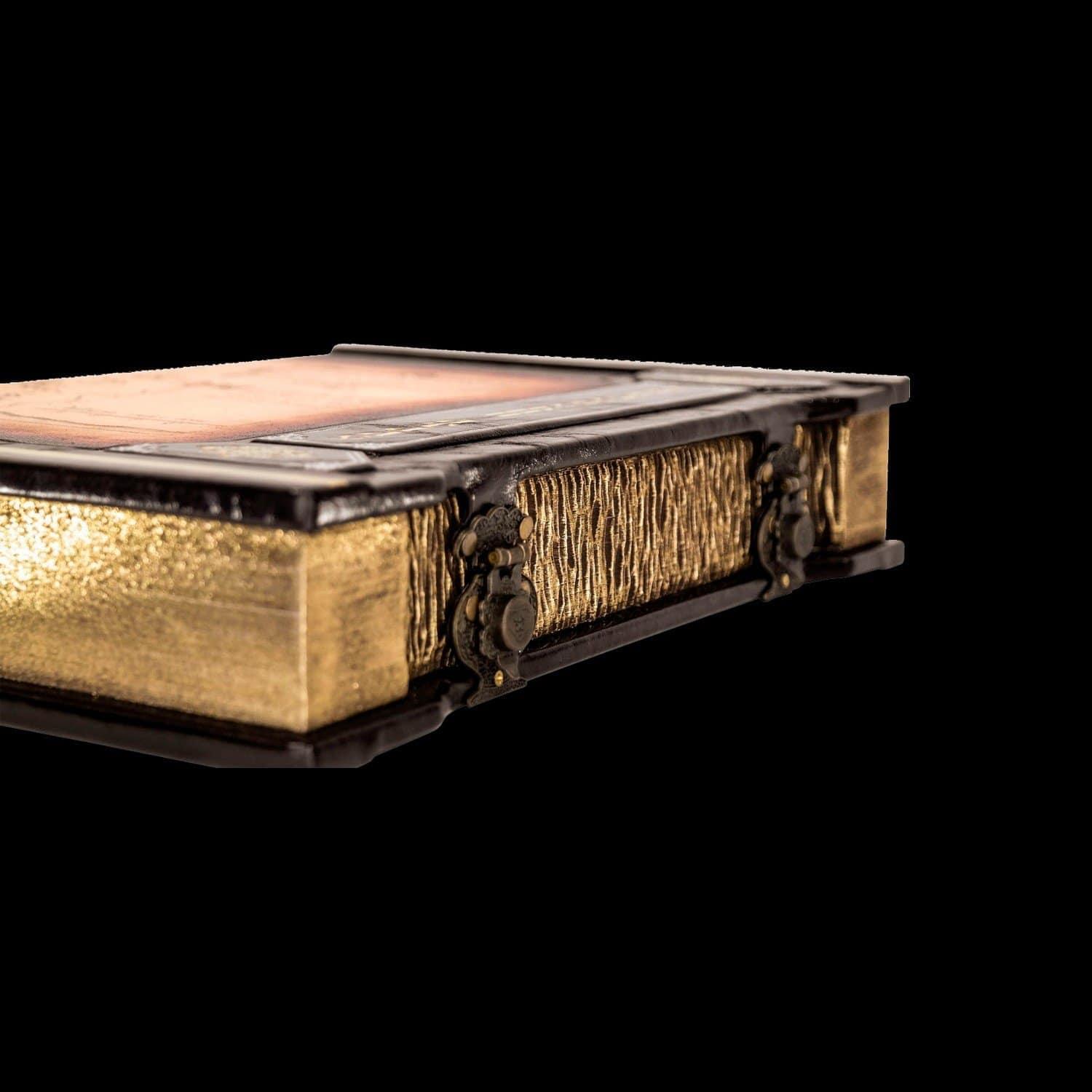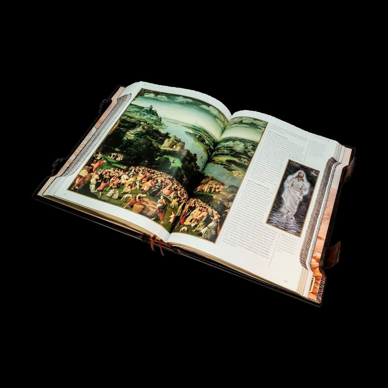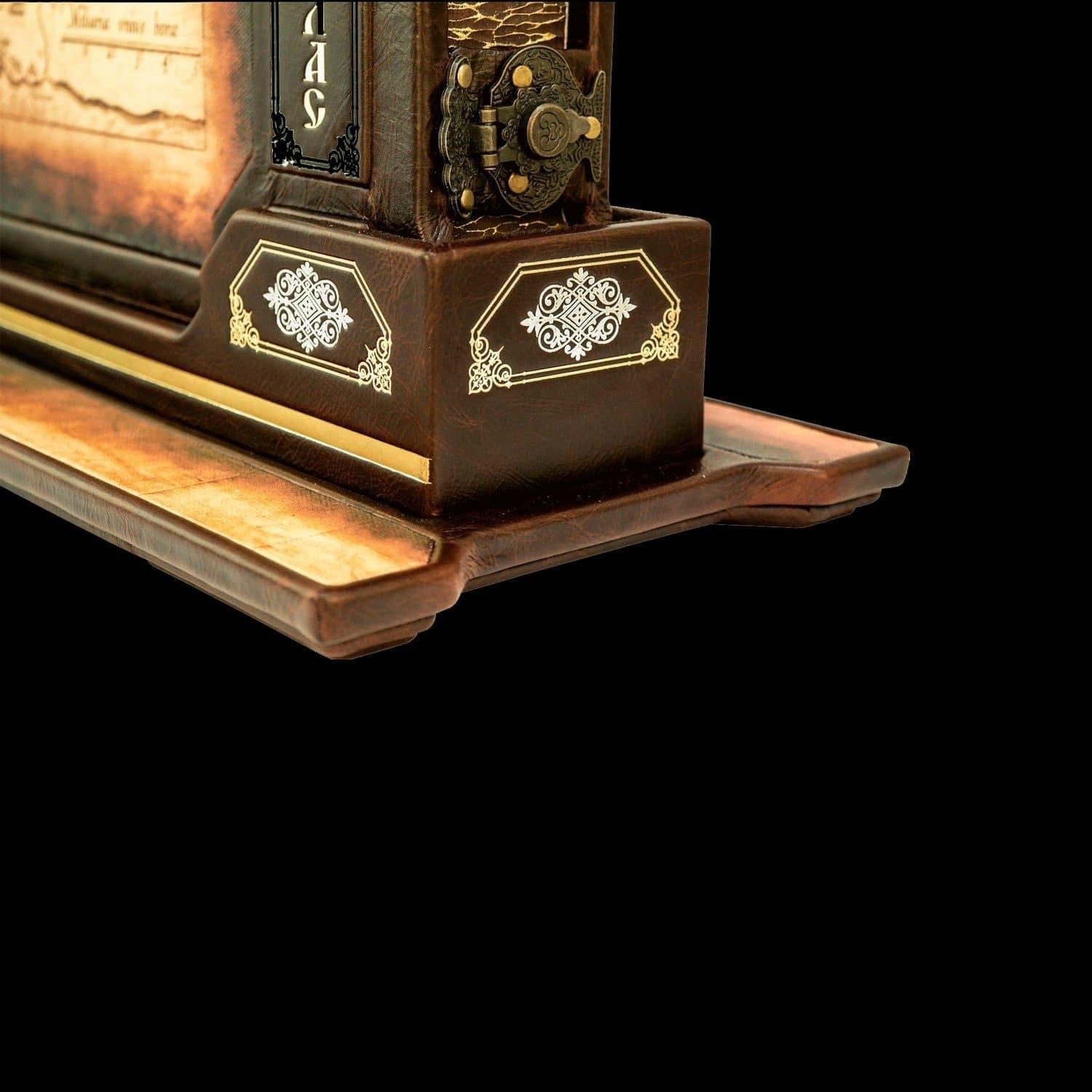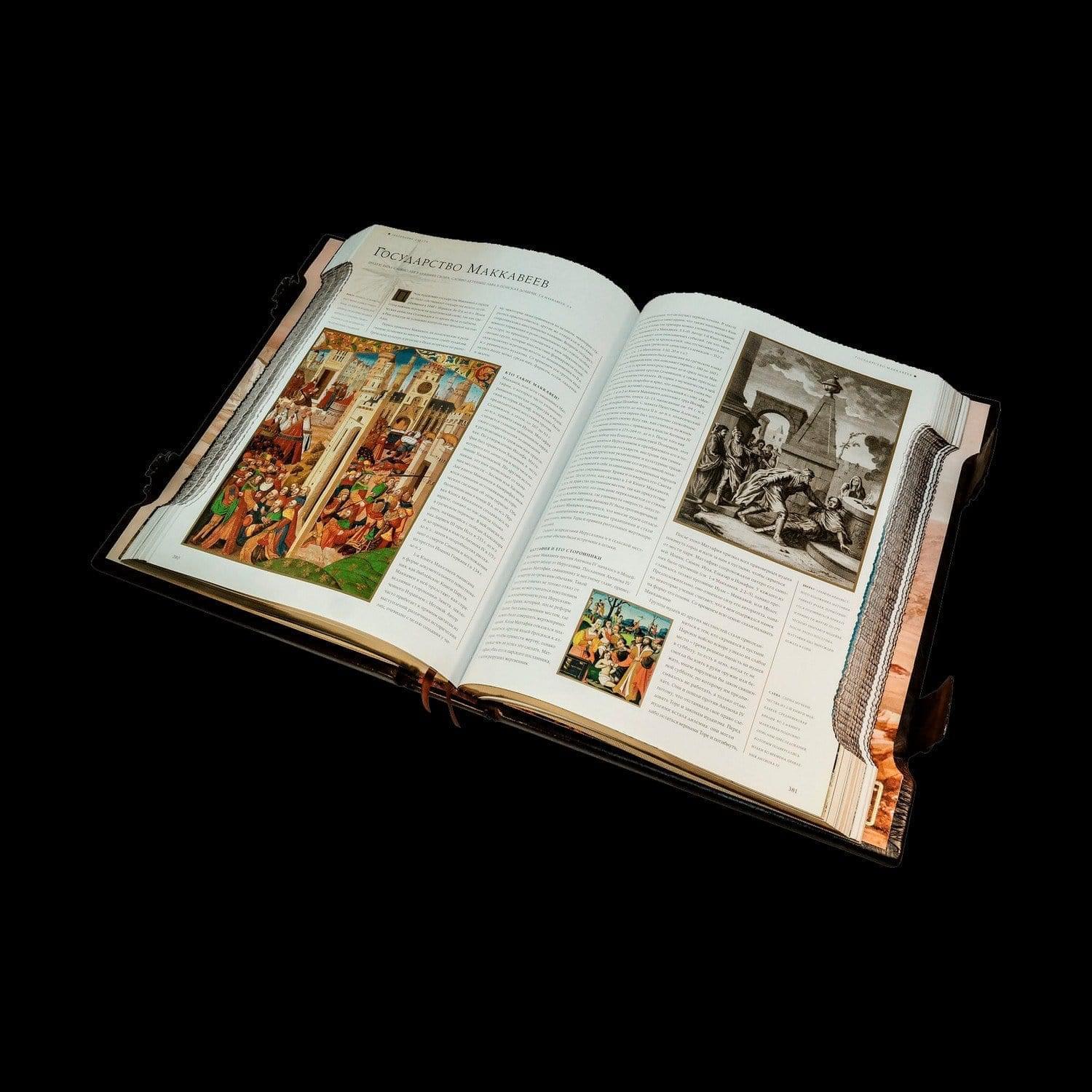 Библия не только духовная книга, но и историческая. Можно не верить в чудеса и сверхъестественные возможности библейских персонажей, но большая часть событий, описанных там, давно не ставится под сомнение ни историками, ни археологами. Да и существование многих городов и государств, упоминаемых в Библии, подтверждено многократно проводимыми археологическими раскопками. Просматривая Библейский атлас, можно легко соотнести описанные в Библии события с современными географическими объектами, получив представление и о прежнем административно-территориальном делении библейских земель, и о нынешнем их состоянии. Кроме того, в атласе представлены сведения о культуре и быте библейских народов, миграционных процессах, взаимоотношениях с соседствующими этносами. Библейский атлас — это 650 цветных иллюстраций: картин, рисунков, гравюр, фотографий и более 100 географических карт. С их помощью можно самостоятельно сложить разрозненные фрагменты библейских историй в единую общую картину древнего мира и провести параллели межу далеким прошлым и современностью. Оформление: Цельнокожаный переплет «Брадель», ручной работы, изготовлен из натуральной кожи «Perugia brown» производства итальянской кожевенной фабрики «Carisma». Обложка книги двухуровневая, оформлена комбинацией золотого и серебряного тиснения, с использованием фольги «Luxor 240». Декорирована изображением на холсте с художественной фотопечатью и латунными замками. Обрез книги оформлен в уникальной технике «Crusta» в комбинации с позолотой. Подставка выполнена в том же стиле, что и книга, и устлана изнутри итальянским коттон-бархатом. Характеристики: Персональный сертификат с индивидуальным текстом поздравления. Бархатный мешочек. Деревянный кейс. Количество страниц – 576 стр. (мелованная бумага, цветная печать, иллюстрации). Формат книги – 250х320х45 мм. Формат комплекта – 165х320х340 мм. Вес книги – 2,2 кг. Вес комплекта – 3,5 кг. Готовая книга может отличаться от представленной на фото. .