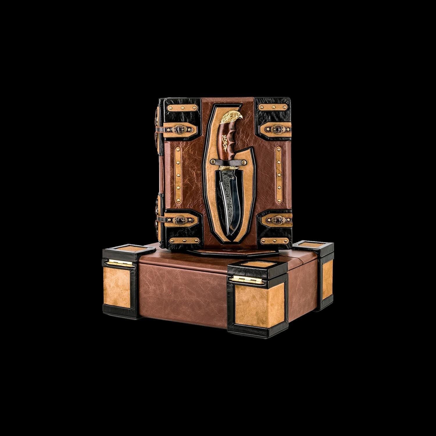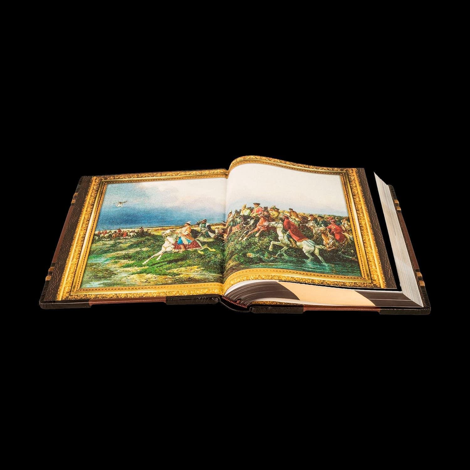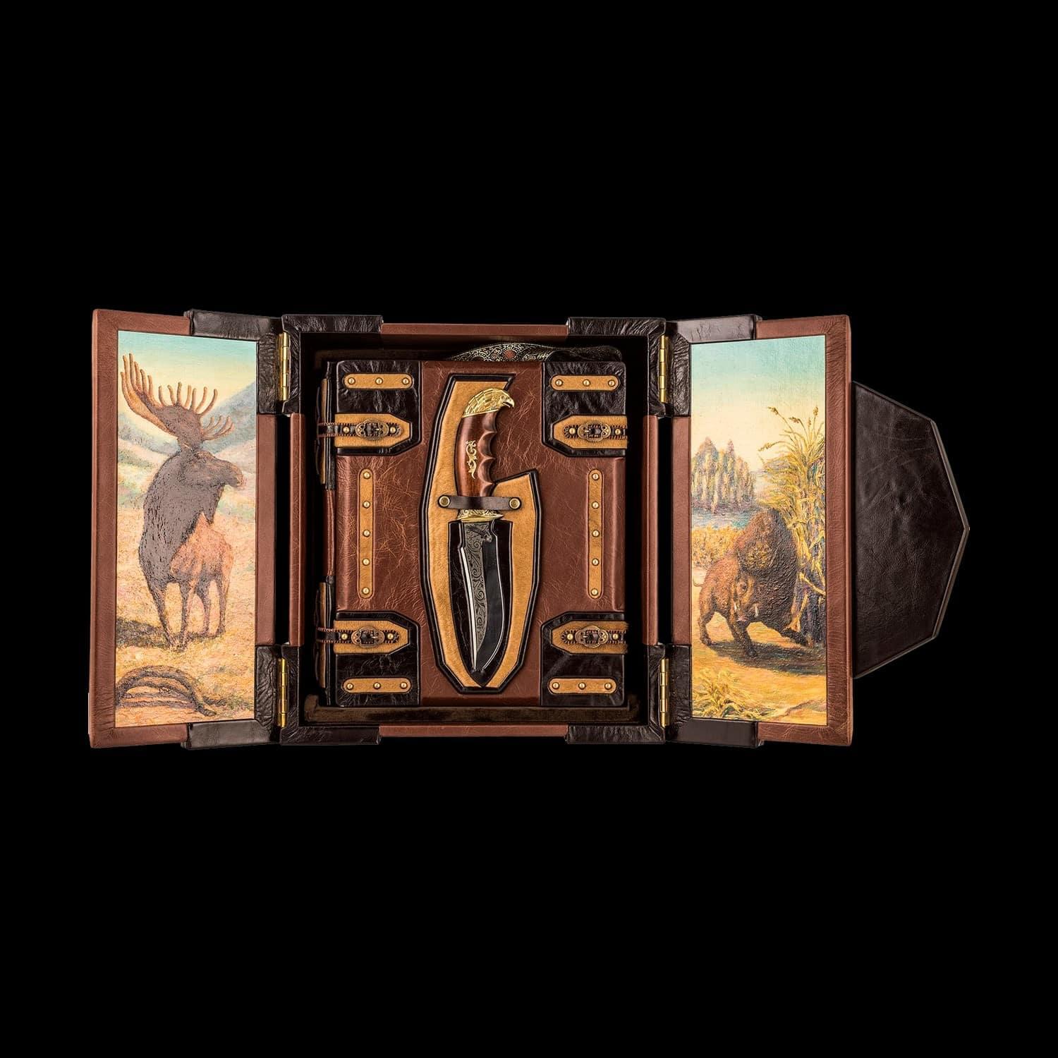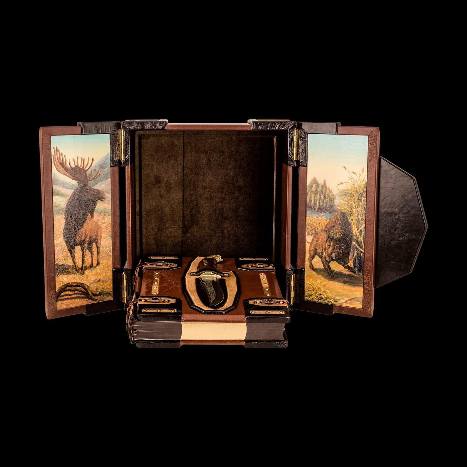 В книге более 1200 иллюстраций, наглядно представляющих охоту. Культурно-историческая часть описывает особенности охоты в разных культурах на протяжении 30 тысячелетий. Читатель узнает об охоте в Средние века, побывает на соколиной охоте во времена Фридриха II, познакомится с роскошью охоты в Новое время. Известные художники изображали на своих полотнах сцены охоты. Они также представлены в этой книге. Вторая часть книги посвящена красоте дикой природы. В ней описаны особенности охоты в наши дни, современные способы выслеживания и травли волков, лис, зайцев и других животных. Вы узнаете о брачных сезонах волков и лис и токе тетеревов. Также издание содержит сведения научного и культурно-исторического характера в виде иллюстраций и карт. Описываются породы охотничьих собак и их особенности. Кулинарный раздел посвящен блюдам охотничьей кухни и способам их приготовления. Составной переплет «Брадель», ручной работы, изготовлен из комбинации натуральных кож (кожа «Robbat Wisky», кожа «Cannella», шерсть пони «Pezzato» производства итальянской кожевенной фабрики «Carisma»). Обложка книги двухуровневая, оформлена латунными холитенами (цвет «Антик»), фурнитурой «Ferre», декоративным ножом. Обрез книги комбинированный, тонирован краской и позолочен. Подарочный футляр изготовлен в стиле книги и устлан итальянским коттон-бархатом, декорирован художественными панелями масляной живописи. Сертификат. Бархатный чехол. Количество страниц – 654 (мелованная бумага, цветная печать) Формат – 270х320 мм. Вес книги – 3,8 кг. Вес с футляром – 5,5 кг. .