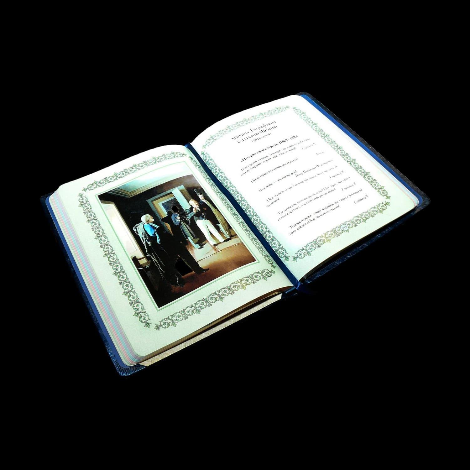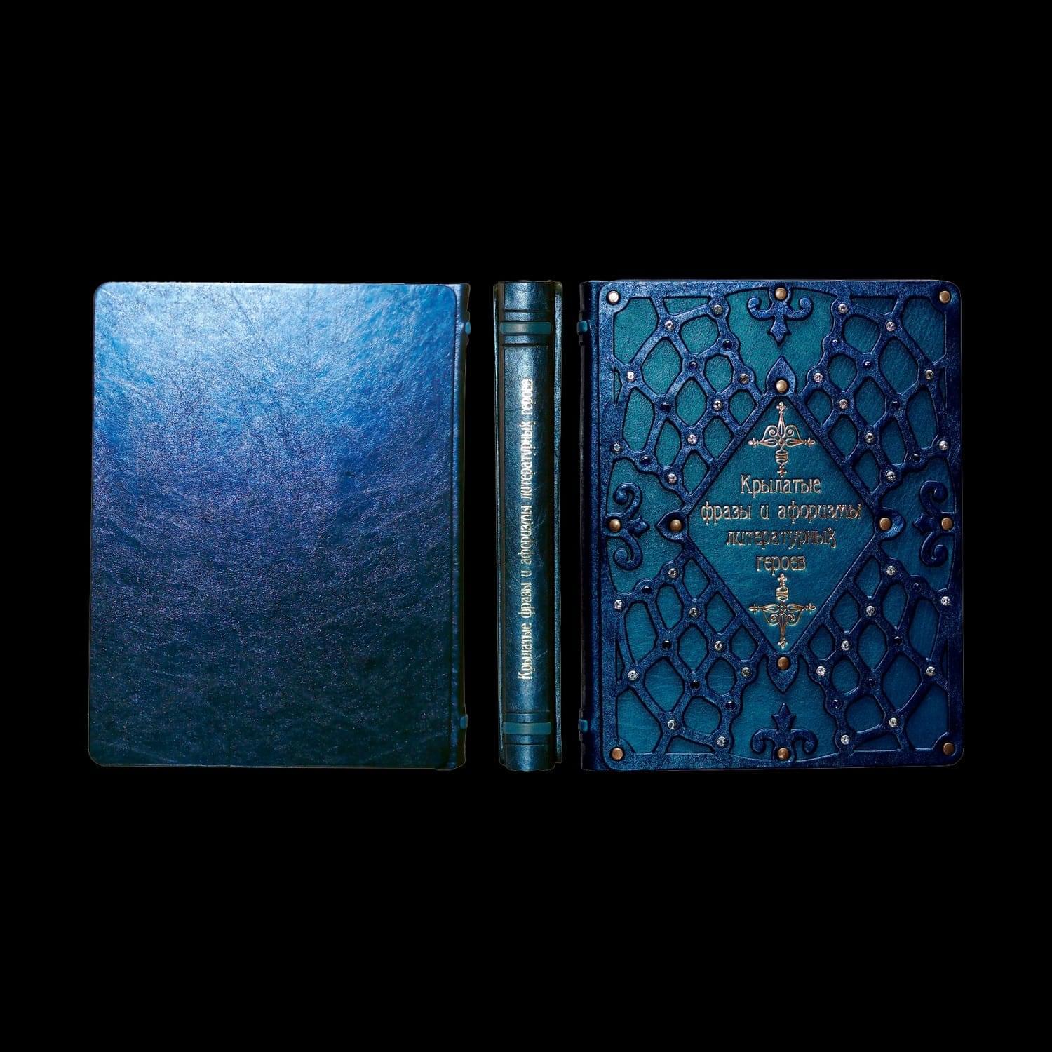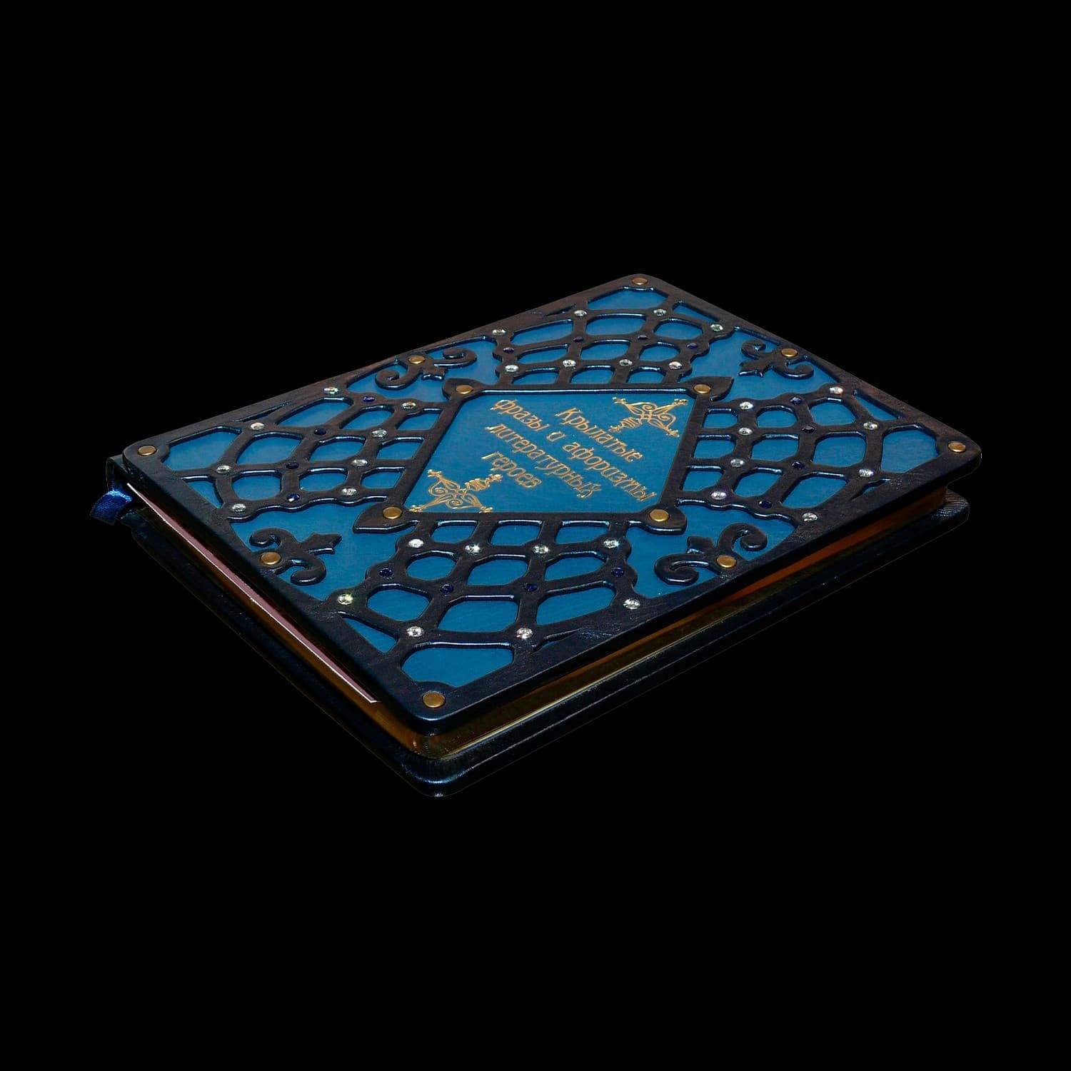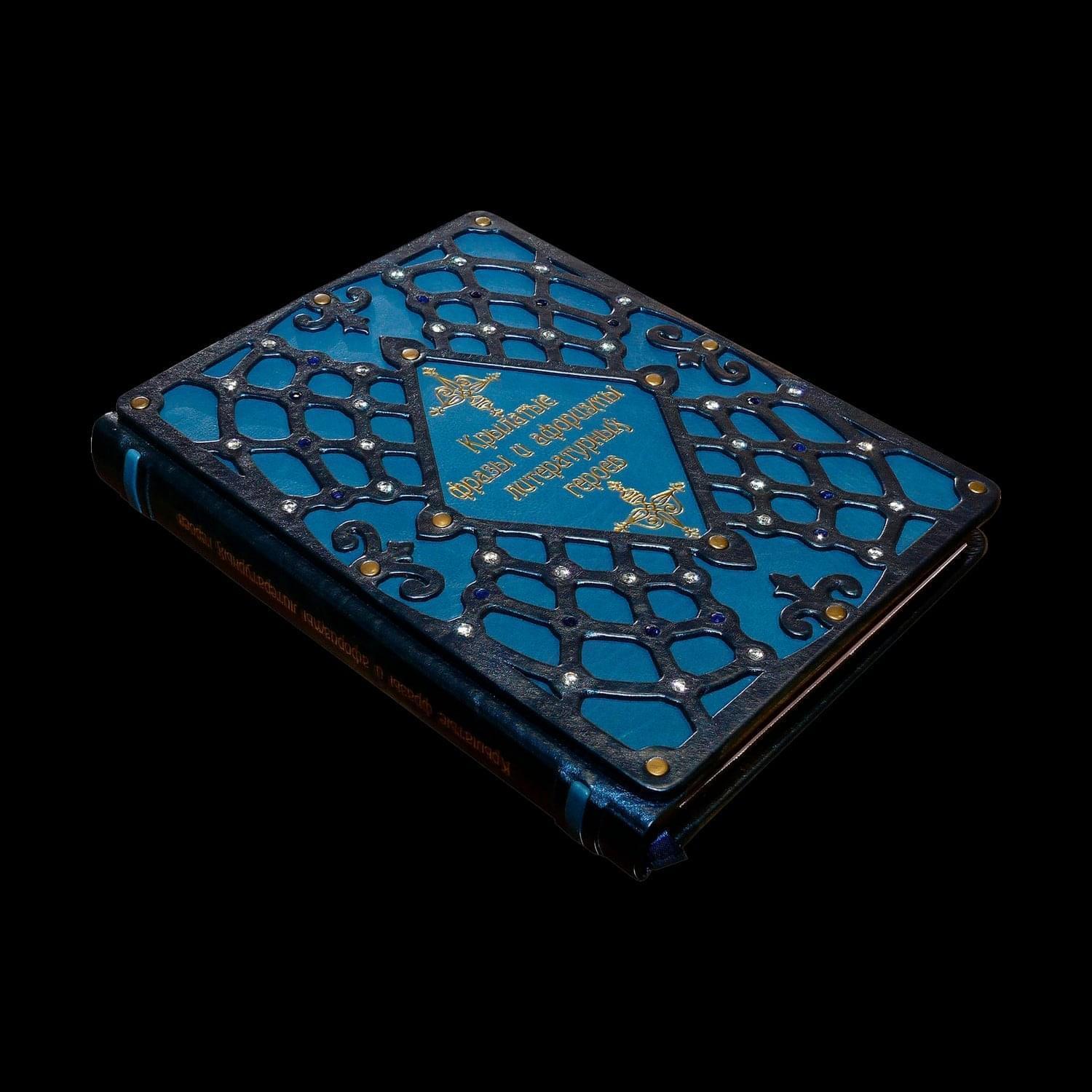 В предлагаемой книге представлено около 1500 лучших афоризмов (высказываний литературных героев), выбранных из произведений Д.И. Фонвизина, А.С. Грибоедова, А.С. Пушкина, М.Ю. Лермонтова, Н.В. Гоголя, А.Н. Островского, И.С. Тургенева, Ф.М. Достоевского, М.Е. Салтыкова-Щедрина, Л.Н. Толстого, А.П. Чехова, М.А. Булгакова, И. Ильфа и Е. Петрова. Издание, несомненно, будет полезно учащимся и преподавателям, политикам и бизнесменам, всем, кому свойственно думать и рассуждать, искать ответы на "вечные вопросы", а также просто любителям российской словесности. Составной переплет «Брадель», ручной работы, изготовлен из комбинации натуральных кож (кожа «Blu Metallizzato», кожа теленка «Turchese» производства итальянской кожевенной фабрики «Carisma»). Обложка книги оформлена объемными узорами ручного затягивания в кожу, с инкрустацией камнями циркон брильянтовой огранки высшего сорта (производство компании «Signity»), диаметром 5 мм (количество 48 шт.), латунными холитенами «Антик», количеством 12 шт. Обрез блока вручную полирован и позолочен. Сертификат. Бархатный чехол. Формат – 205х290х30 мм. Количество страниц – 304 (мелованная бумага) Вес – 1,29 кг. .