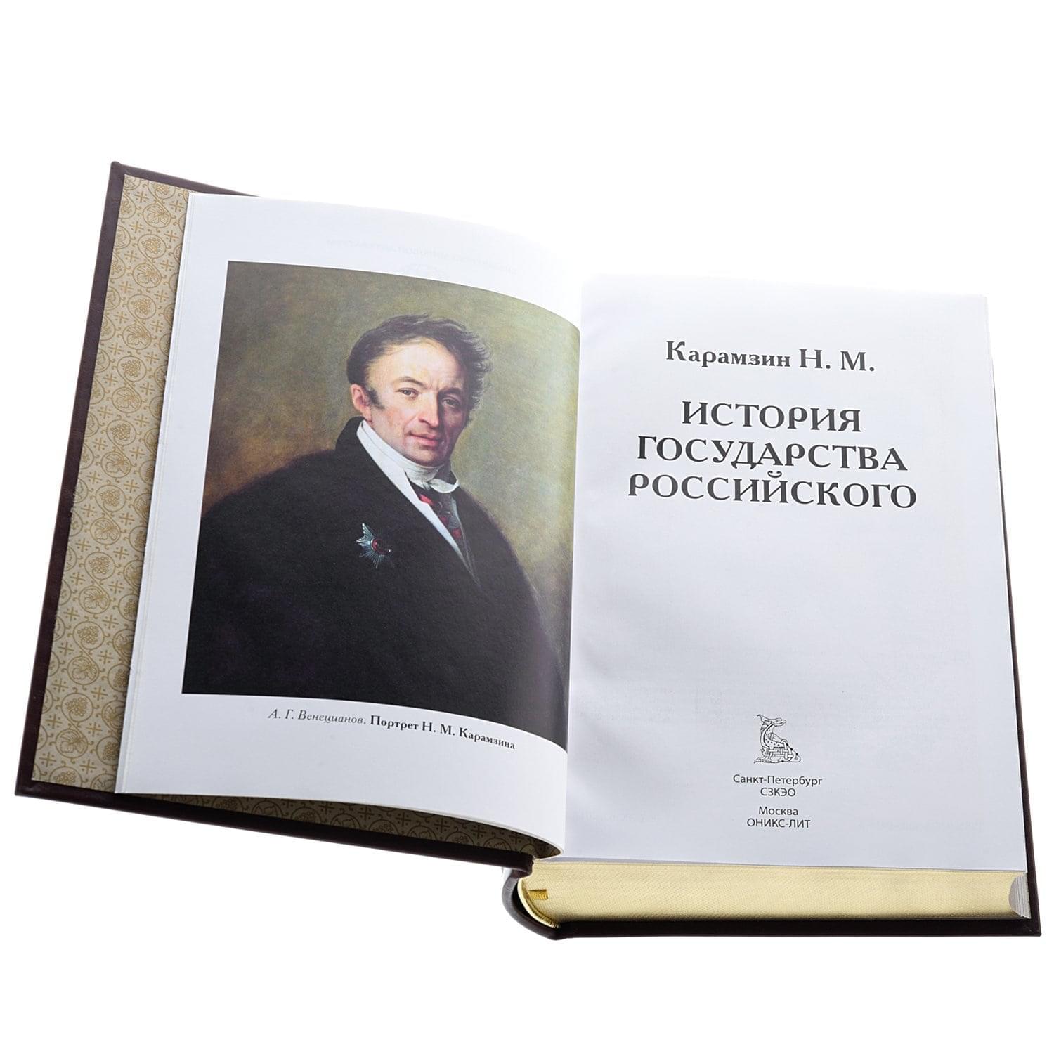 С гербом России на лицевой стороне кожаного переплета книга представляет собой высококлассный образец современной полиграфии. Выпущена ограниченным тиражом. Из книги русского писателя эпохи сентиментализма, историка Николая М. Карамзина Вы узнаете о развитии России с древнейших времен. Издание содержит различные сведения о народах России, а также информацию о конфликтах славян с варягами. Легендарный труд историка Карамзина напечатан на дорогостоящей мелованной бумаге и оформлен в красивый и износостойкий кожаный переплет, декорированный в традиционной технике тиснения по коже с использованием позолоты. Корешок имеет декоративные элементы бинты. Торшированный обрез защищает страницы от повреждений и пыли. .