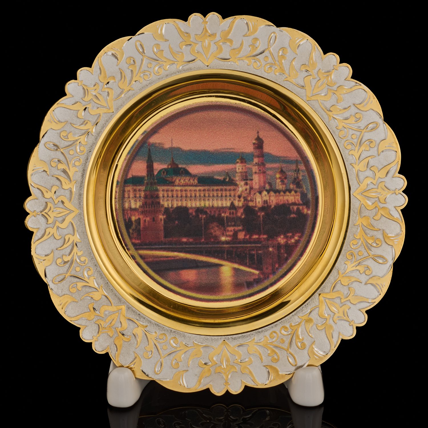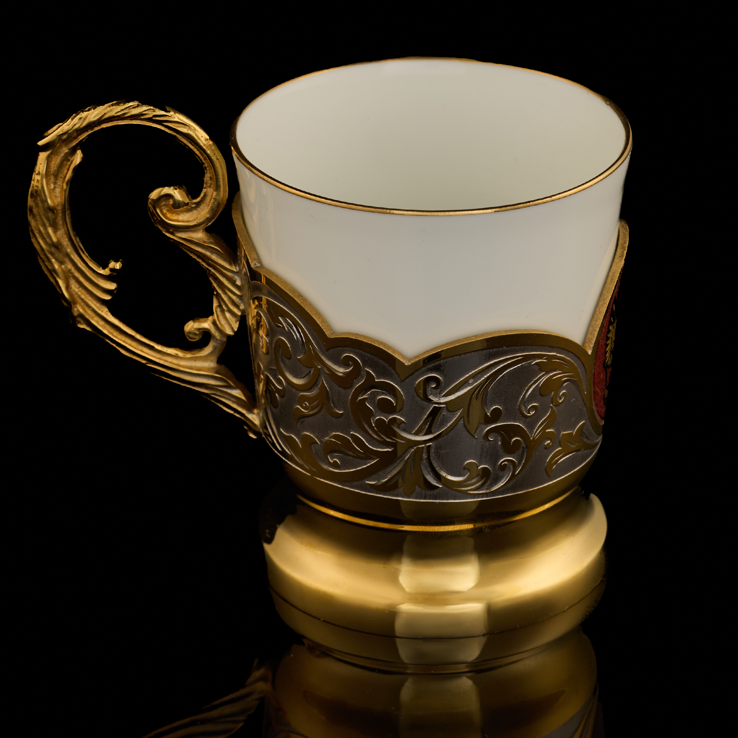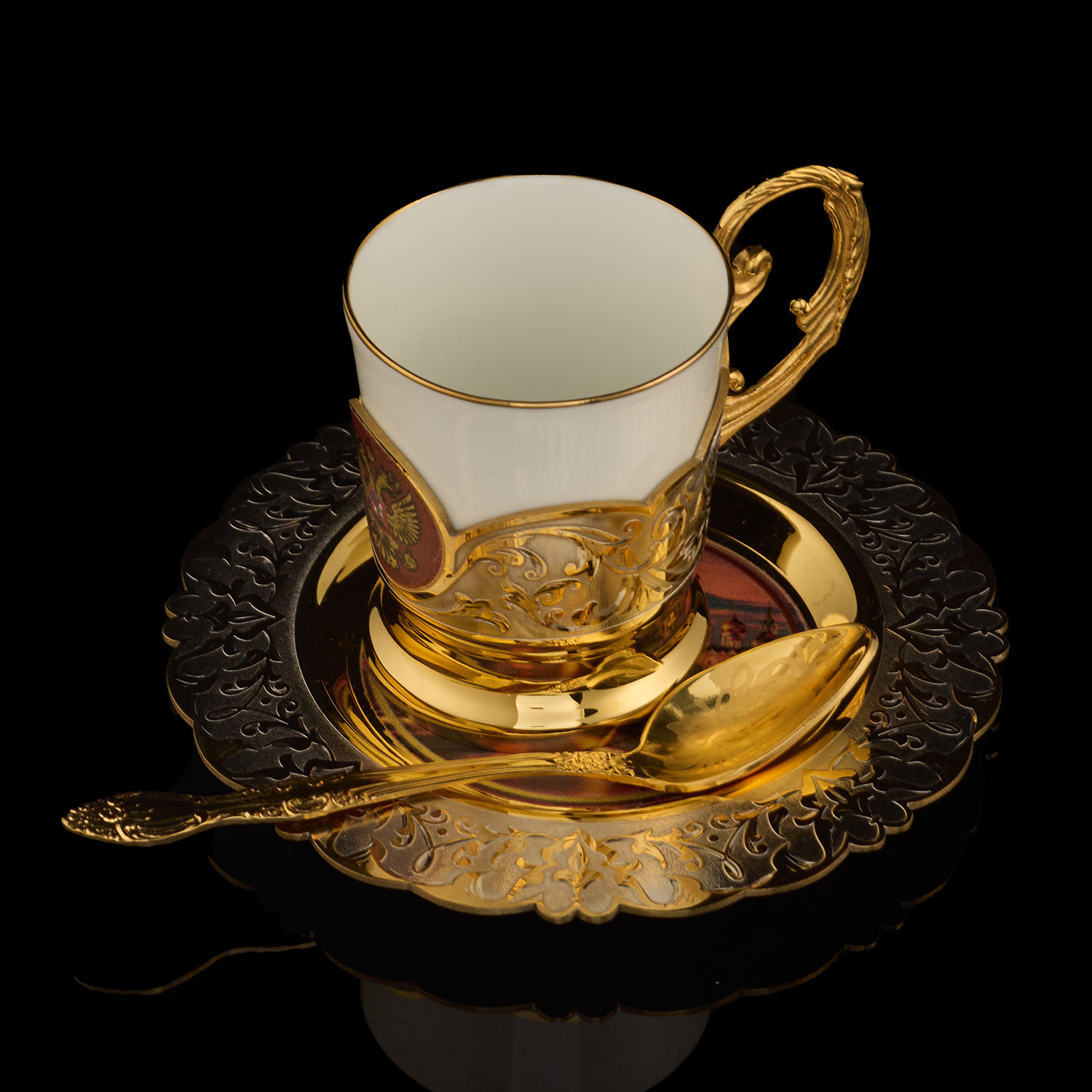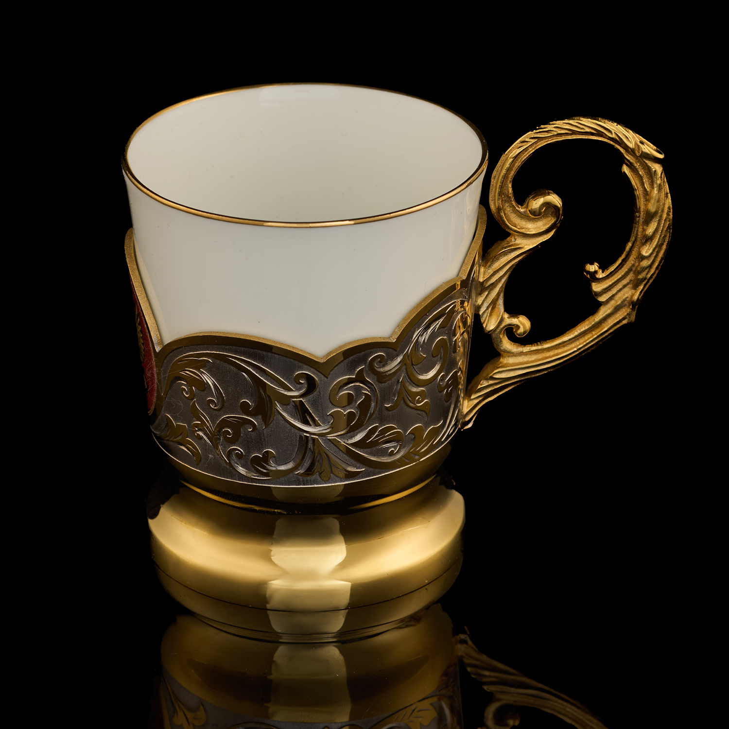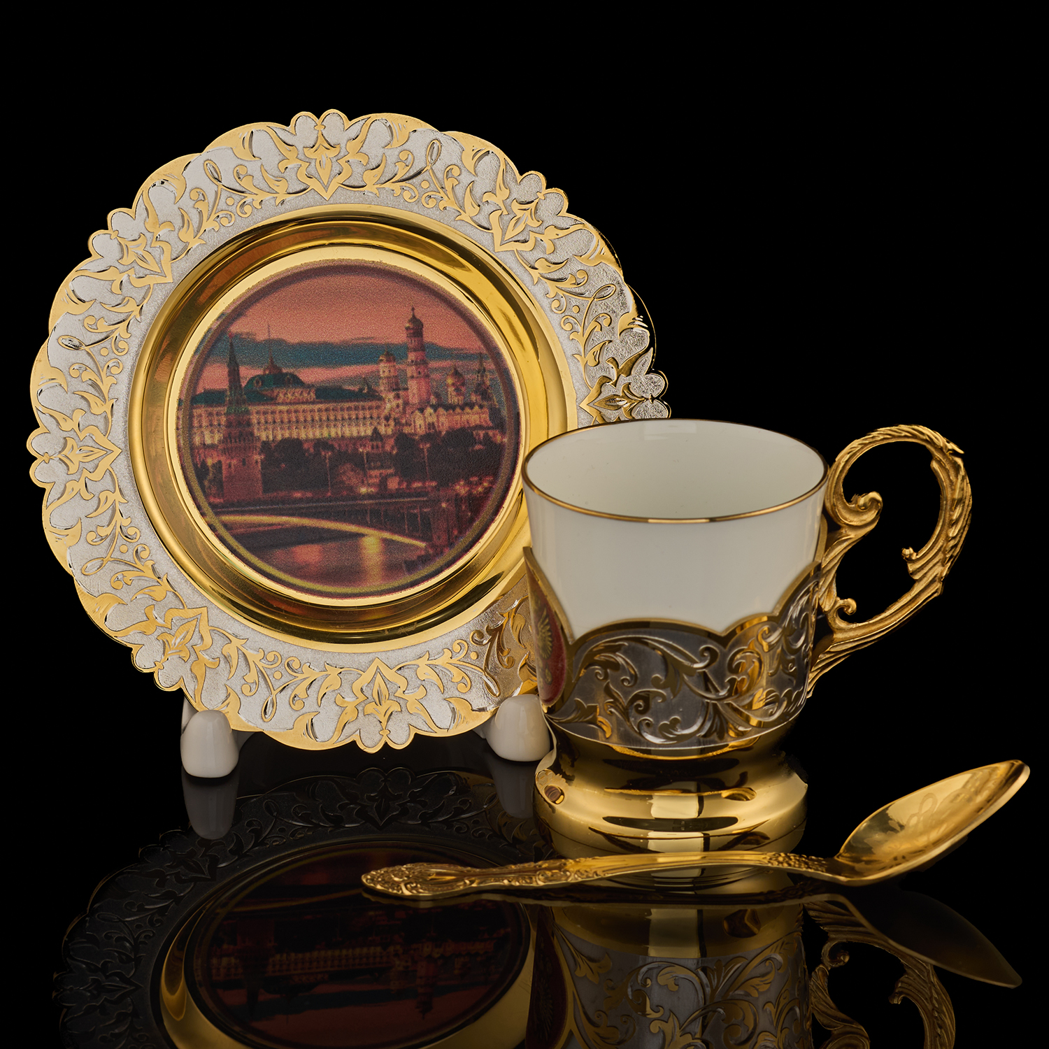 Кофейная пара "Москва". Златоуст.Материалы: латунь, никель, золото 999,9*, эмаль, костяной фарфор.