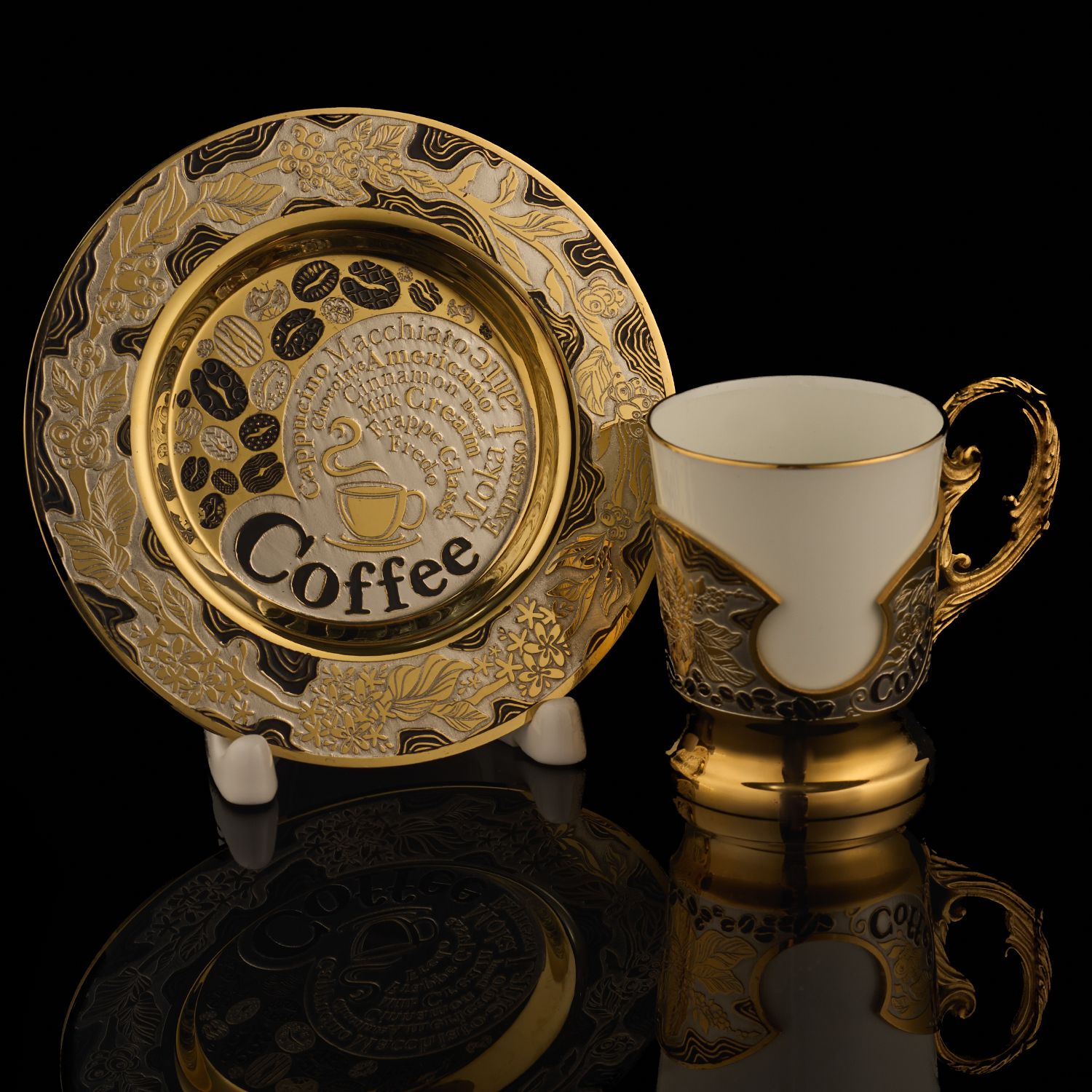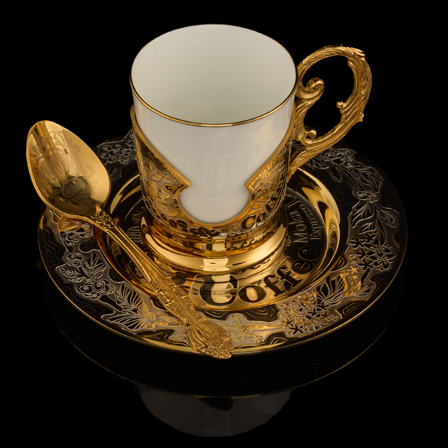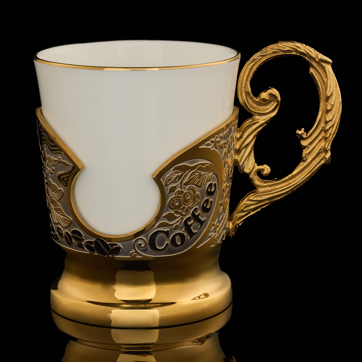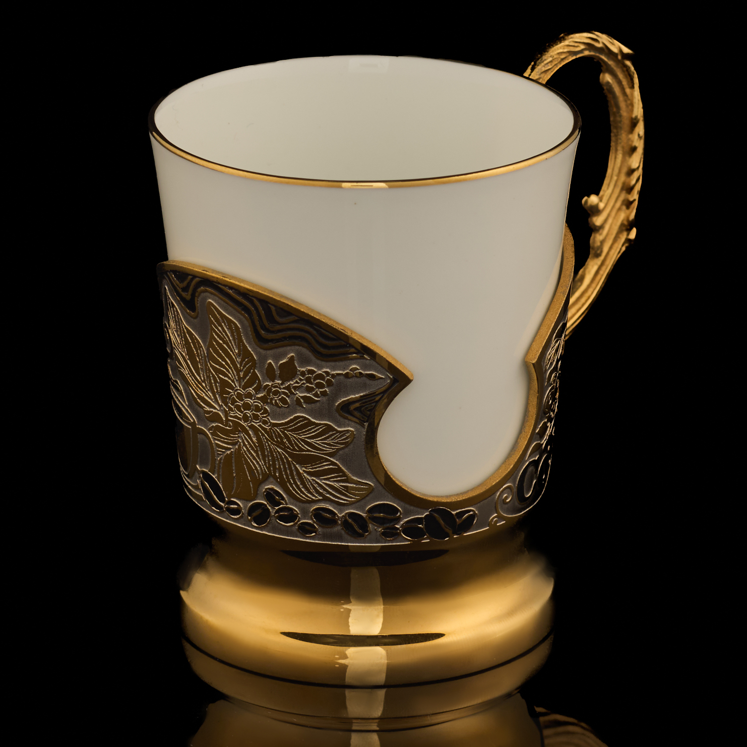 Кофейная пара "Кофе". Златоуст.Материалы: латунь, никель, золото 999,9*, эмаль, костяной фарфор.