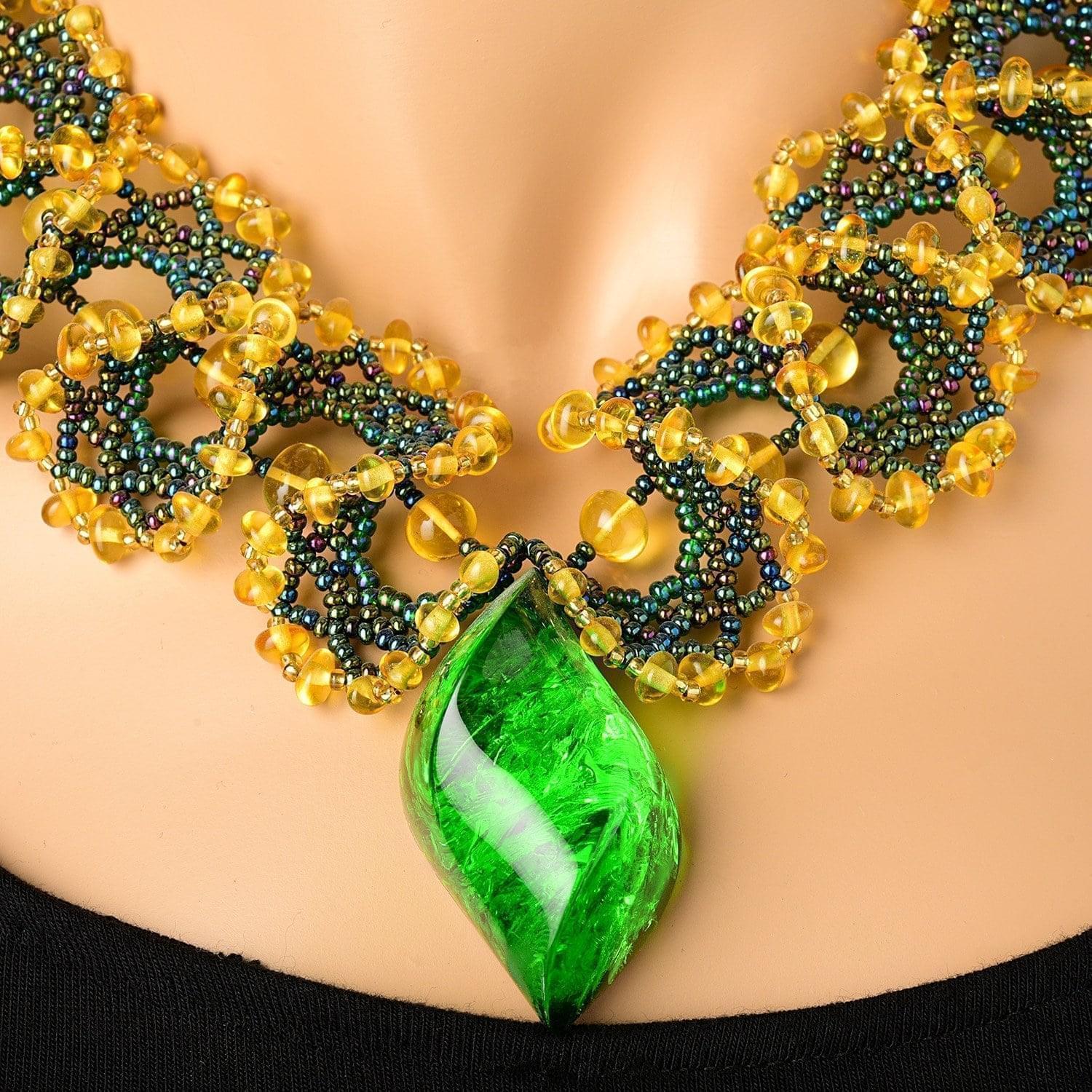Уникальное дизайнерское украшение для ношения нательно. Визуально удлиняет овал лица и привлекает внимание к открытому декольте, подчеркивая оттенок кожи и волос. Колье отличается сочетанием изумрудных оттенков с оттенком охры, которое делает его универсальным украшением, подходящим к одежде любой расцветки. Основная лента колье изготовлена в авторской технике бисероплетения и представляет собой широкую ленту, соединяющуюся у заостренного кулона из камня буранита... ....Извините, товар отсутствует