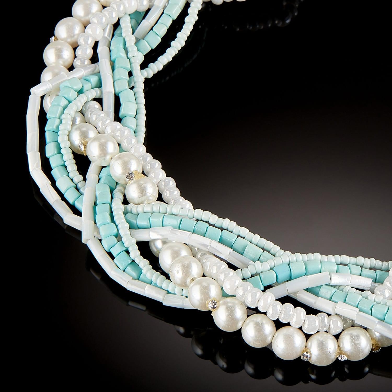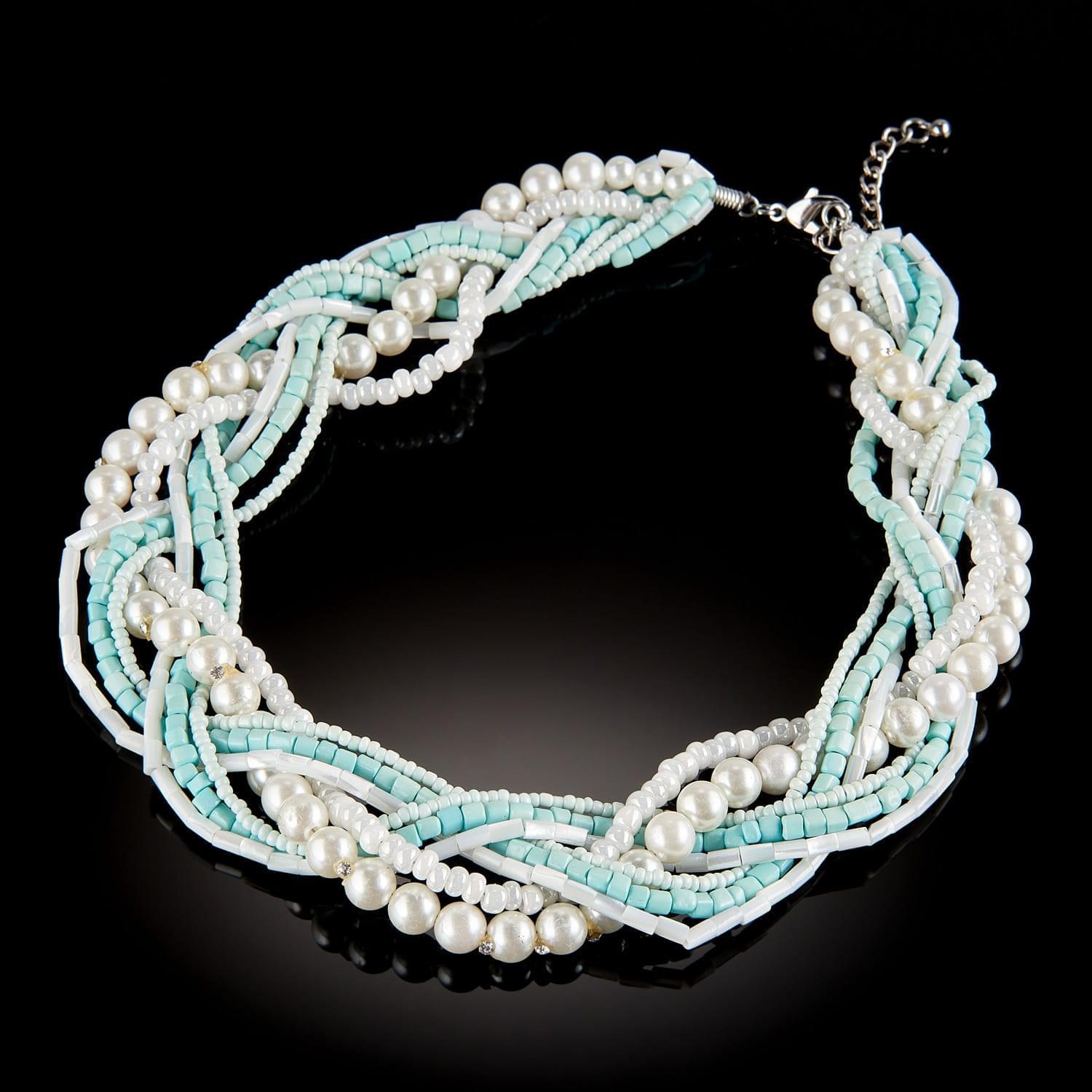 Фантазийное колье из множества нитей бисера жемчужного оттенка с кристаллами, переплетенных друг с другом. Оригинальная идея позволила соединить элементы разных размеров - бусины и бисер - и создать элегантную модель летнего колье специально для поклонницы классического стиля и стиля кэжл. ..