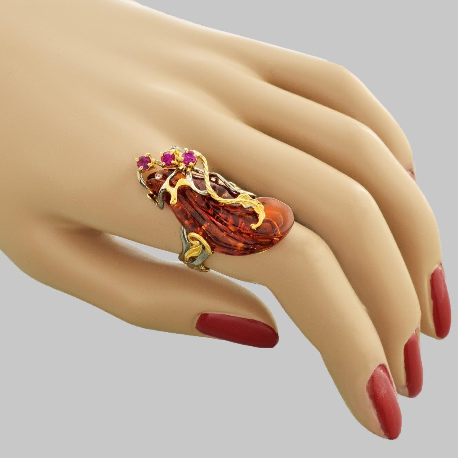Дизайнерское колечко модели перстень со вставкой из медового янтаря и фианитами в оттенке лаванды согревает в холод и дарит прохладу в жару. О чудесных свойствах драгоценного природного минерала янтаря известно с древности. С его помощью лечили головную боль, использовали его для улучшения общего самочувствия. О янтаре как о камне-талисмане и обереге мечтали фараоны и императоры, предлагая за 1 камень одного раба. Сама природа создаёт янтарь в течение 40-150 тысяч лет...