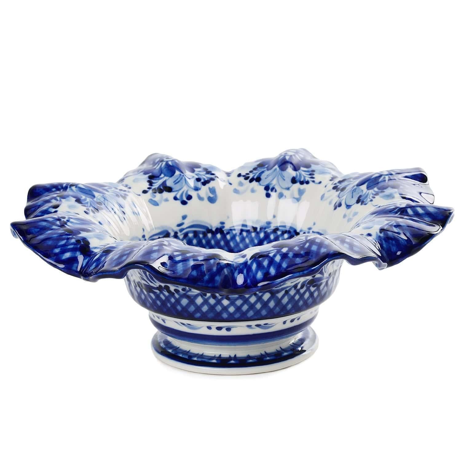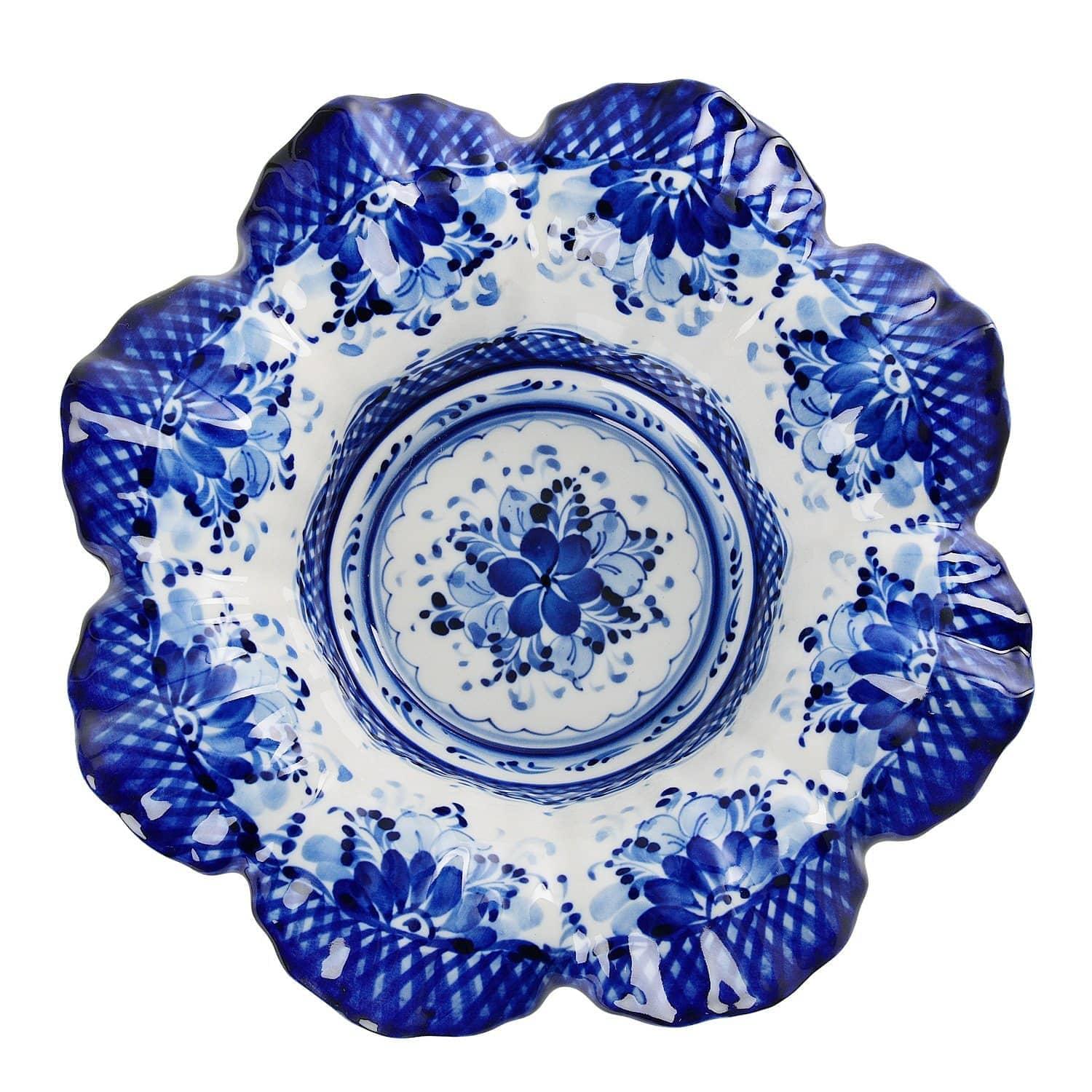 Получить утром в подарок вкусные конфеты в оригинальной конфетнице не отказалась бы ни одна представительница прекрасного пола. Русский народный промысел называется Гжель от села в Московской области, где он зародился. Там с 17 века добывалась качественная глина. В 1663 году царь Алексей Михайлович издал указ о ее добыче для изготовления медицинских сосудов. С 18 века здесь делали посуду, кирпич, детские игрушки, кувшины, майоликовую пластику, расписные печные и каминные изразцы. Расписывали изделия синими, зелеными, желтыми цветами в коричневых контурах, фигурками животных или людей. Ручки кувшинов напоминали веточки, носики - птичьи головы по форме. В 1802 году возле села Минино нашли светлую глину, и появился полуфаянс. С 1820-х годов гжельскую роспись характеризовал синий узор. Узор создал мастер гжельского фарфора, художник Сергей Алехин, фирменный стиль которого узнаваем по голубой «волне» по краю изделия, придающей особое эстетическое очарование каждому изделию. ....Извините, товар отсутствует