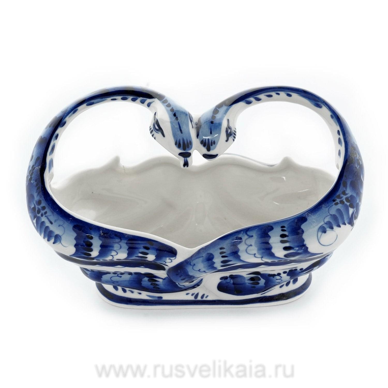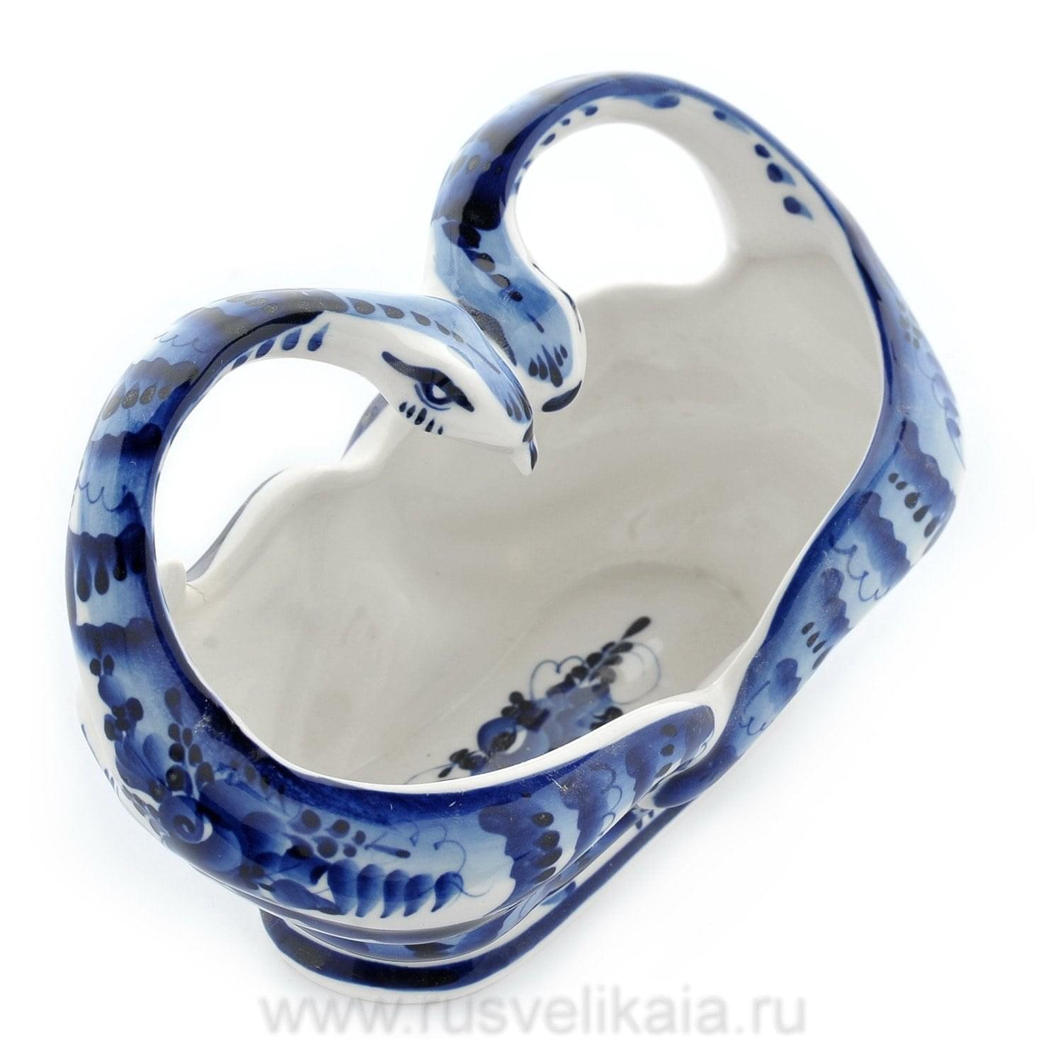 Пара змей примкнули друг к другу щёчками и словно позируют нашему фотографу, образуя своими телами чашу для конфет. Прелесть этого авторского предмета домашней утвари в том, что он, во-первых, создает  радостный акцент в интерьере; во-вторых, - изготовлен из русского "белого золота",  фарфора на основе высококачественной подмосковной глины и расписан от руки окисью кобальта,  излюбленной краской гжельских художников, которая после обжигов в печи при сверхвысоких температурах приобретает синий цвет с более чем 40 его оттенками. В-третьих, оригинальный авторский  дизайн этого изделия достоин всяческих похвал!