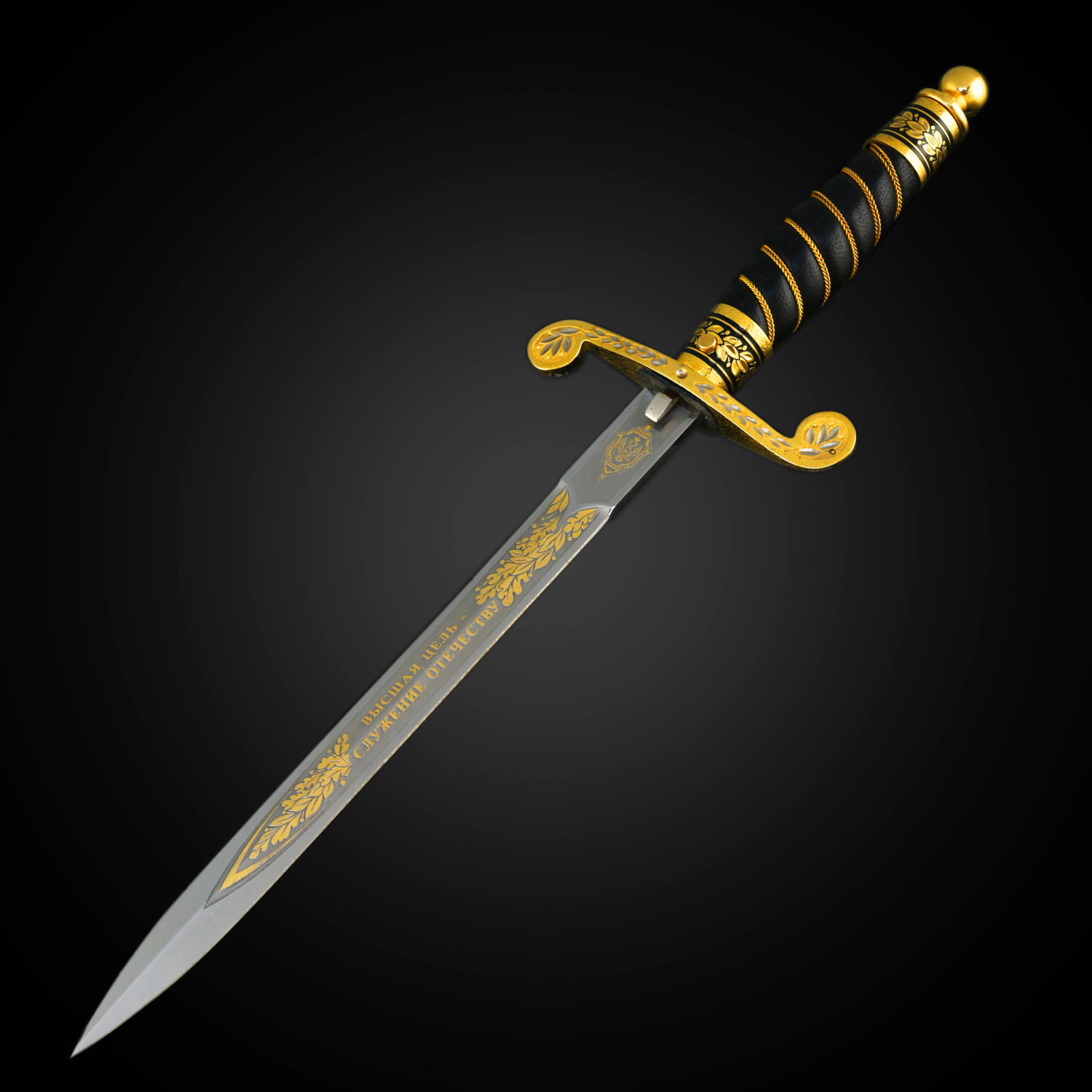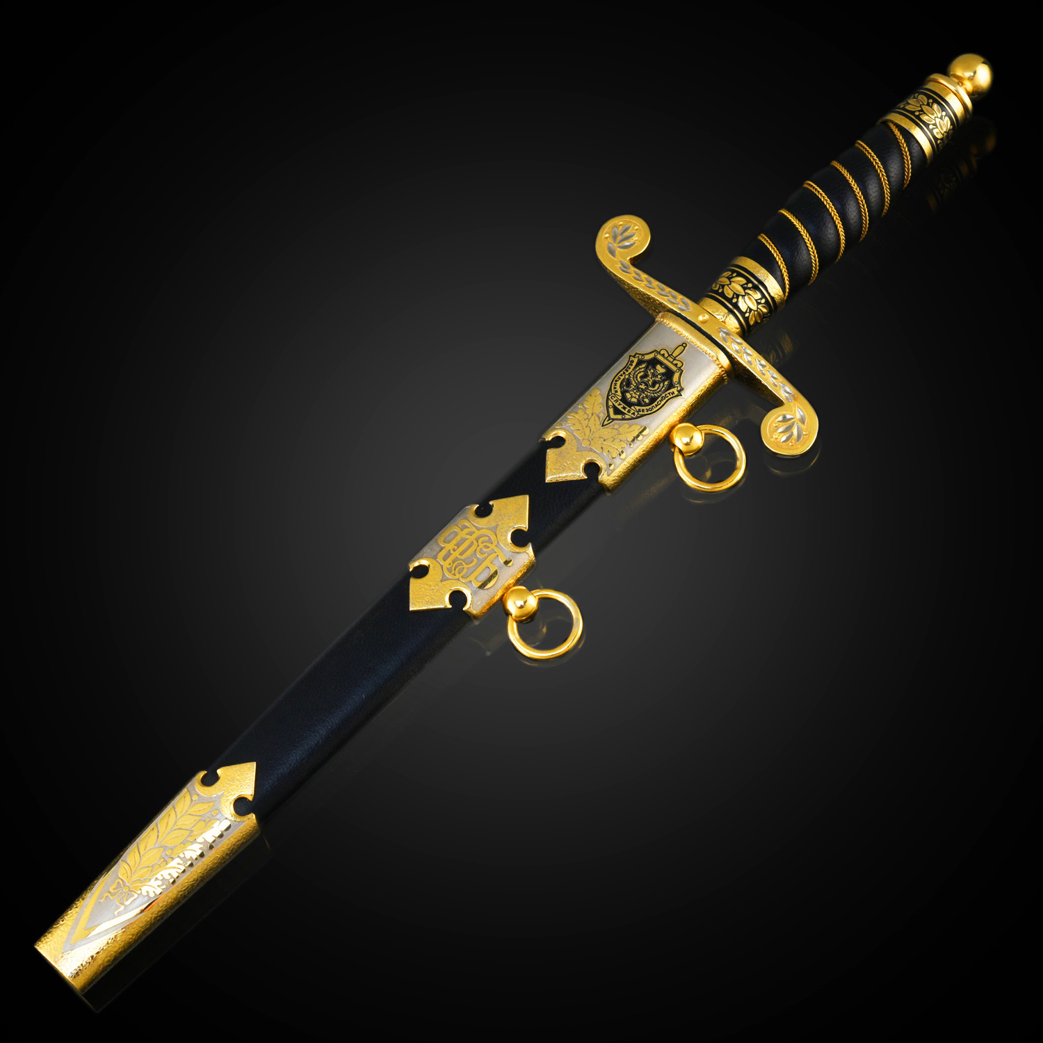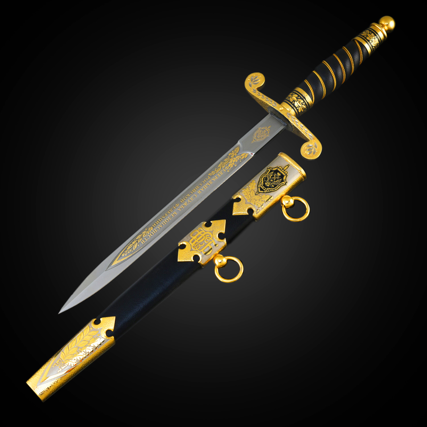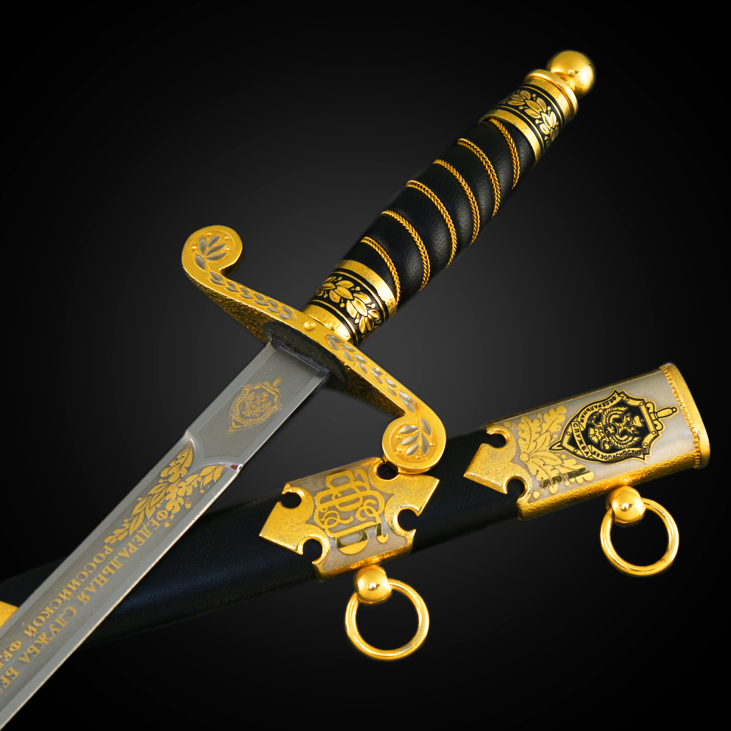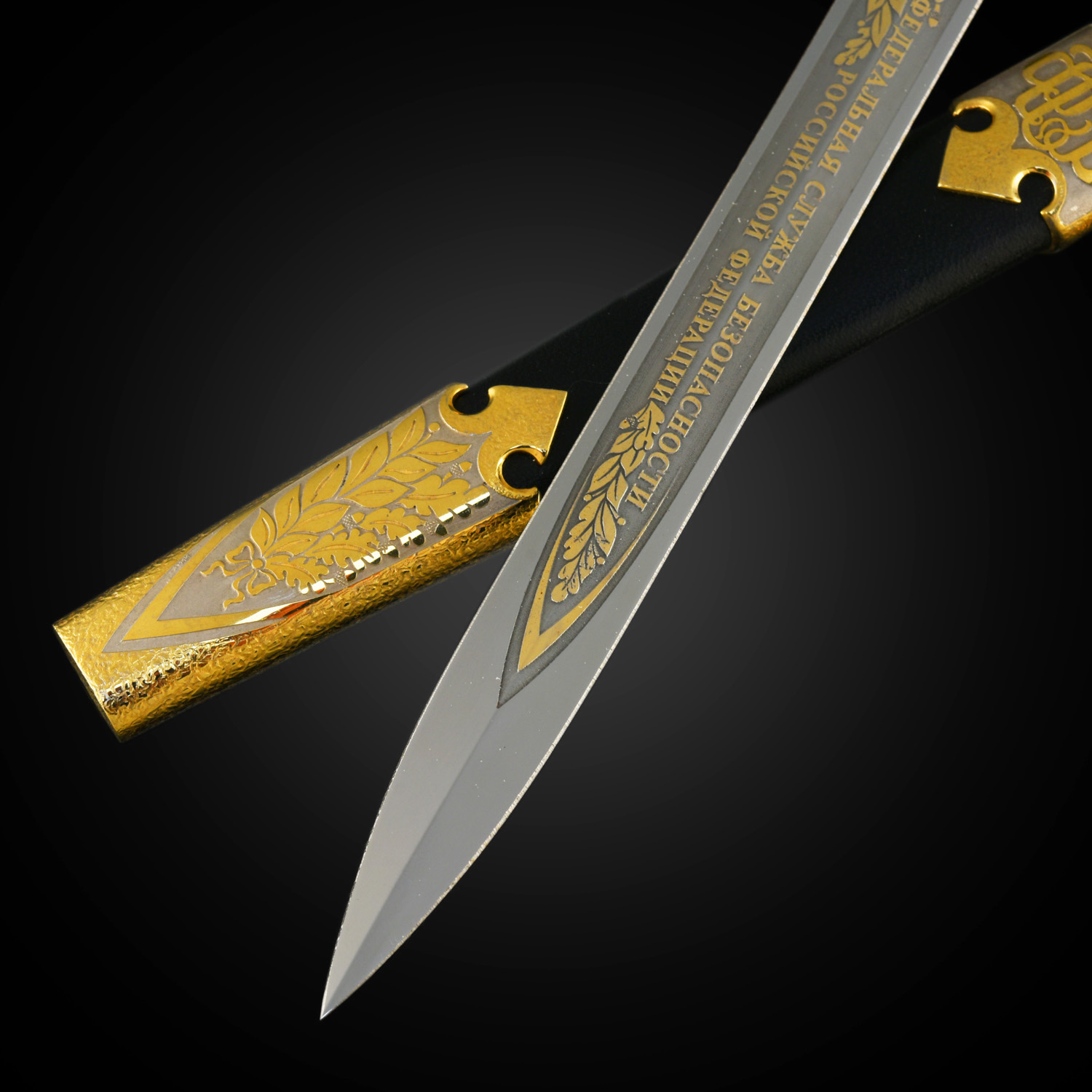 Кортик сувенирный "ФСБ". Златоуст.Материалы: сталь ЭИ-107 (40Х10С2М), латунь, никель, золото 999,9*, эмаль, кожа.