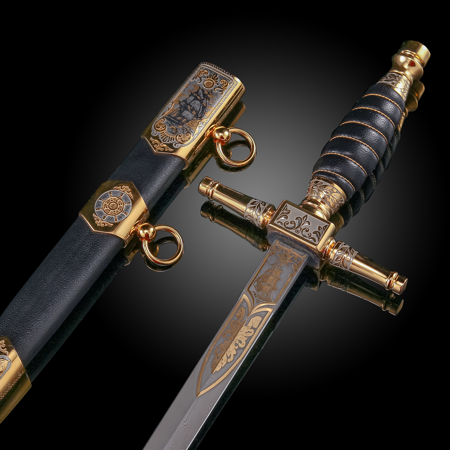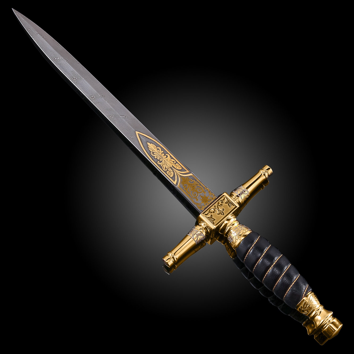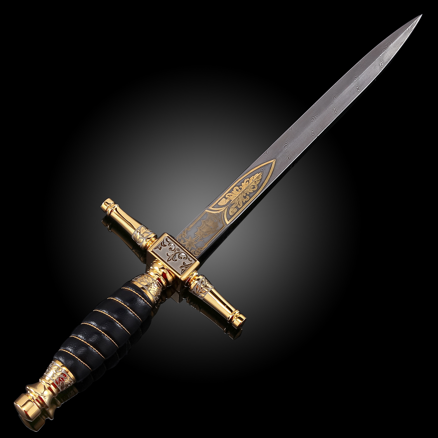 Материалы: дамасская сталь, латунь, никель, золото 999,9*, кожа.