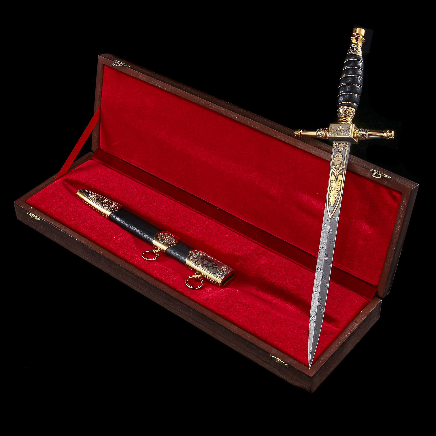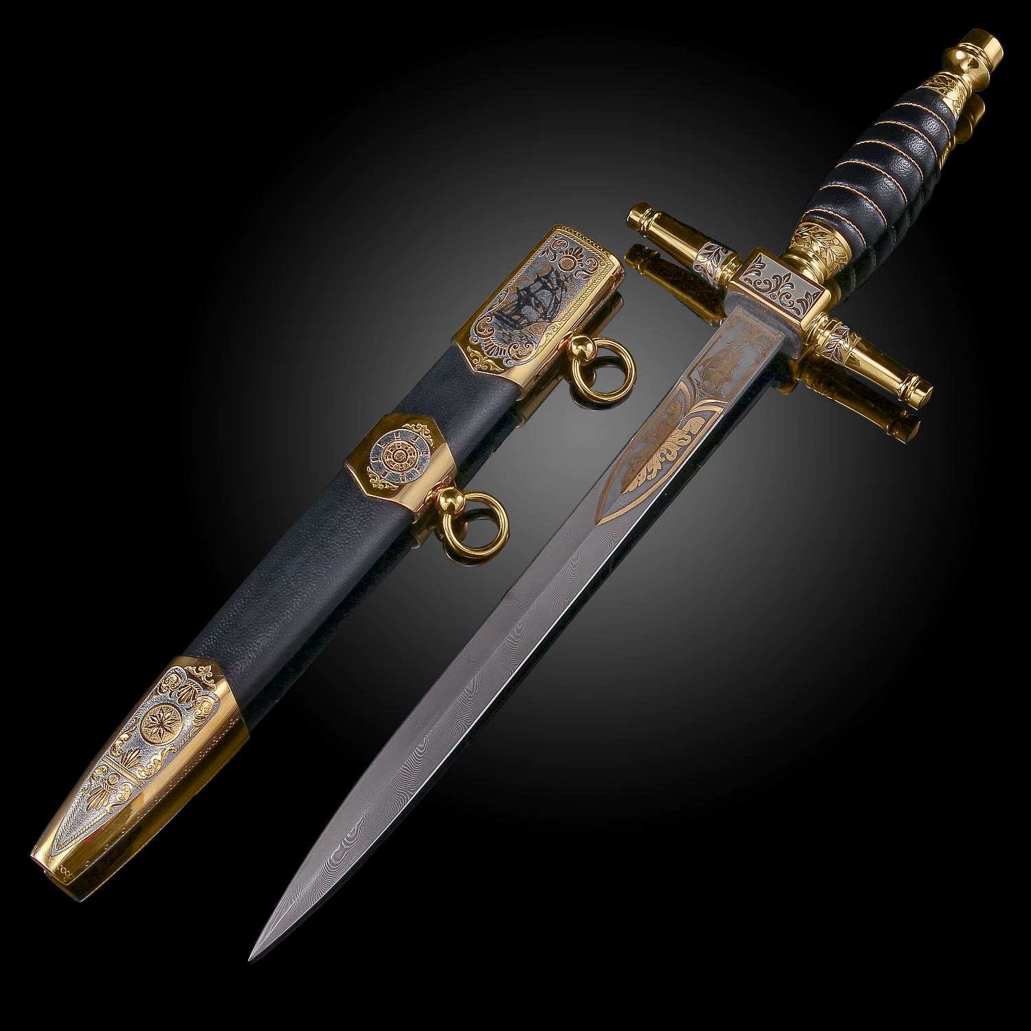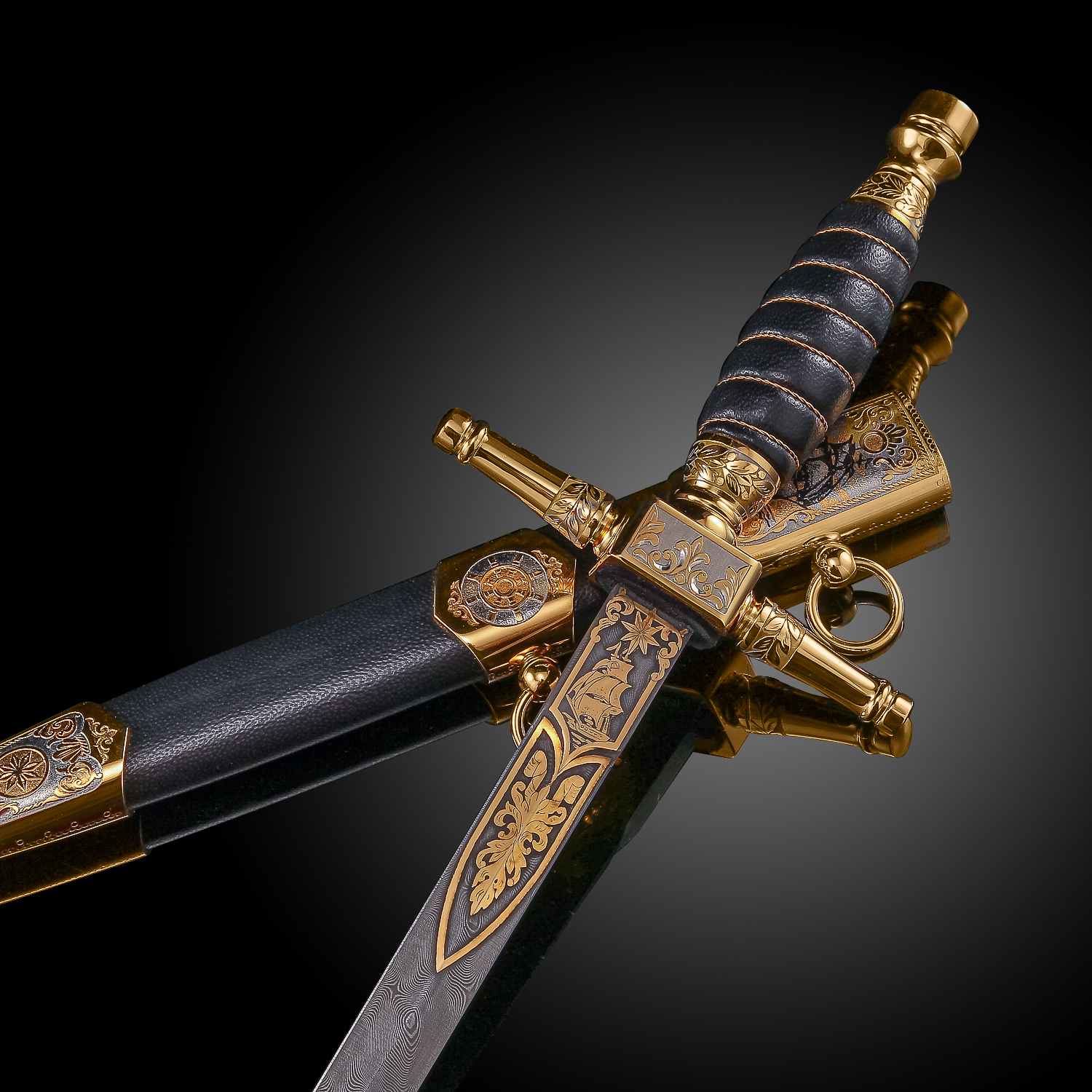 Материалы: дамасская сталь, латунь, никель, золото 999,9*, кожа.