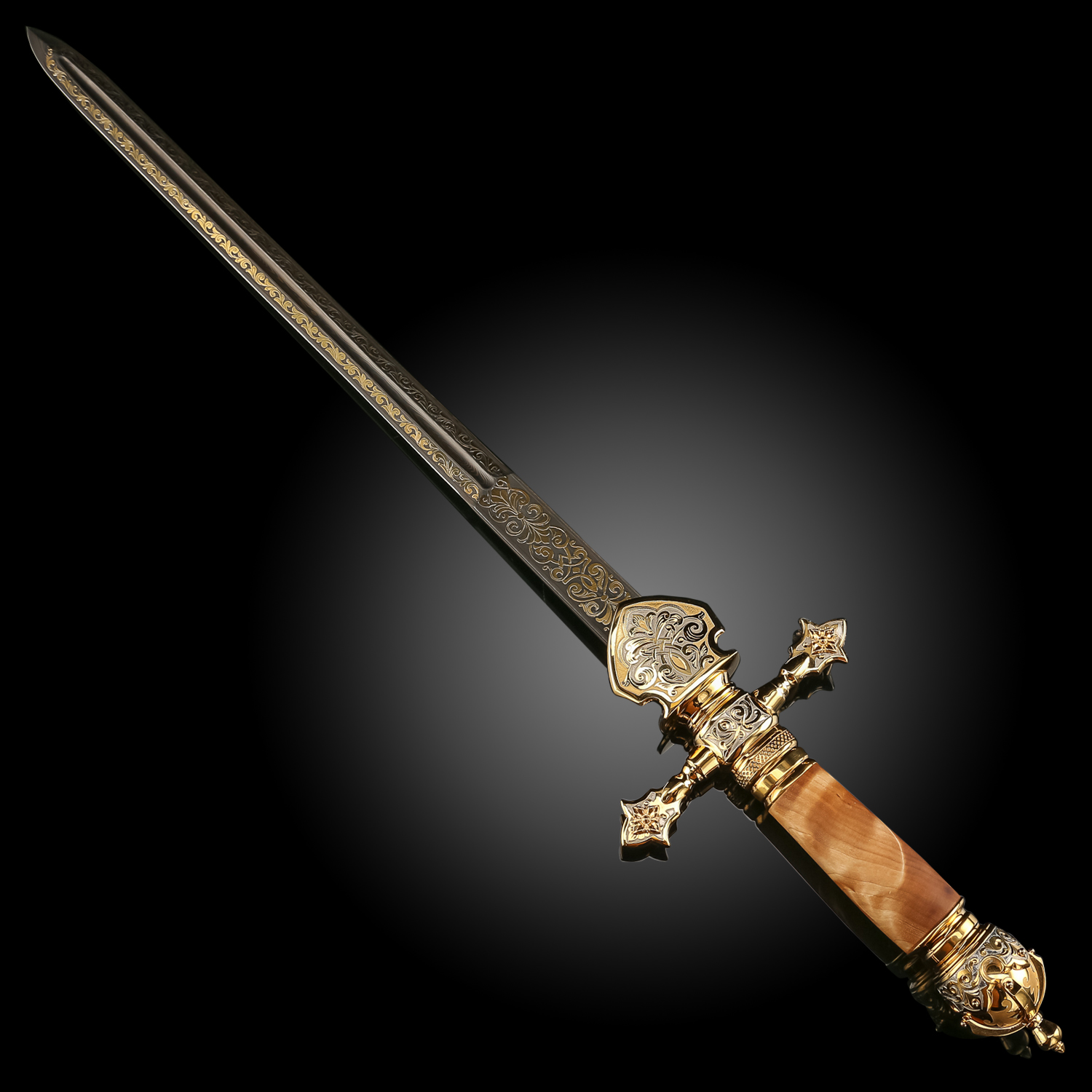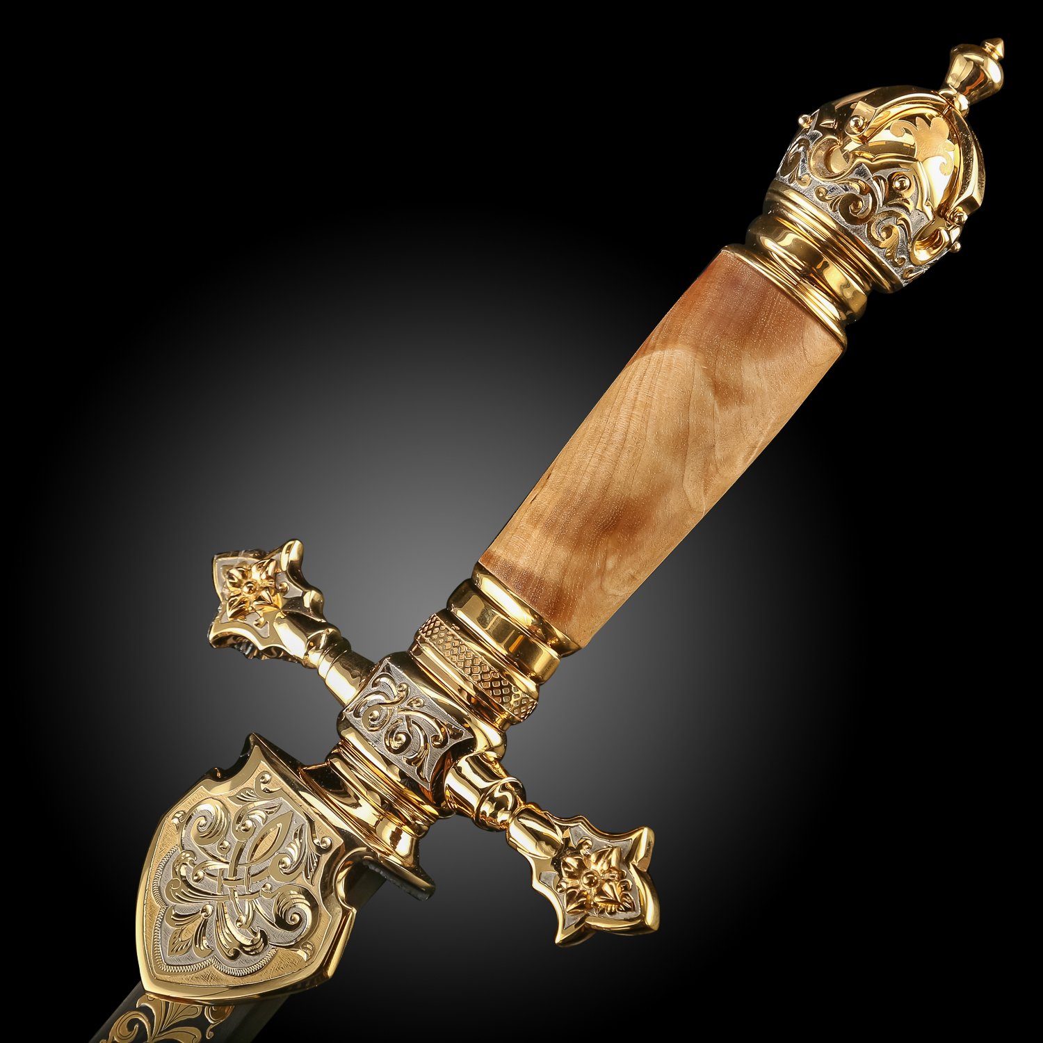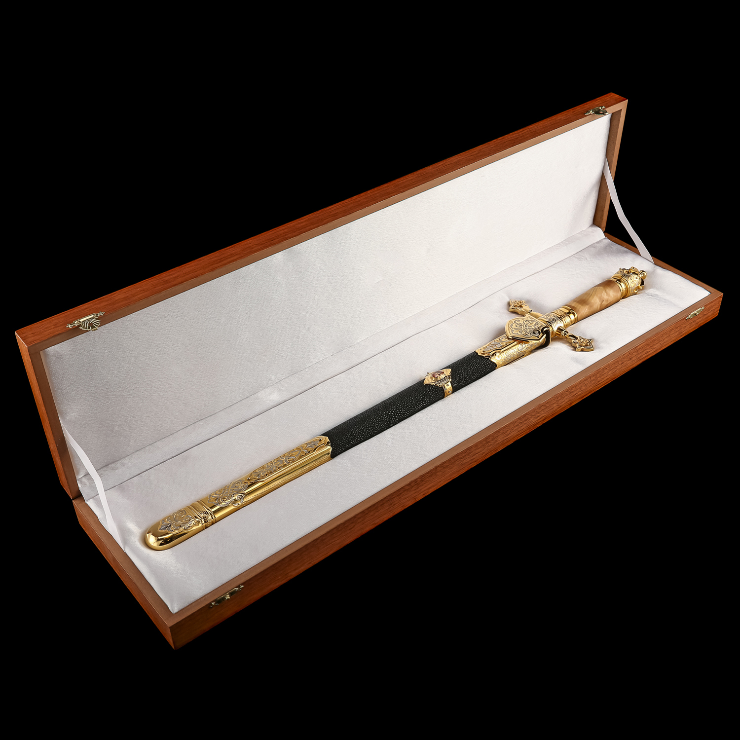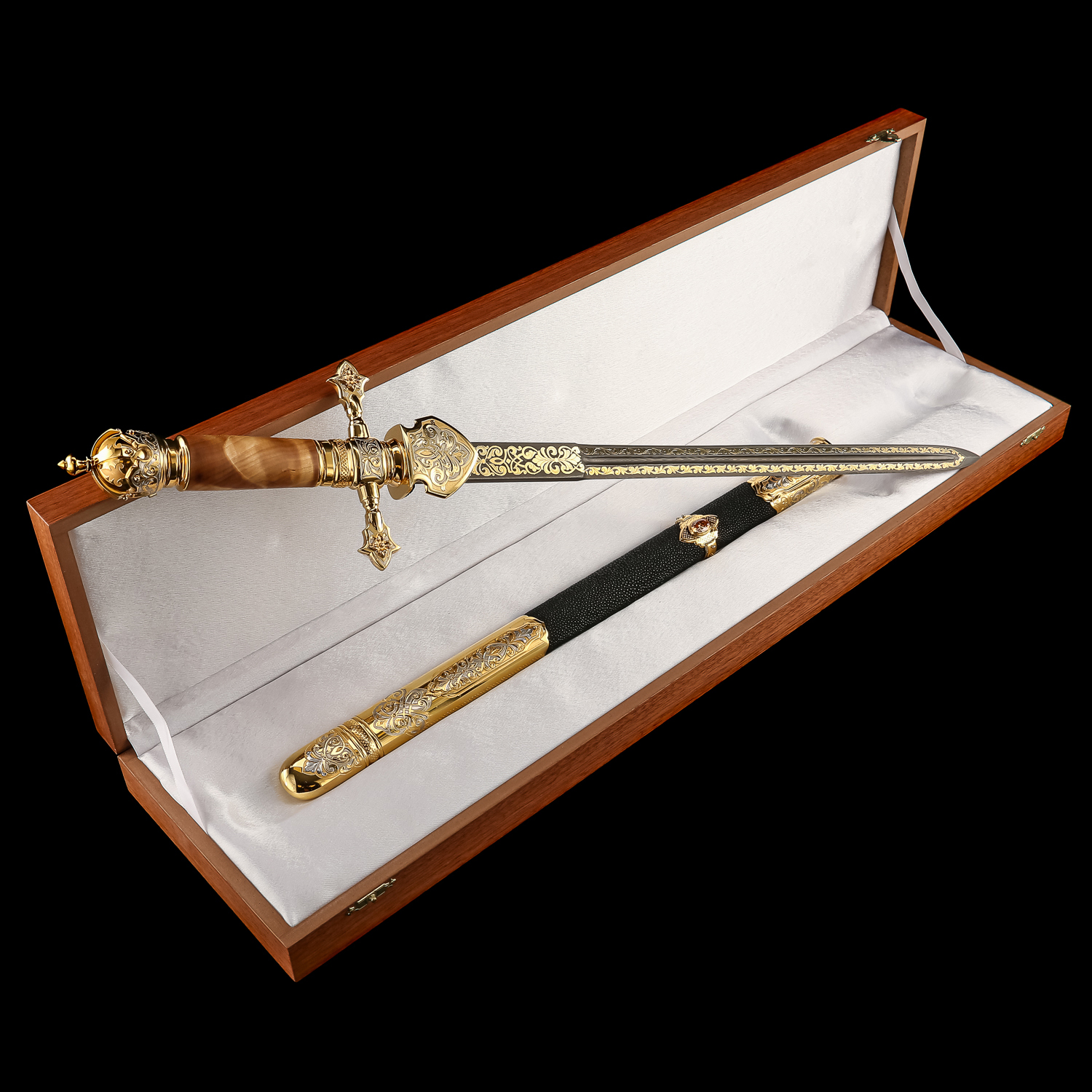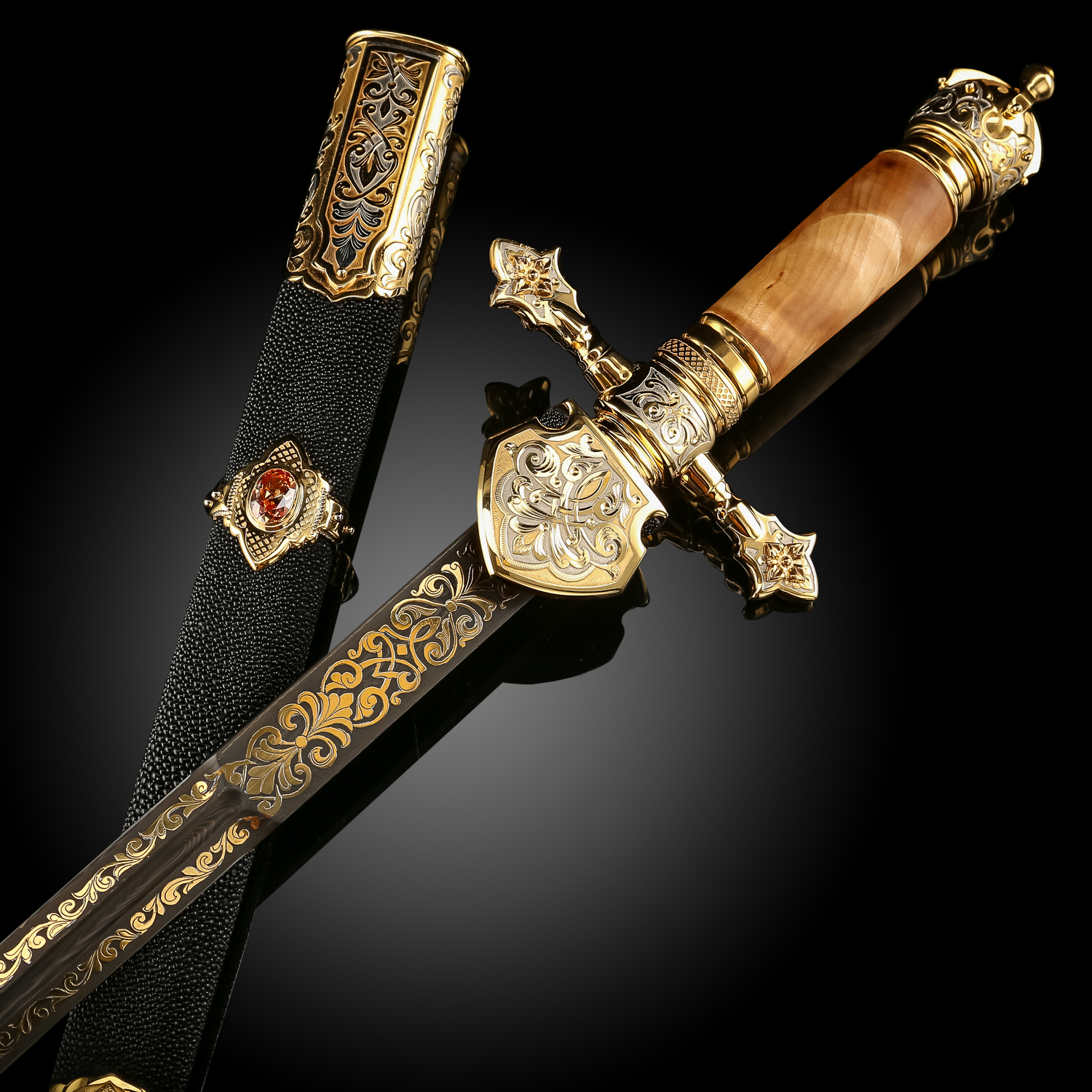Кортик сувенирный "Царская охота". Златоуст.Материалы: дамасская сталь, дерево, кожа ската, фианиты, латунь, никель, золото 999,9*.